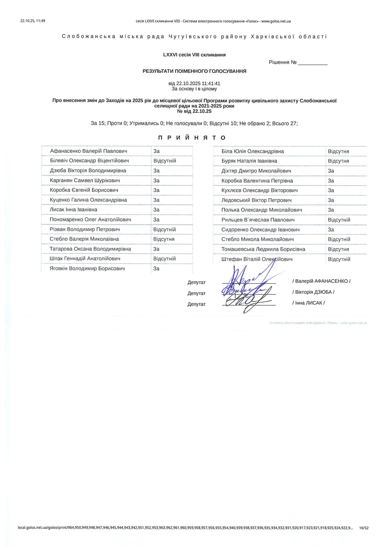 Відомості голосування до рішення сесії №3245 Про внесення змін до Заходів на 2025 рік до місцевої цільової Програми розвитку цивільного захисту Слобожанської селищної ради на 2021-2025 роки
