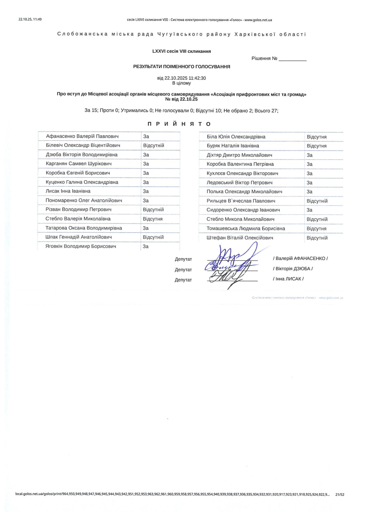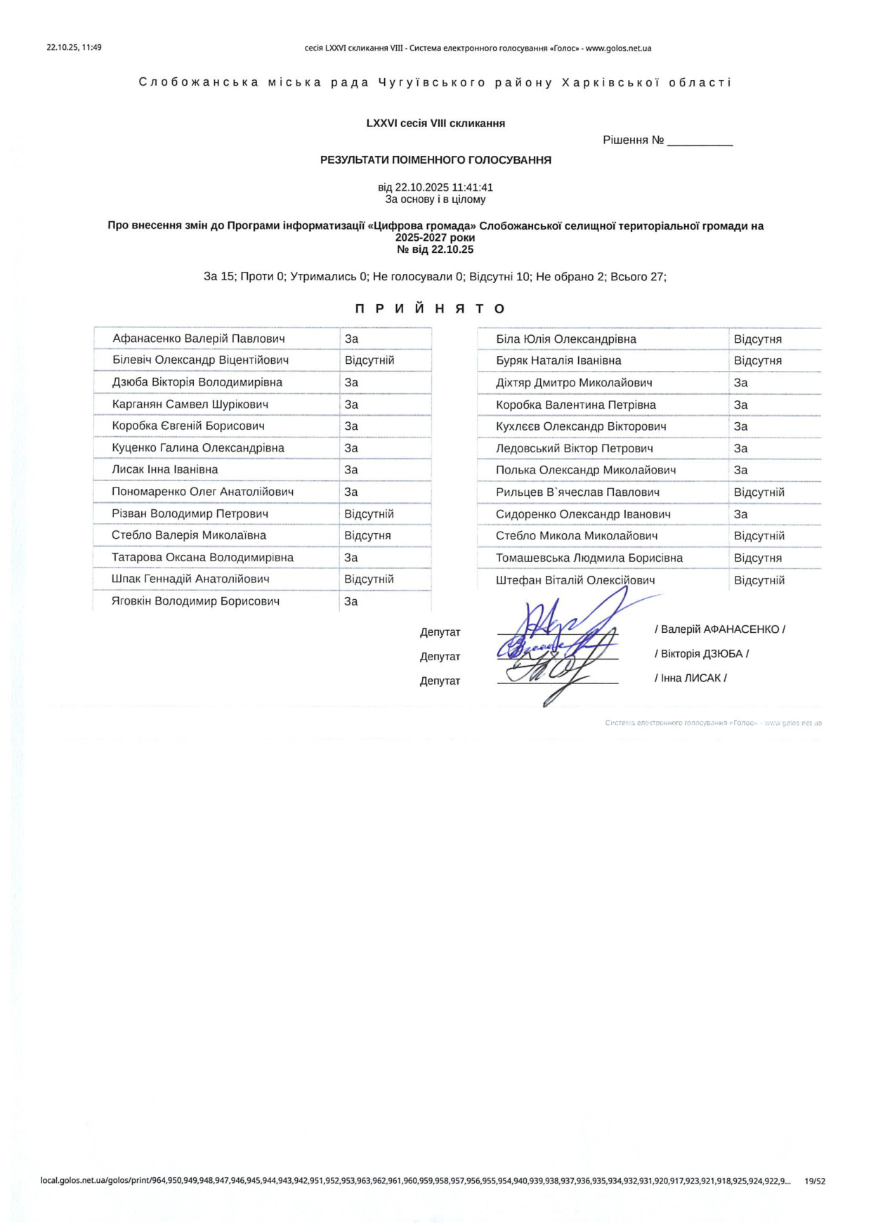 Відомості голосування до рішення сесії №3248 Про внесення змін до Програми інформатизації «Цифрова громада» Слобожанської селищної територіальної громади на 2025-2027 роки.