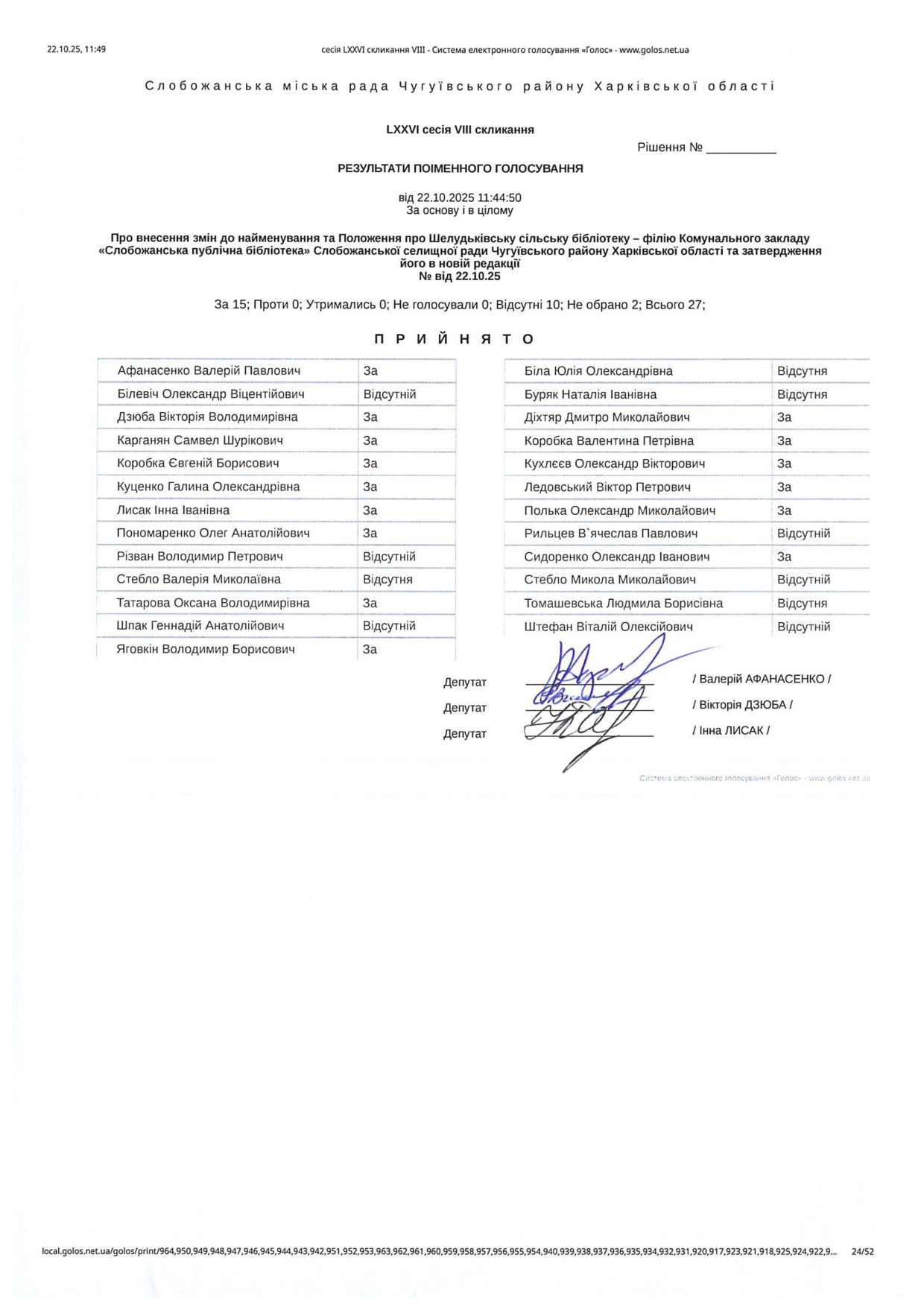 Відомості голосування до рішення сесії №3253 Про внесення змін до найменування та Положення про Шелудьківську сільську бібліотеку – філію Комунального закладу «Слобожанська публічна бібліотека» Слобожанської селищної ради Чугуївського району Харківської області та затвердження його в новій редакції.