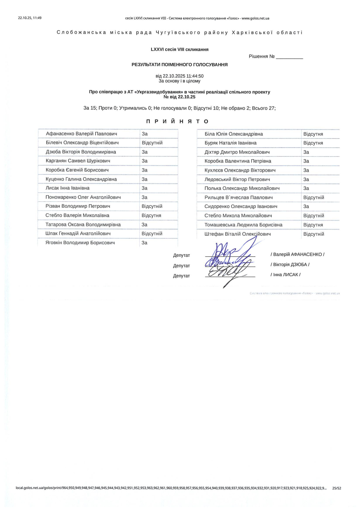 Відомості голосування до рішення сесії №3254 Про співпрацю з АТ «Укргазвидобування» в частині реалізації спільного проекту.