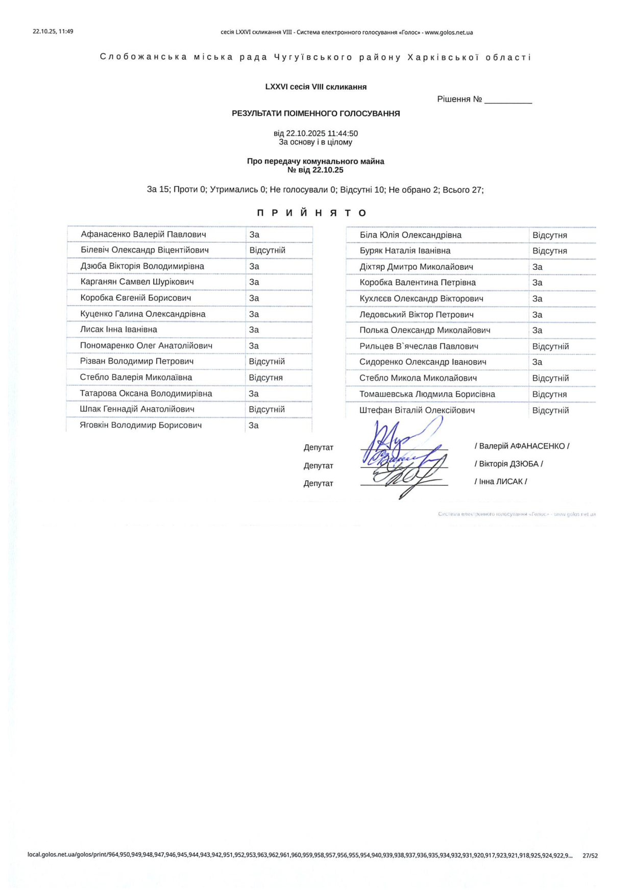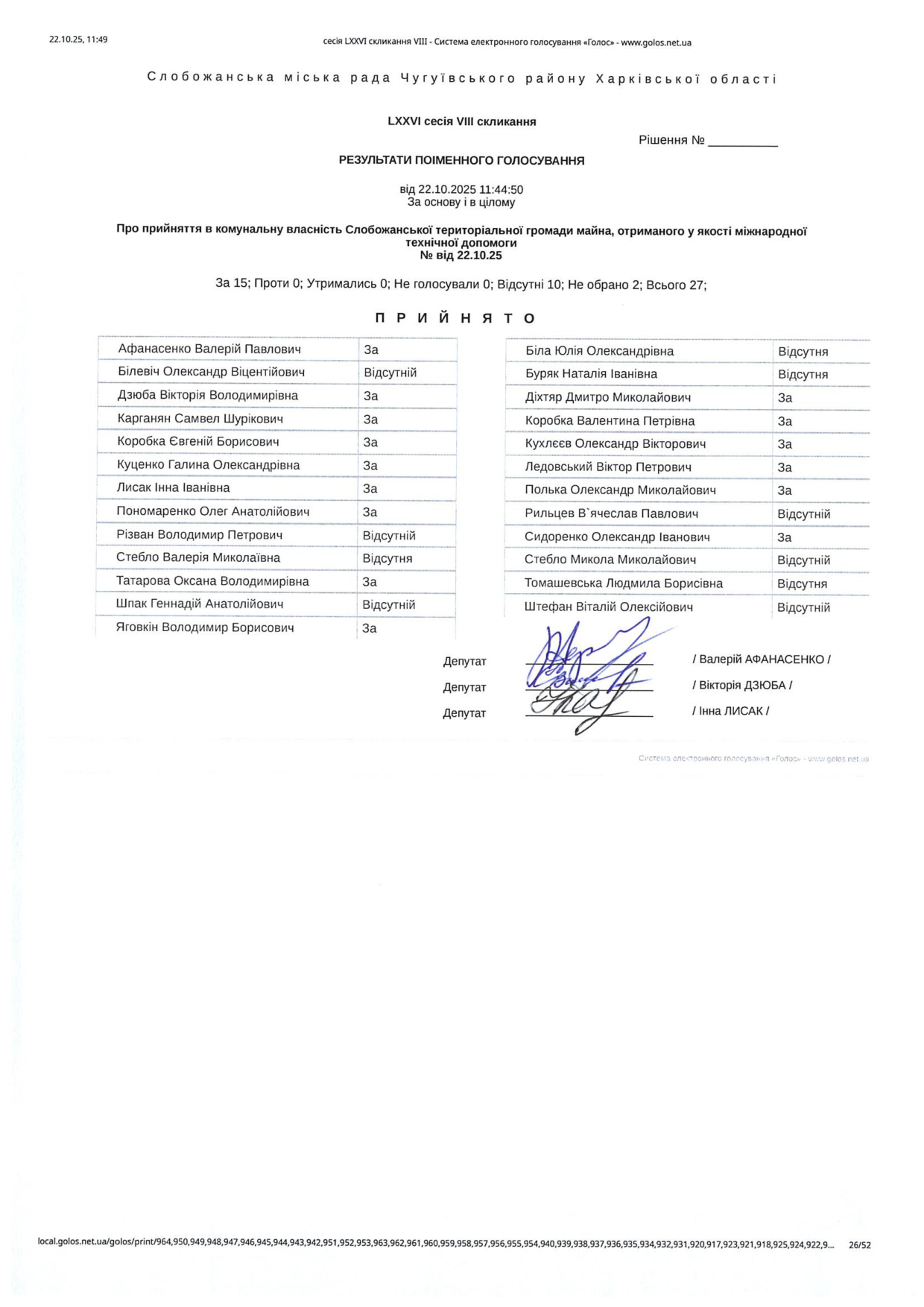 Відомості голосування до рішення сесії №3255 Про прийняття в комунальну власність Слобожанської територіальної громади майна, отриманого у якості міжнародної технічної допомоги.