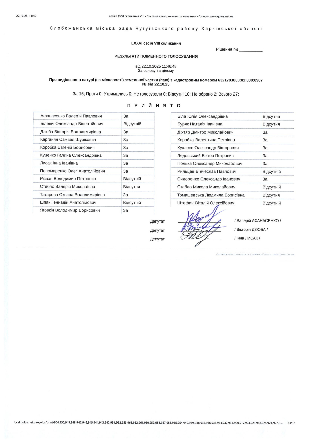 Відомості голосування до рішення сесії №3262 Про виділення в натурі (на місцевості) земельної частки (паю) з кадастровим номером 6321783000:01:000:0907.