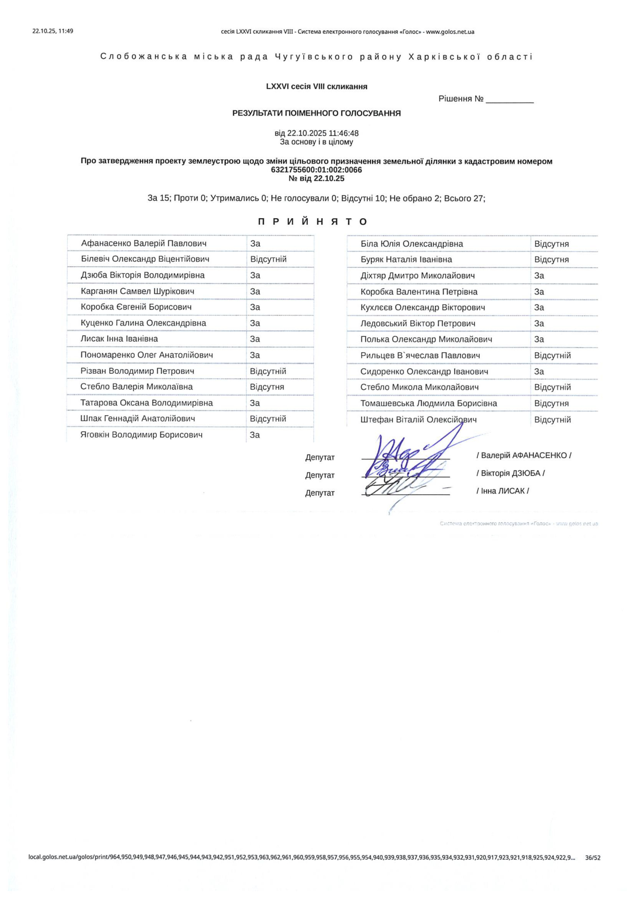 Відомості голосування до рішення сесії №3265 Про затвердження проекту землеустрою щодо зміни цільового призначення земельної ділянки з кадастровим номером 6321755600:01:002:0066.