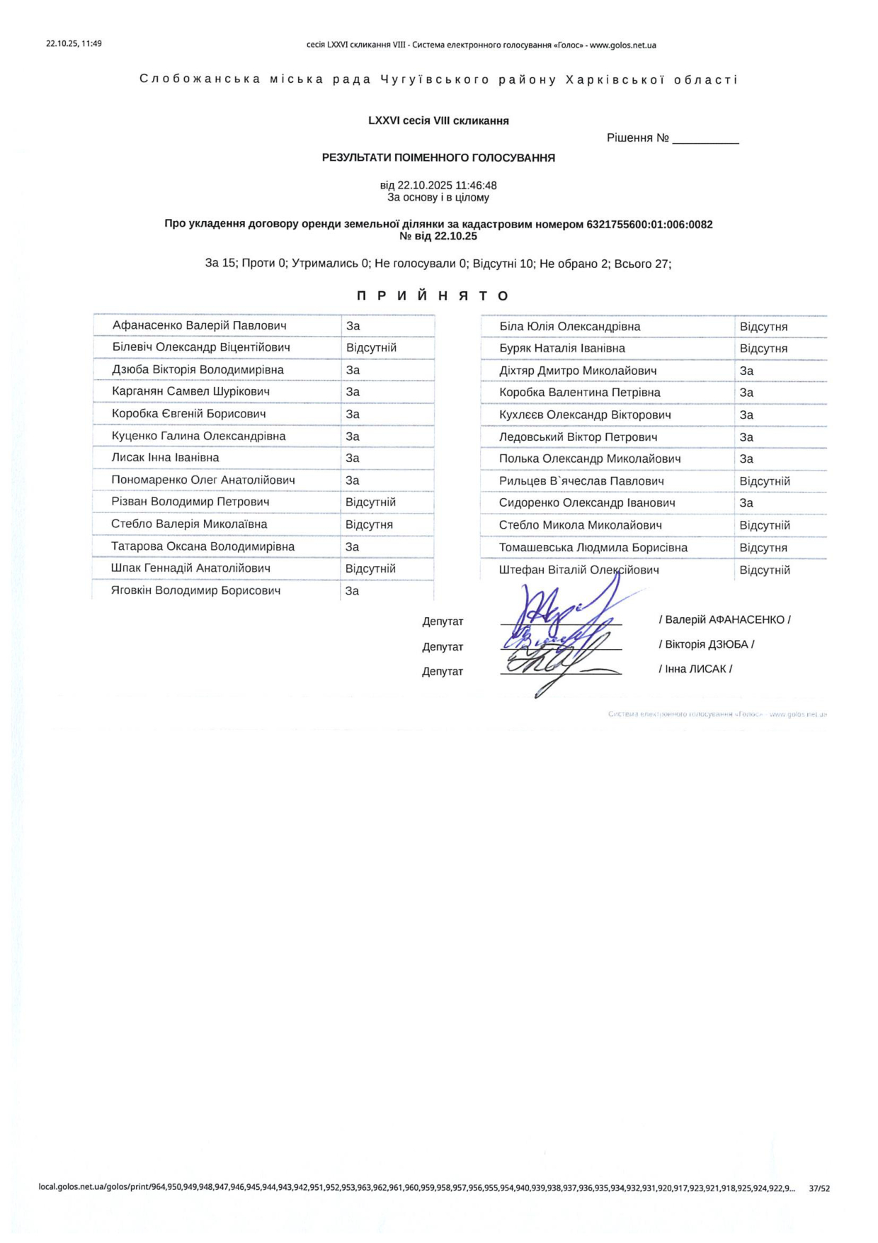 Відомості голосування до рішення сесії №3266 Про укладення договору оренди земельної ділянки за кадастровим номером 6321755600:01:006:0082.