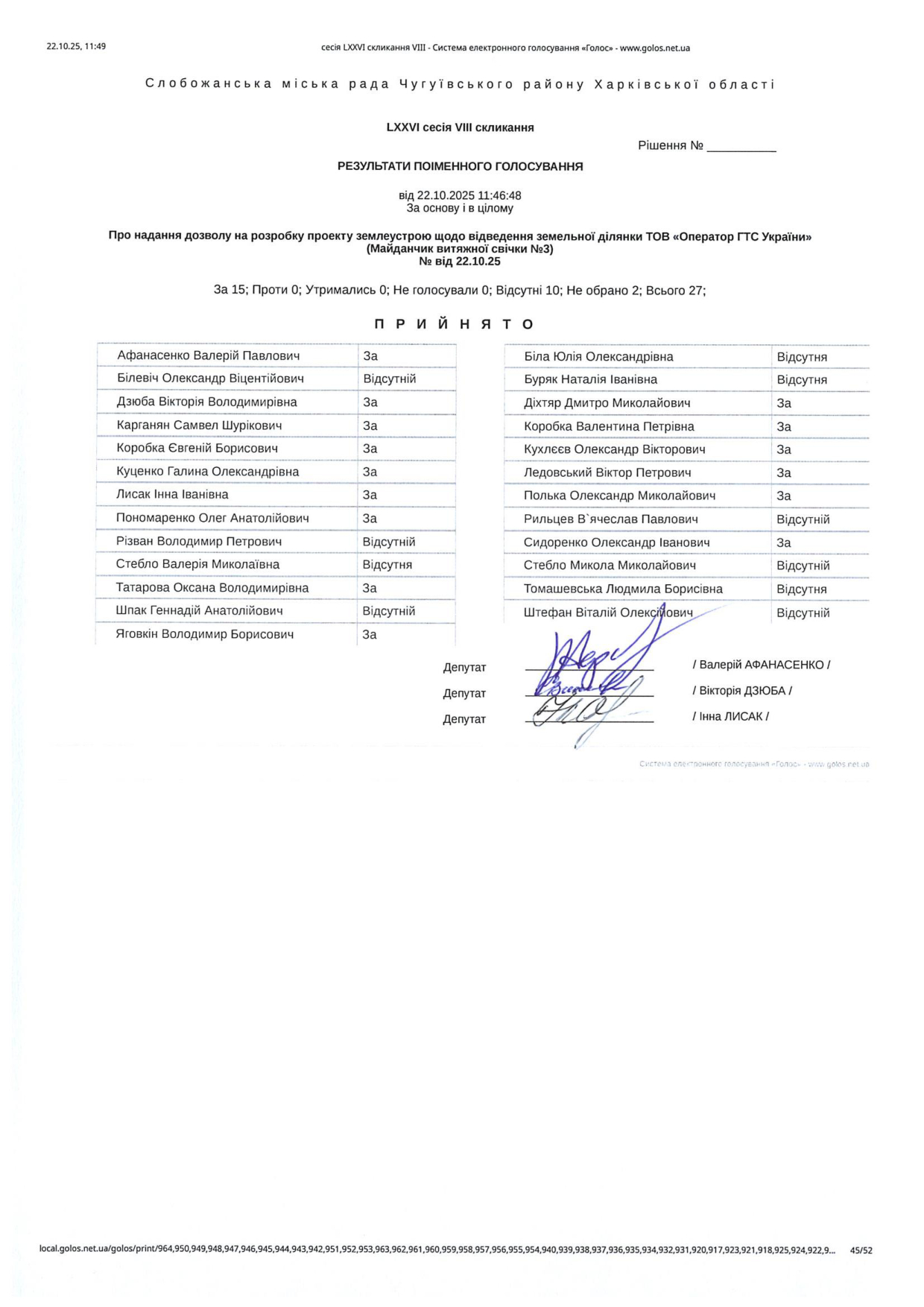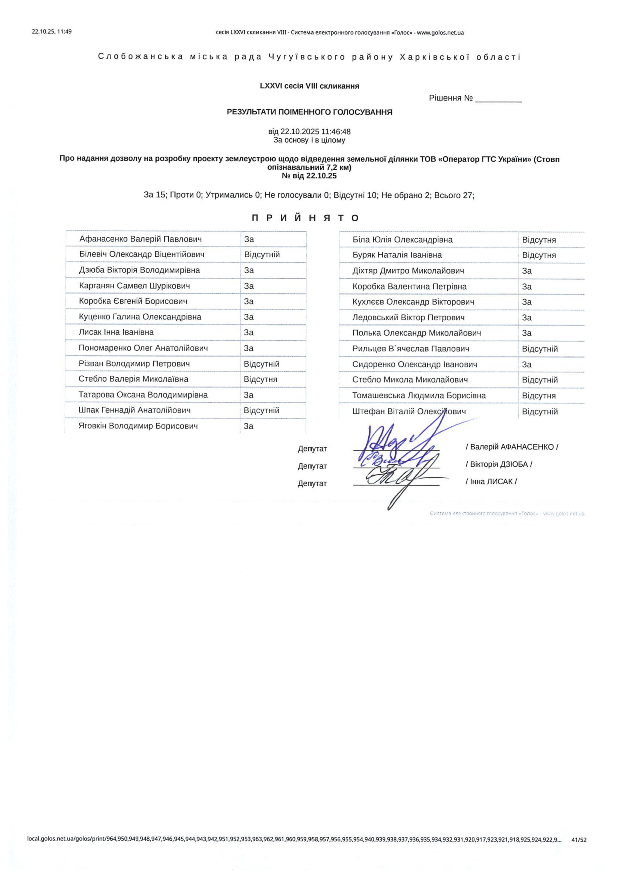 Відомості голосування до рішення сесії №3270 Про надання дозволу на розробку проекту землеустрою щодо відведення земельної ділянки ТОВ «Оператор ГТС України» (Стовп опізнавальний 7,2 км).