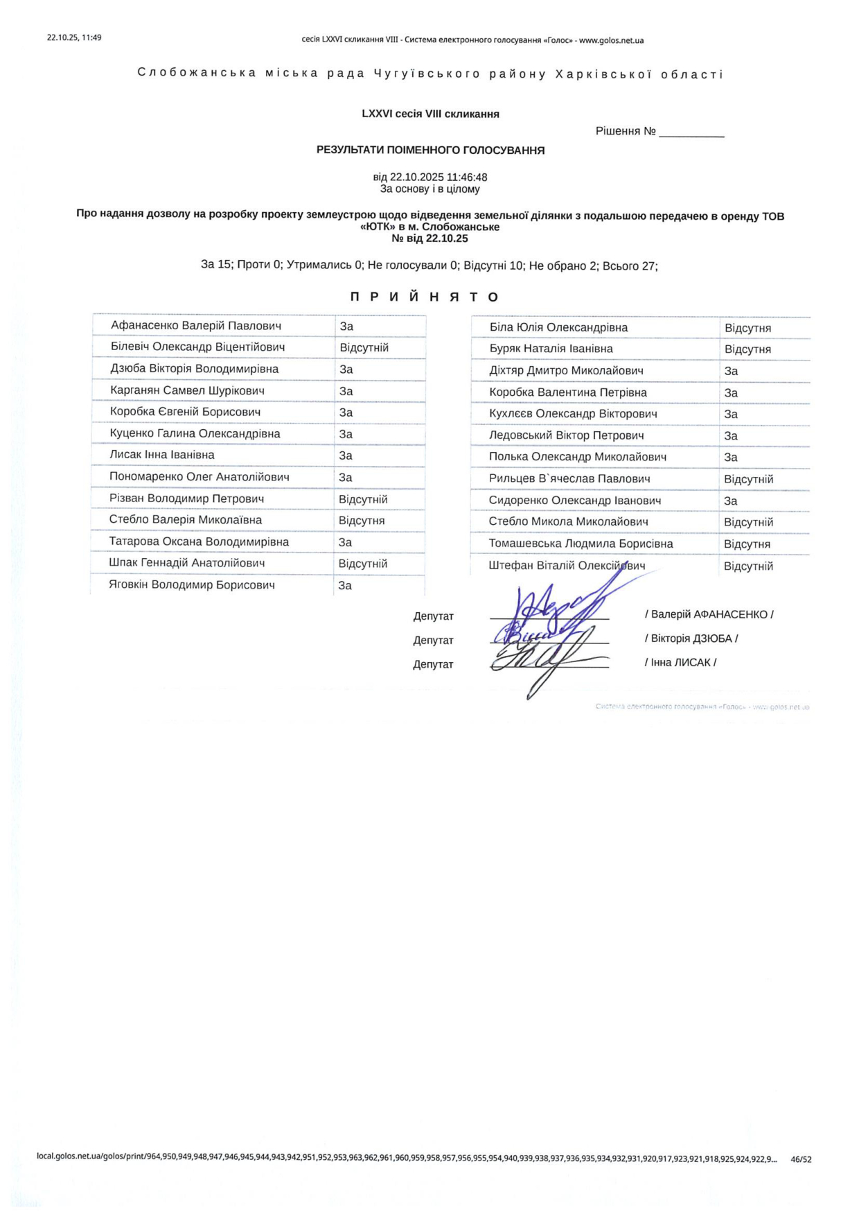 Відомості голосування до рішення сесії №3275 Про надання дозволу на розробку проекту землеустрою щодо відведення земельної ділянки з подальшою передачею в оренду ТОВ «ЮТК» в м. Слобожанське.