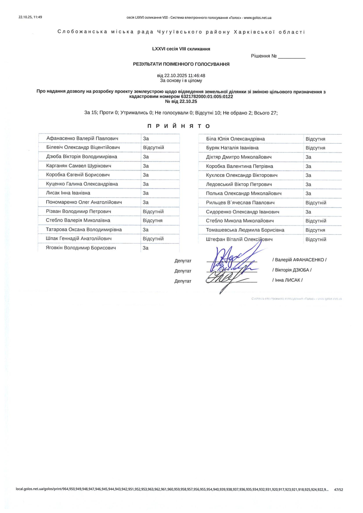 Відомості голосування до рішення сесії №3276 Про надання дозволу на розробку проекту землеустрою щодо відведення земельної ділянки зі зміною цільового призначення з кадастровим номером 6321782000:01:005:0122.