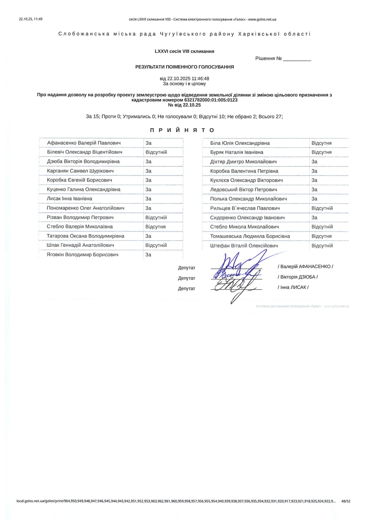 Відомості голосування до рішення сесії №3277 Про надання дозволу на розробку проекту землеустрою щодо відведення земельної ділянки зі зміною цільового призначення з кадастровим номером 6321782000:01:005:0123.