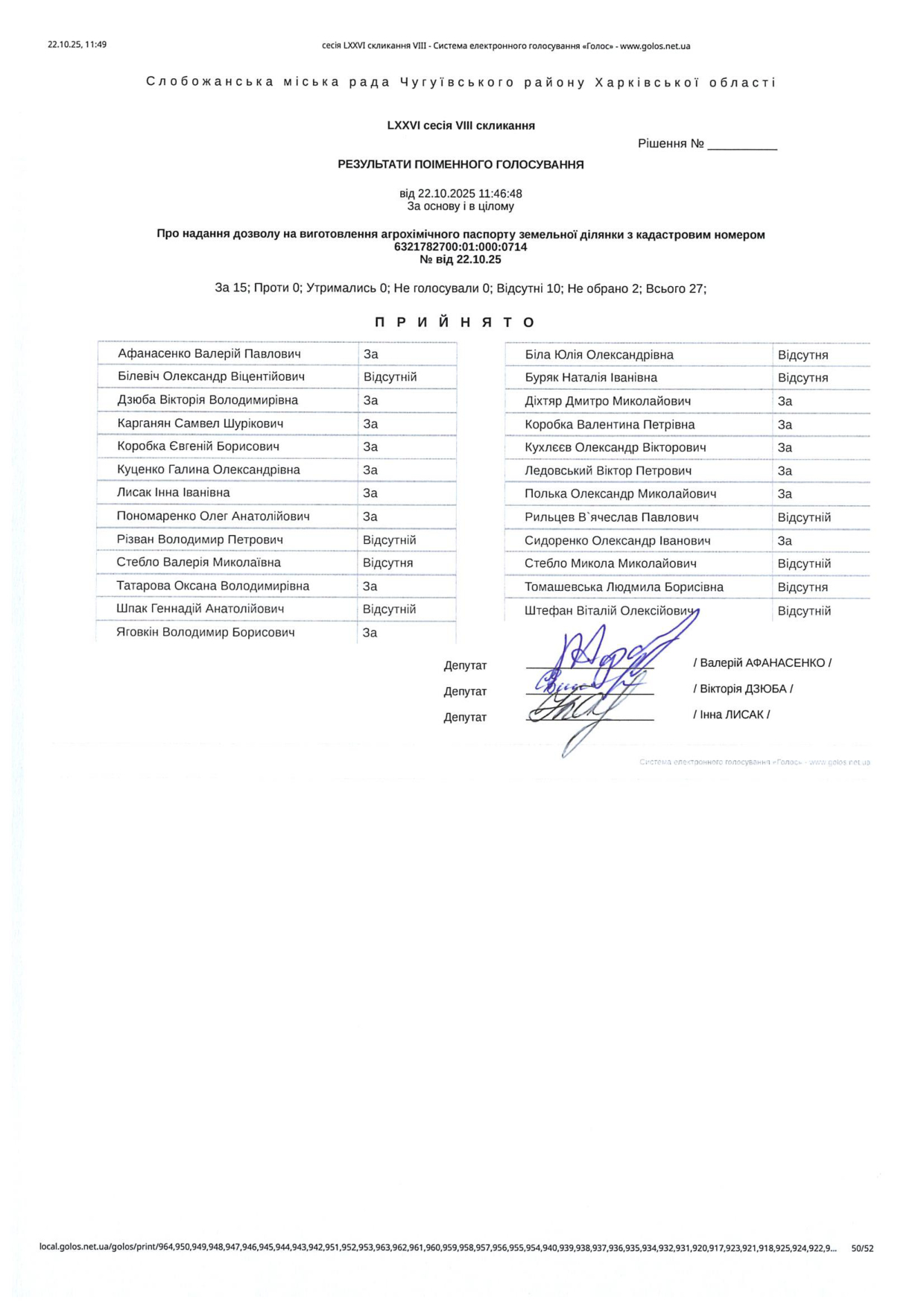 Відомості голосування до рішення сесії №3279 Про надання дозволу на виготовлення агрохімічного паспорту земельної ділянки з кадастровим номером 6321782700:01:000:0714.