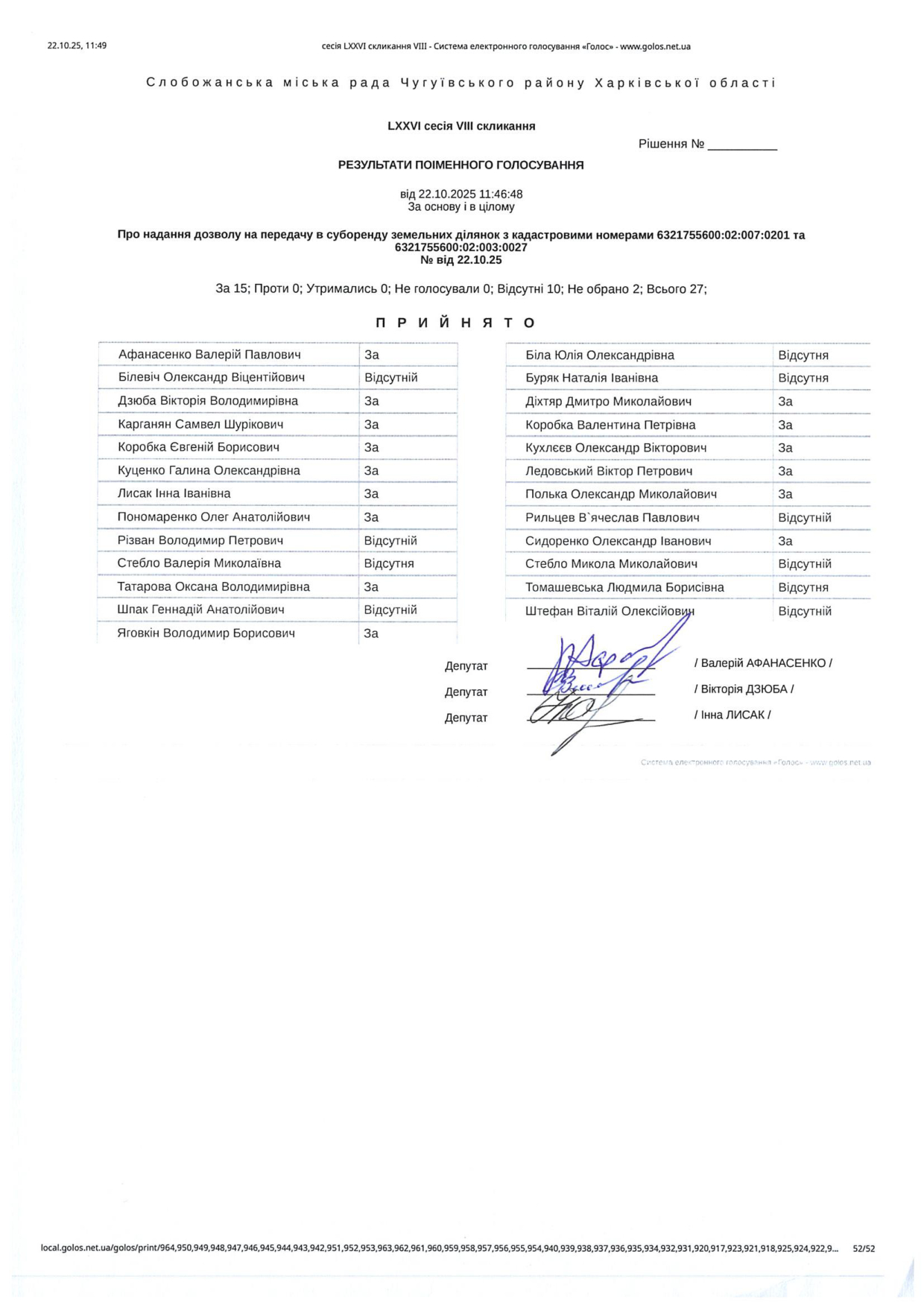 Відомості голосування до рішення сесії №3281 Про надання дозволу на передачу в суборенду земельних ділянок з кадастровими номерами 6321755600:02:007:0201 та 6321755600:02:003:0027.