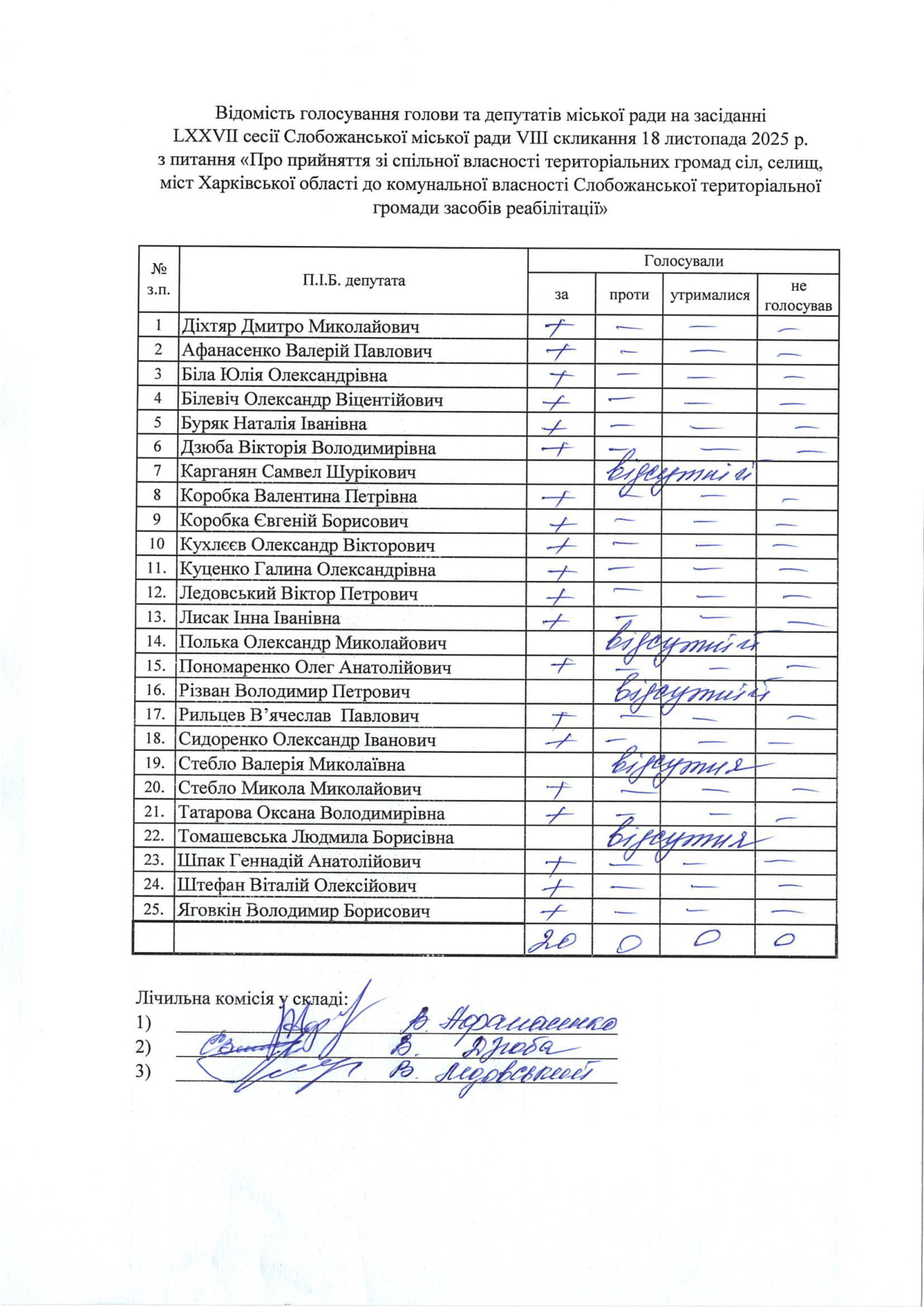 Відомості голосування до рішення сесії №3298 Про прийняття зі спільної власності територіальних громад сіл, селищ, міст Харківської області до комунальної власності Слобожанської територіальної громади засобів реабілітації