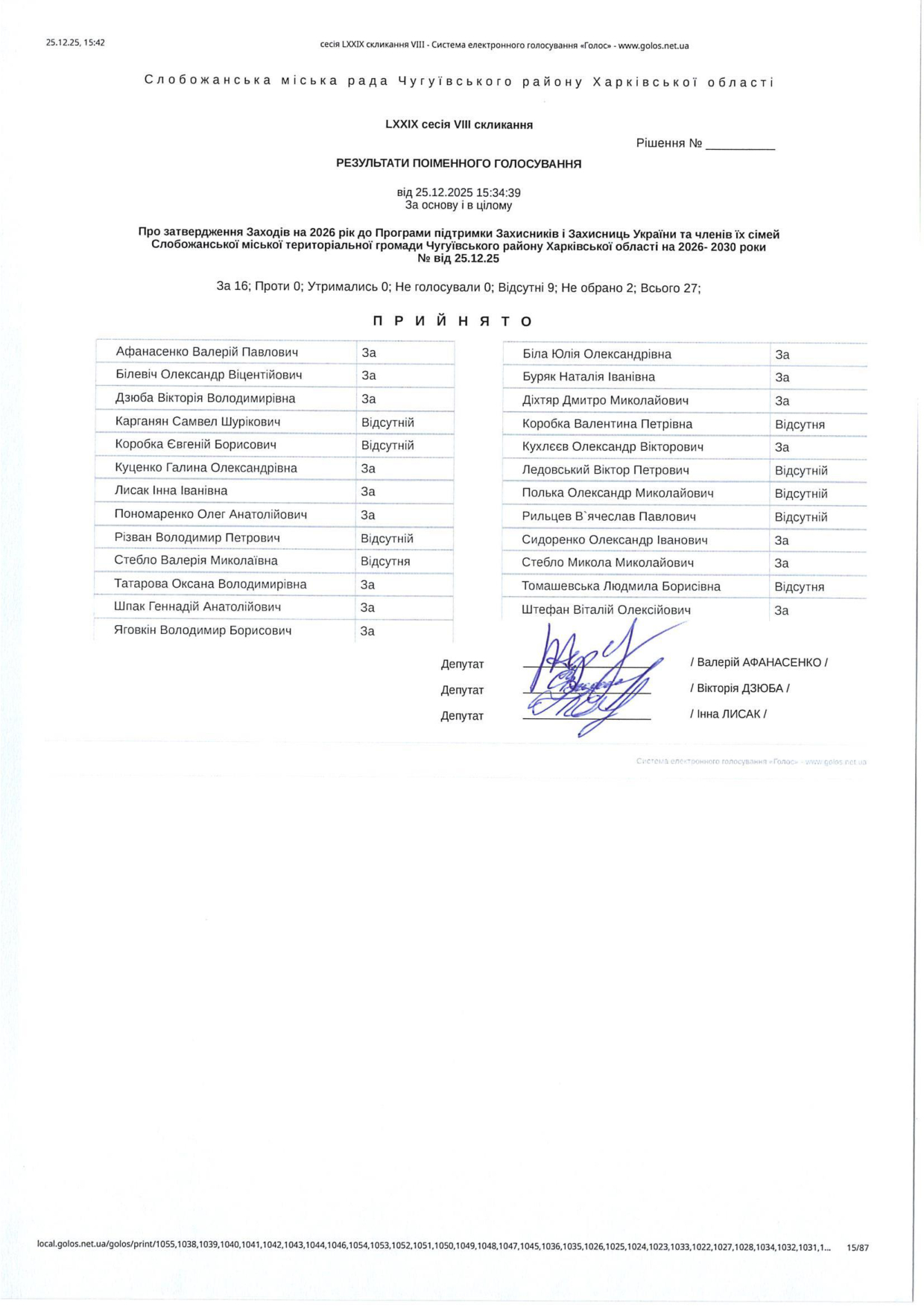 Відомості голосування до рішення сесії №3352 Про затвердження Заходів на 2026 рік до Програми підтримки Захисників і Захисниць України та членів їх сімей Слобожанської міської територіальної громади Чугуївського району Харківської області на 2026- 2030 роки