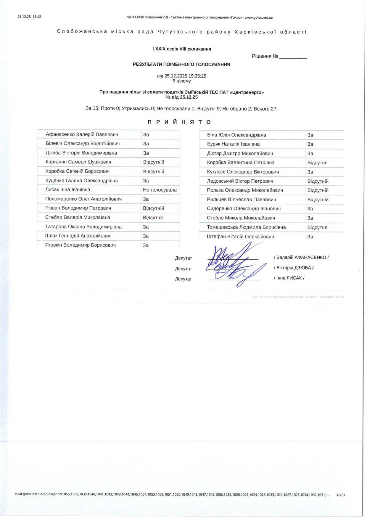 Відомості голосування до рішення сесії №3386 Про надання пільг зі сплати податків Зміївській ТЕС ПАТ «Центренерго»