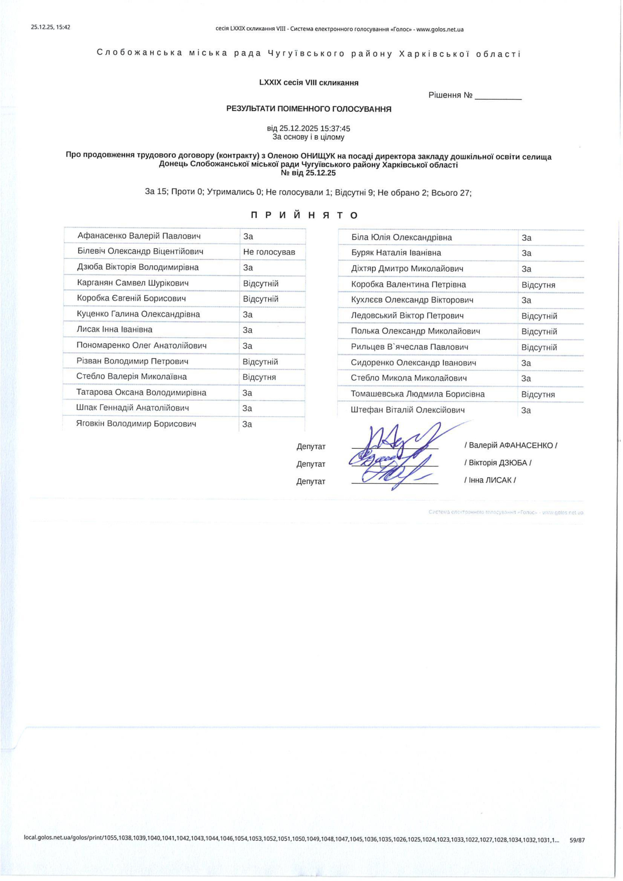 Відомості голосування до рішення сесії №3396 Про продовження трудового договору (контракту) з Оленою ОНИЩУК на посаді директора закладу дошкільної освіти селища Донець Слобожанської міської ради Чугуївського району Харківської області