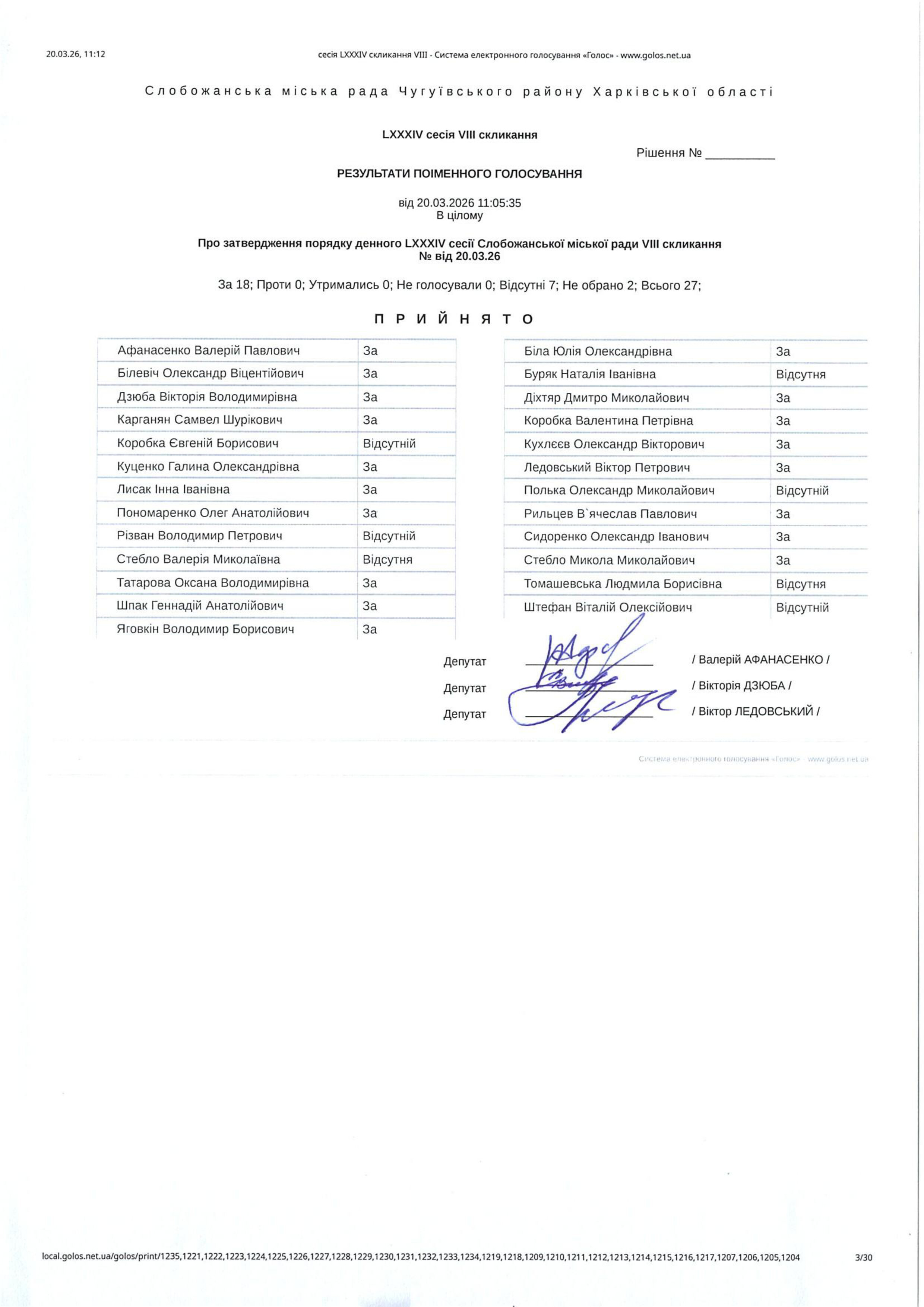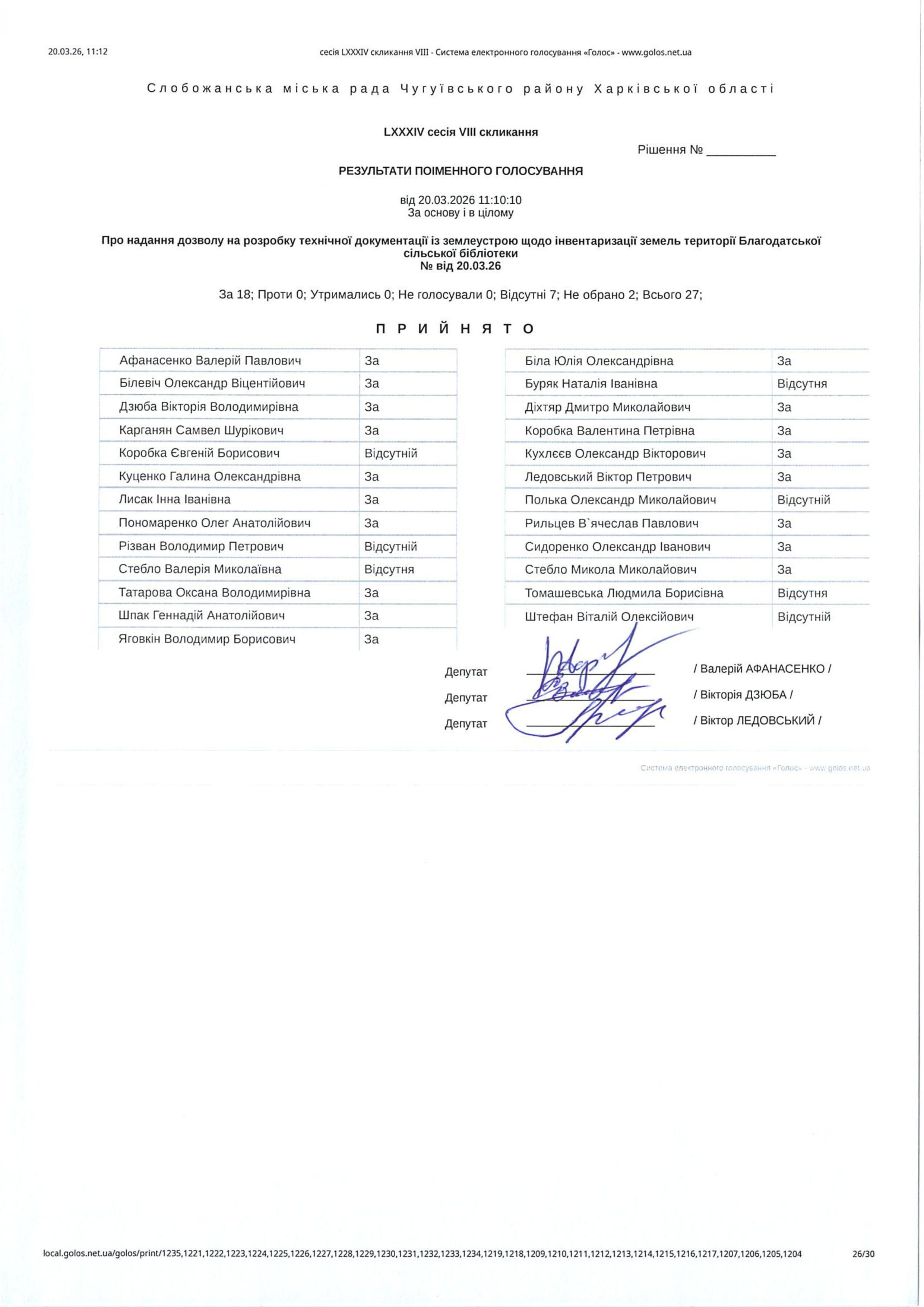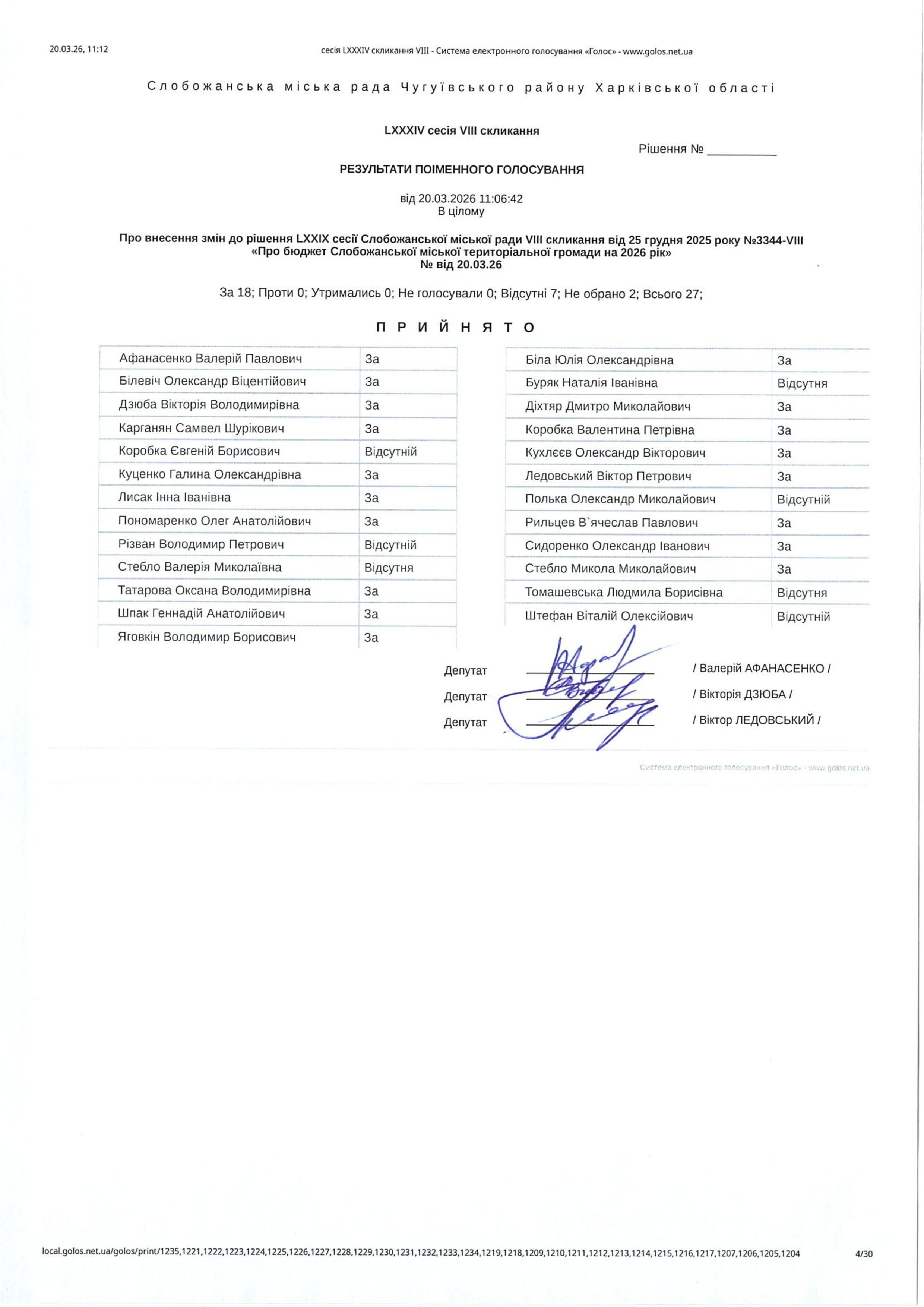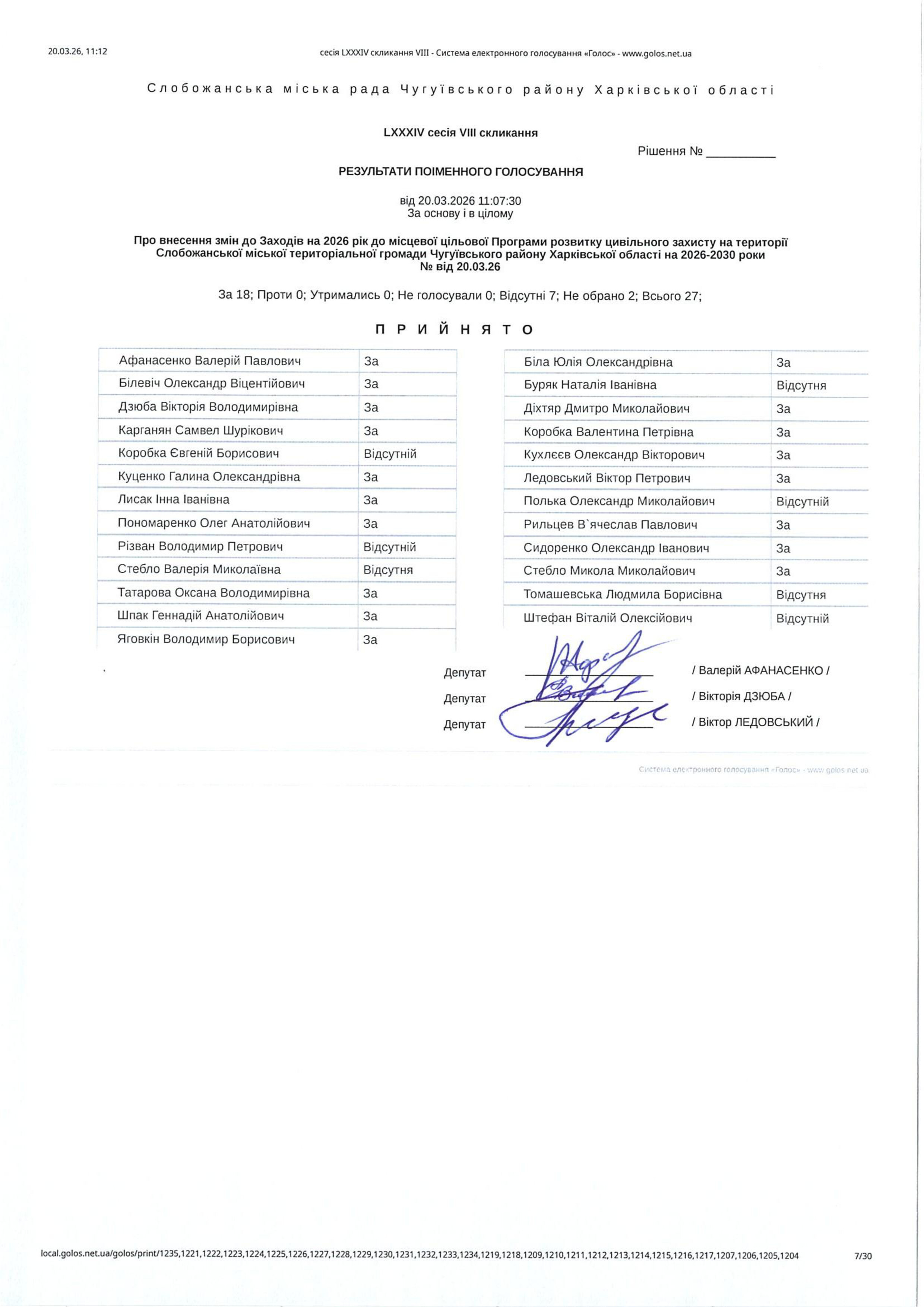 Відомість голосування до рішення сесії №3562 Про внесення змін до Заходів на 2026 рік до місцевої цільової Програми розвитку цивільного захисту на території Слобожанської міської територіальної громади Чугуївського району Харківської області на 2026-2030 роки
