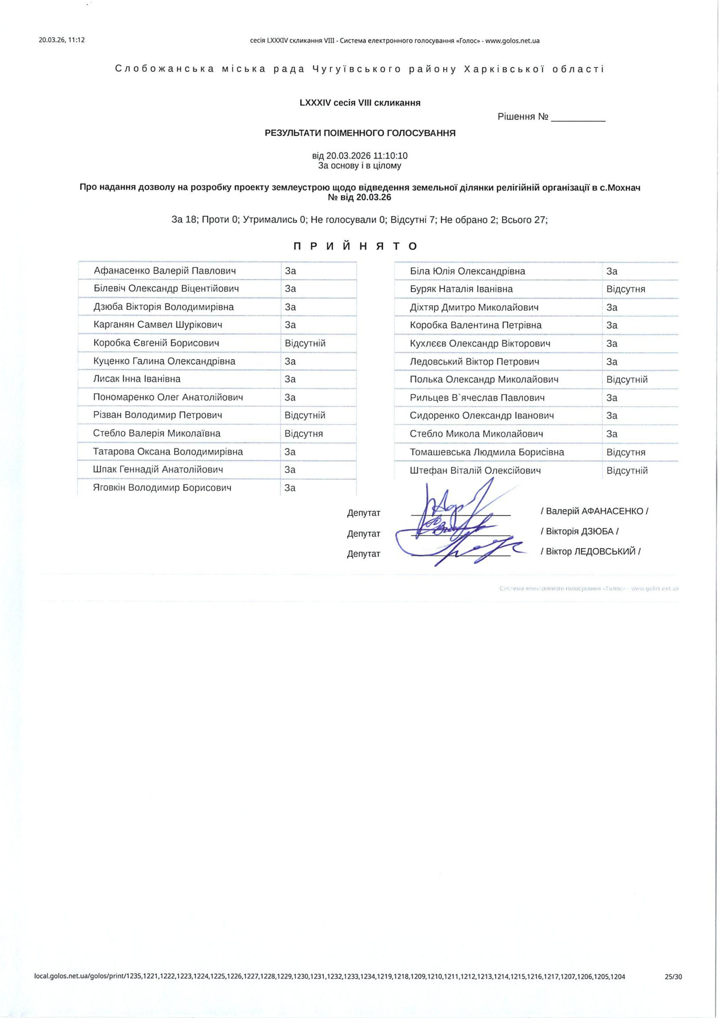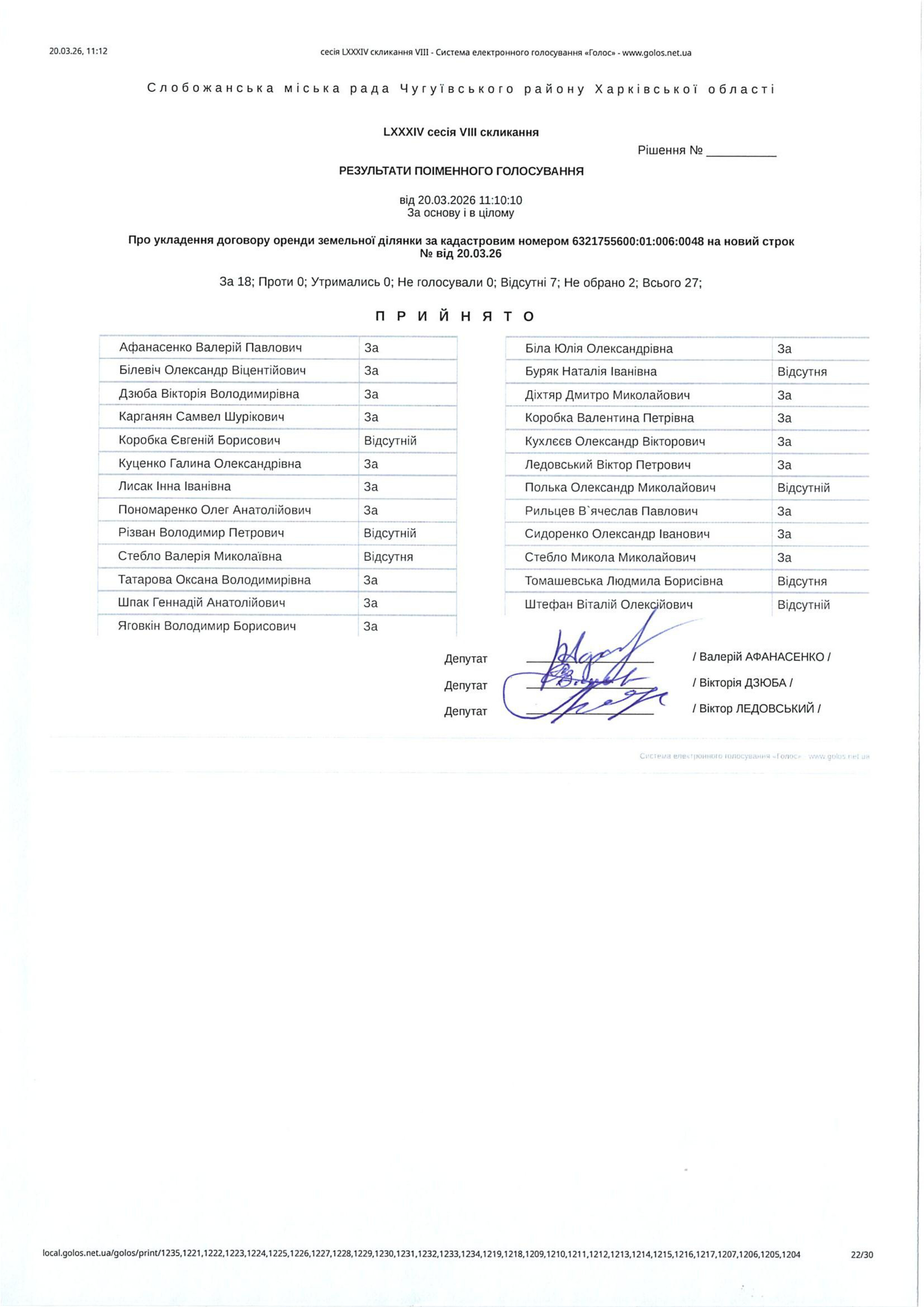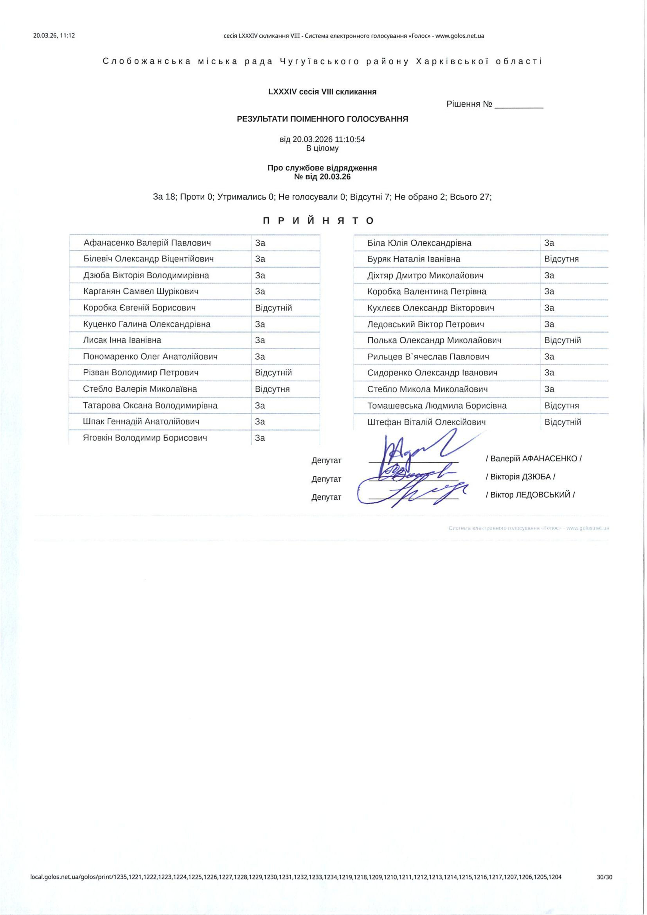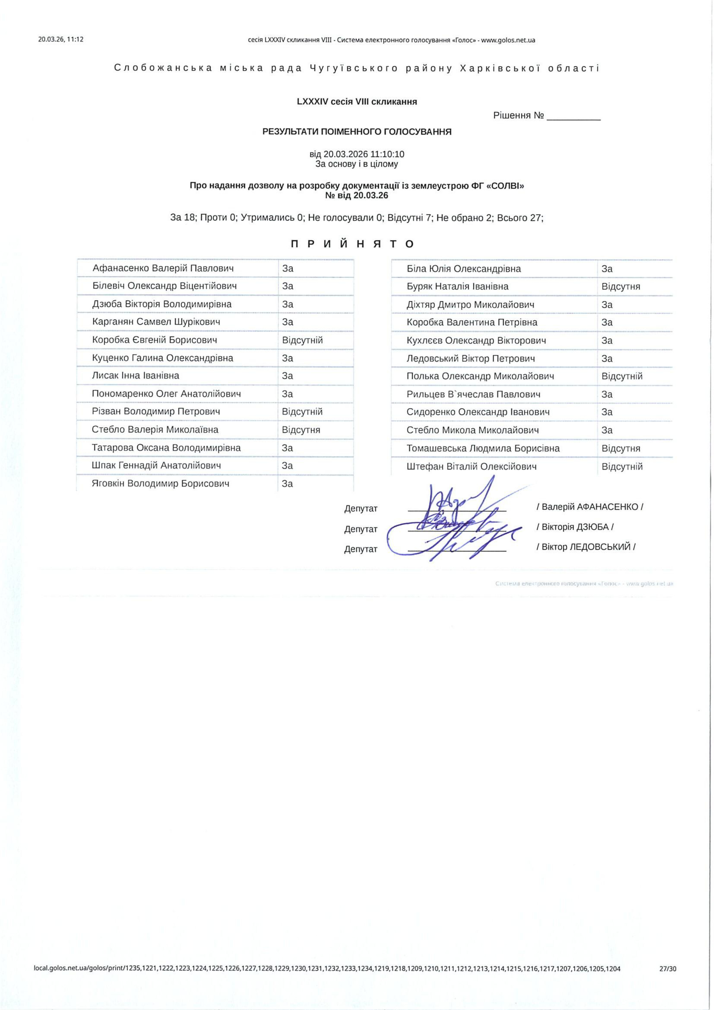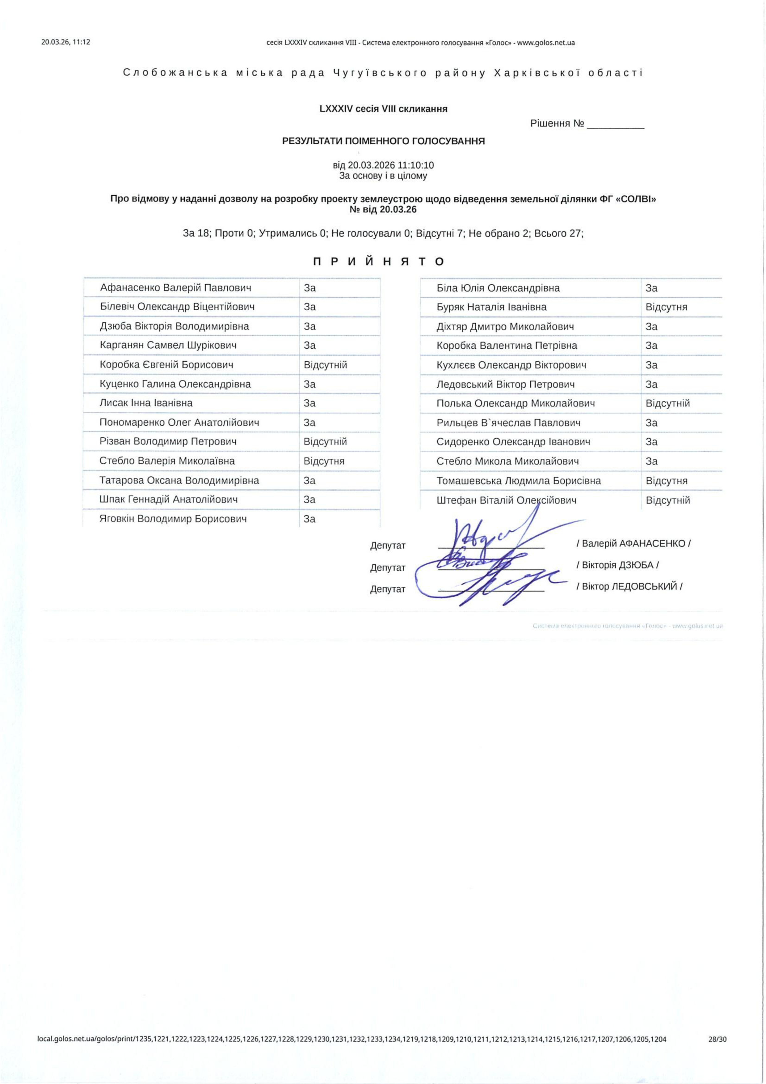 Відомість голосування до рішення сесії №3562 Про внесення змін до Заходів на 2026 рік до місцевої цільової Програми розвитку цивільного захисту на території Слобожанської міської територіальної громади Чугуївського району Харківської області на 2026-2030 роки