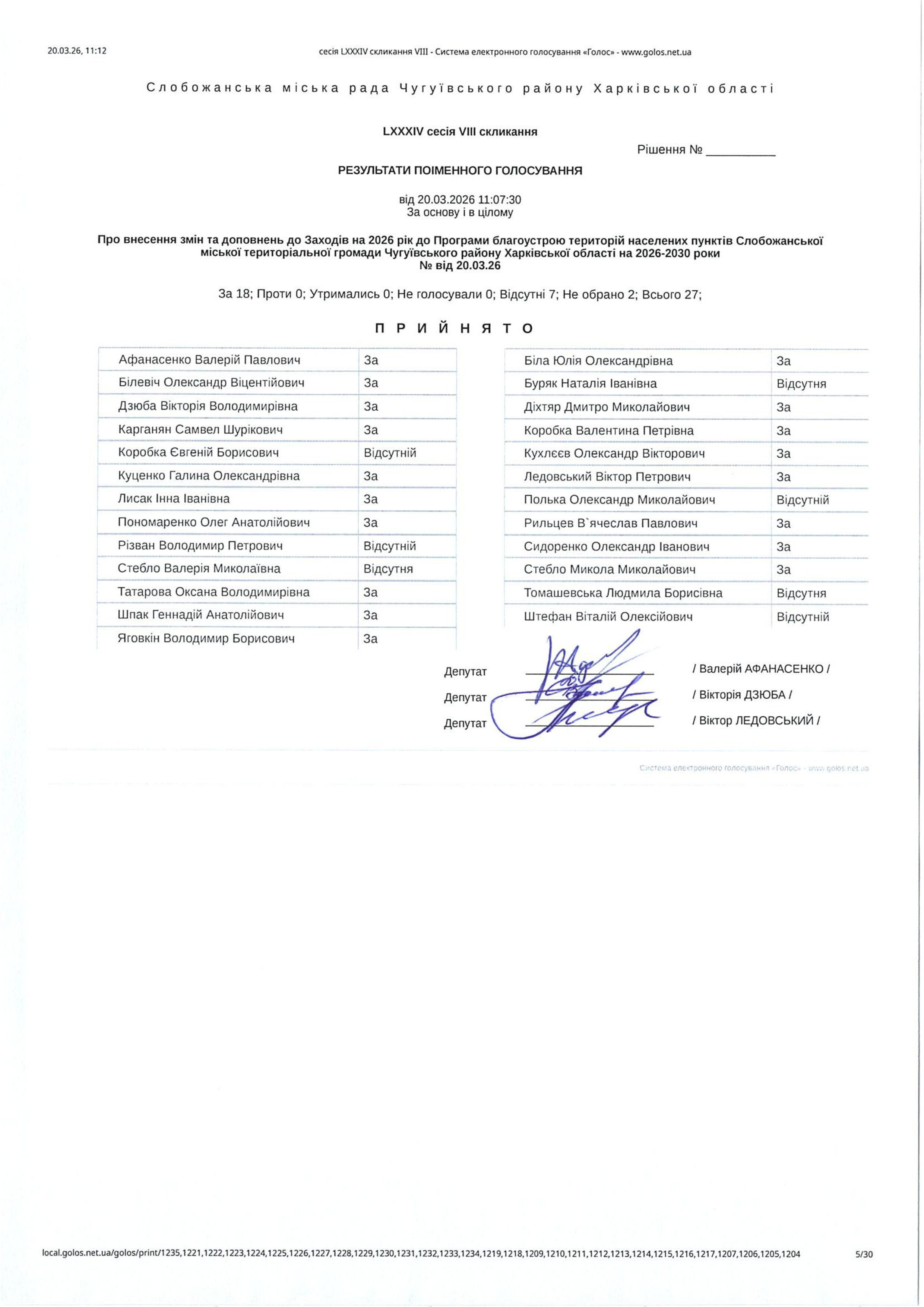 Відомість голосування до рішення сесії №3560 Про внесення змін та доповнень до Заходів на 2026 рік до Програми благоустрою територій населених пунктів Слобожанської міської територіальної громади Чугуївського району Харківської області на 2026-2030 роки