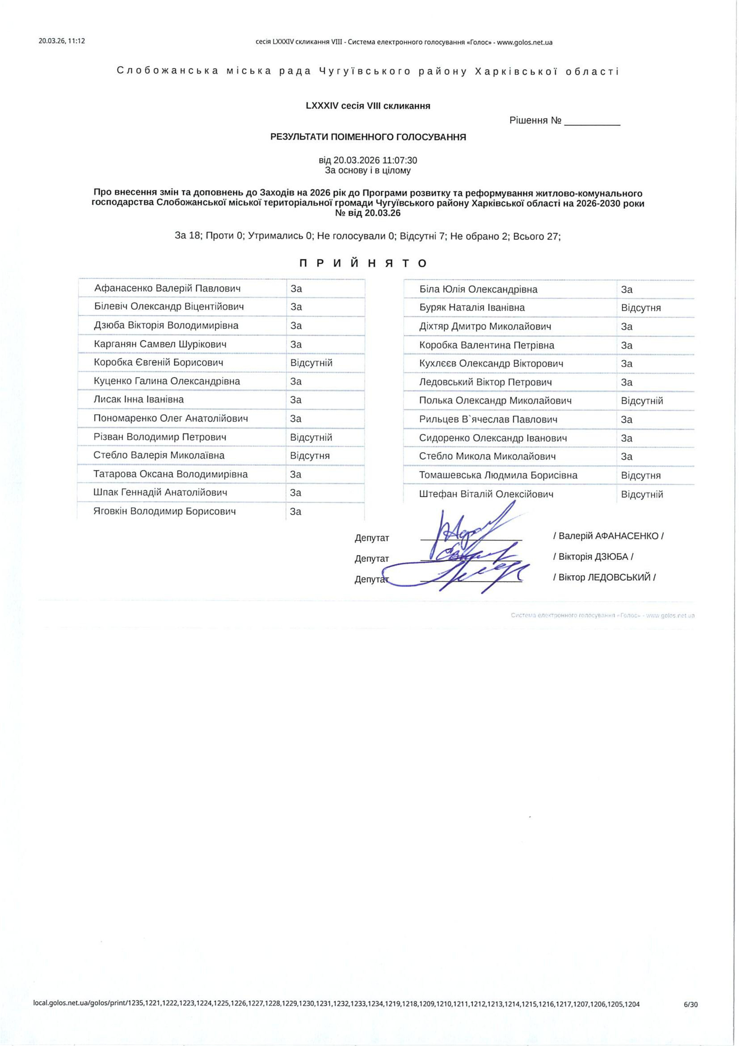Відомість голосування до рішення сесії №3561 Про внесення змін та доповнень до Заходів на 2026 рік до Програми розвитку та реформування житлово-комунального господарства Слобожанської міської територіальної громади Чугуївського району Харківської області на 2026-2030 роки