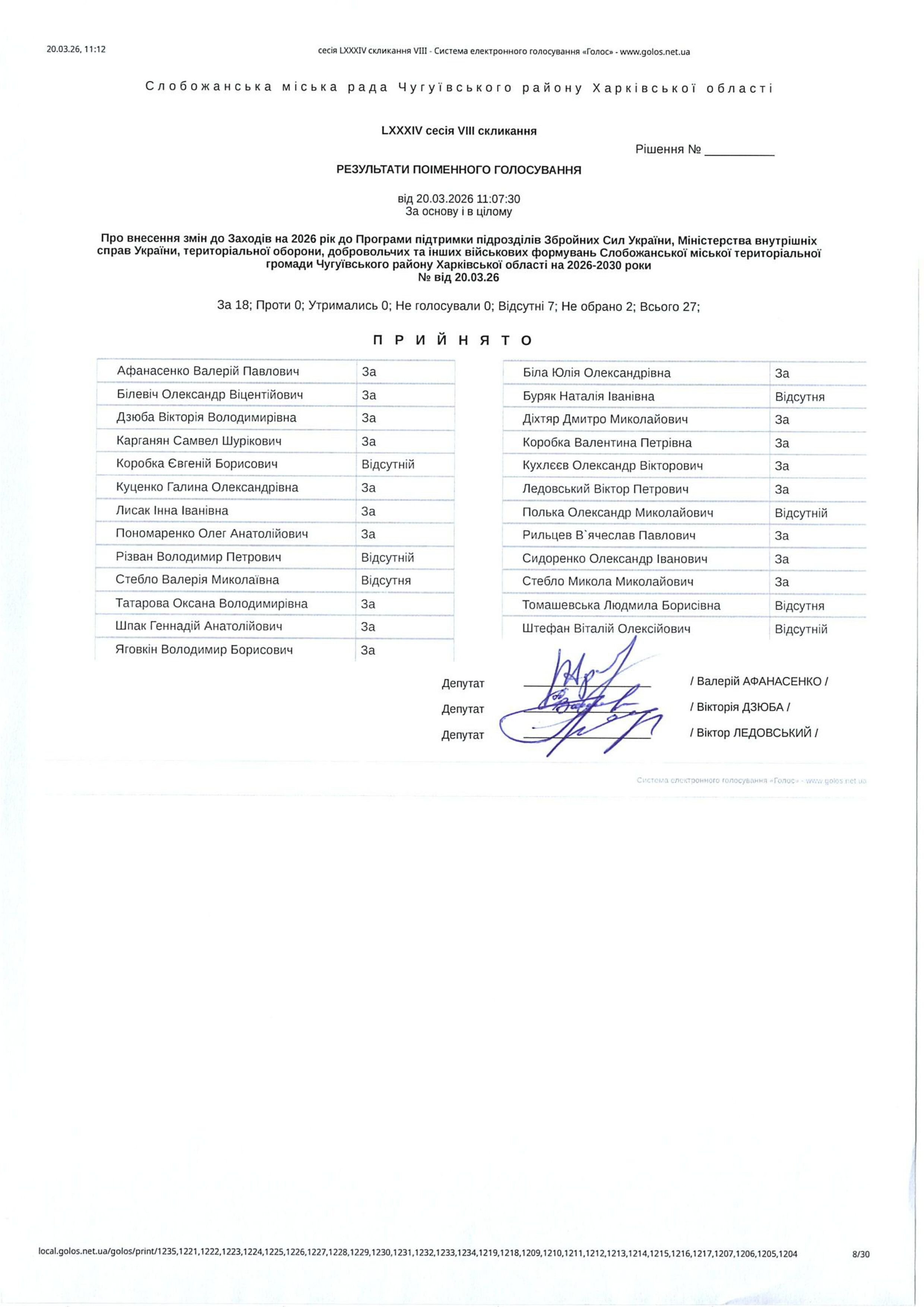 Відомість голосування до рішення сесії №3563 Про внесення змін до Заходів на 2026 рік до Програми підтримки підрозділів Збройних Сил України, Міністерства внутрішніх справ України, територіальної оборони, добровольчих та інших військових формувань Слобожанської міської територіальної громади Чугуївського району Харківської області на 2026-2030 роки