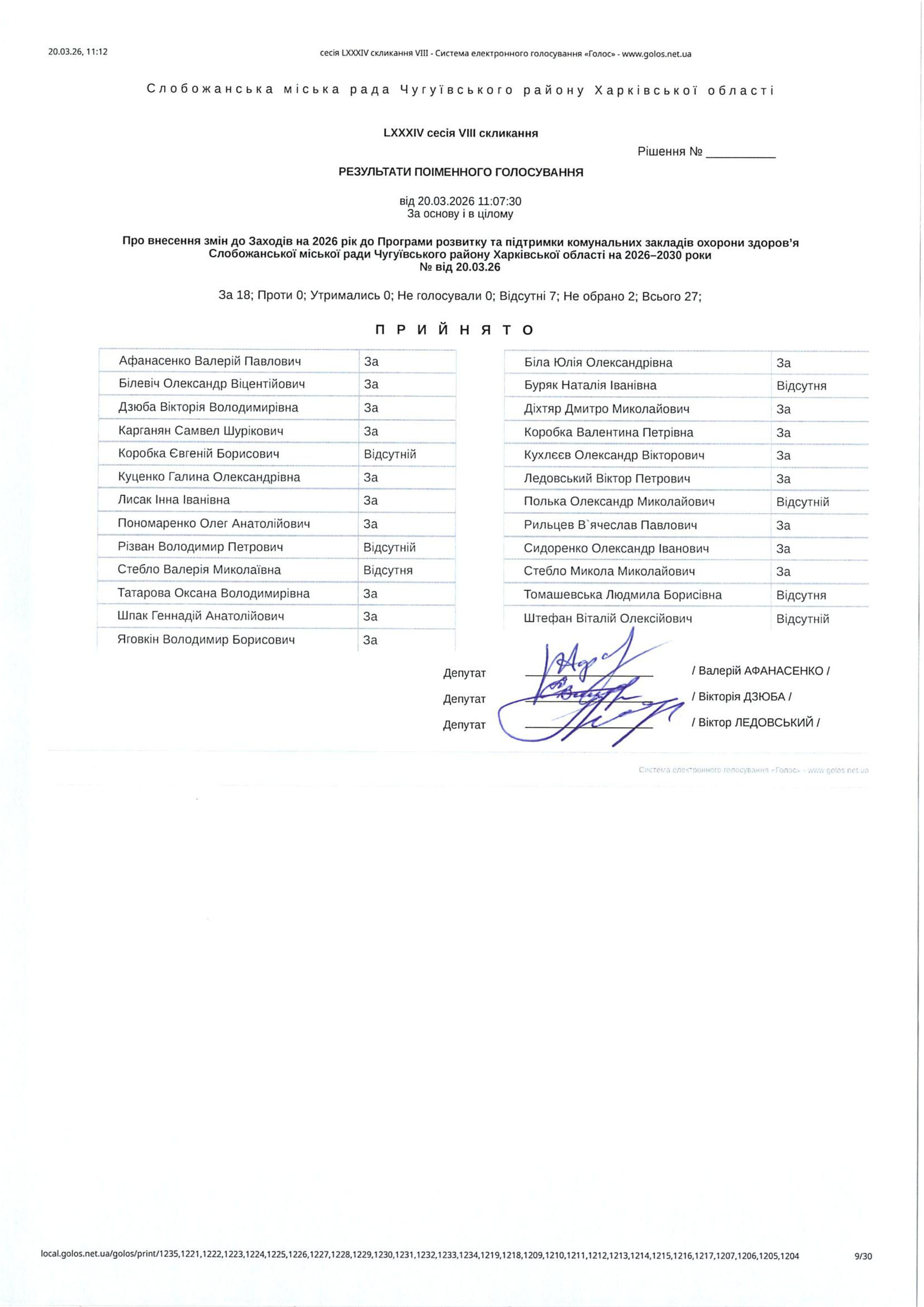 Відомість голосування до рішення сесії №3564 Про внесення змін до Заходів на 2026 рік до Програми розвитку та підтримки комунальних закладів охорони здоров’я Слобожанської міської ради Чугуївського району Харківської області на 2026–2030 роки