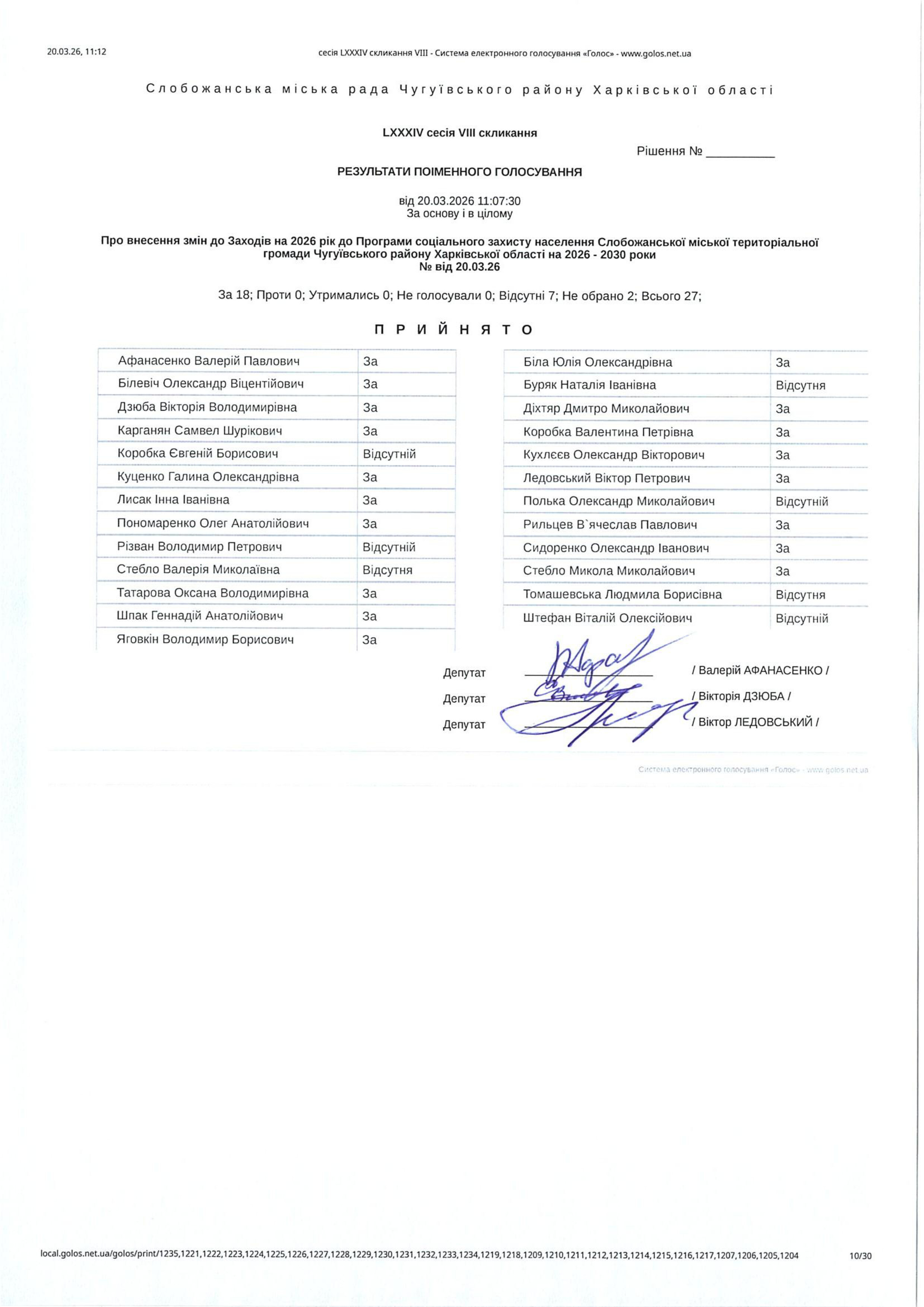 Відомість голосування до рішення сесії №3565 Про внесення змін до Заходів на 2026 рік до Програми соціального захисту населення Слобожанської міської територіальної громади Чугуївського району Харківської області на 2026 - 2030 роки