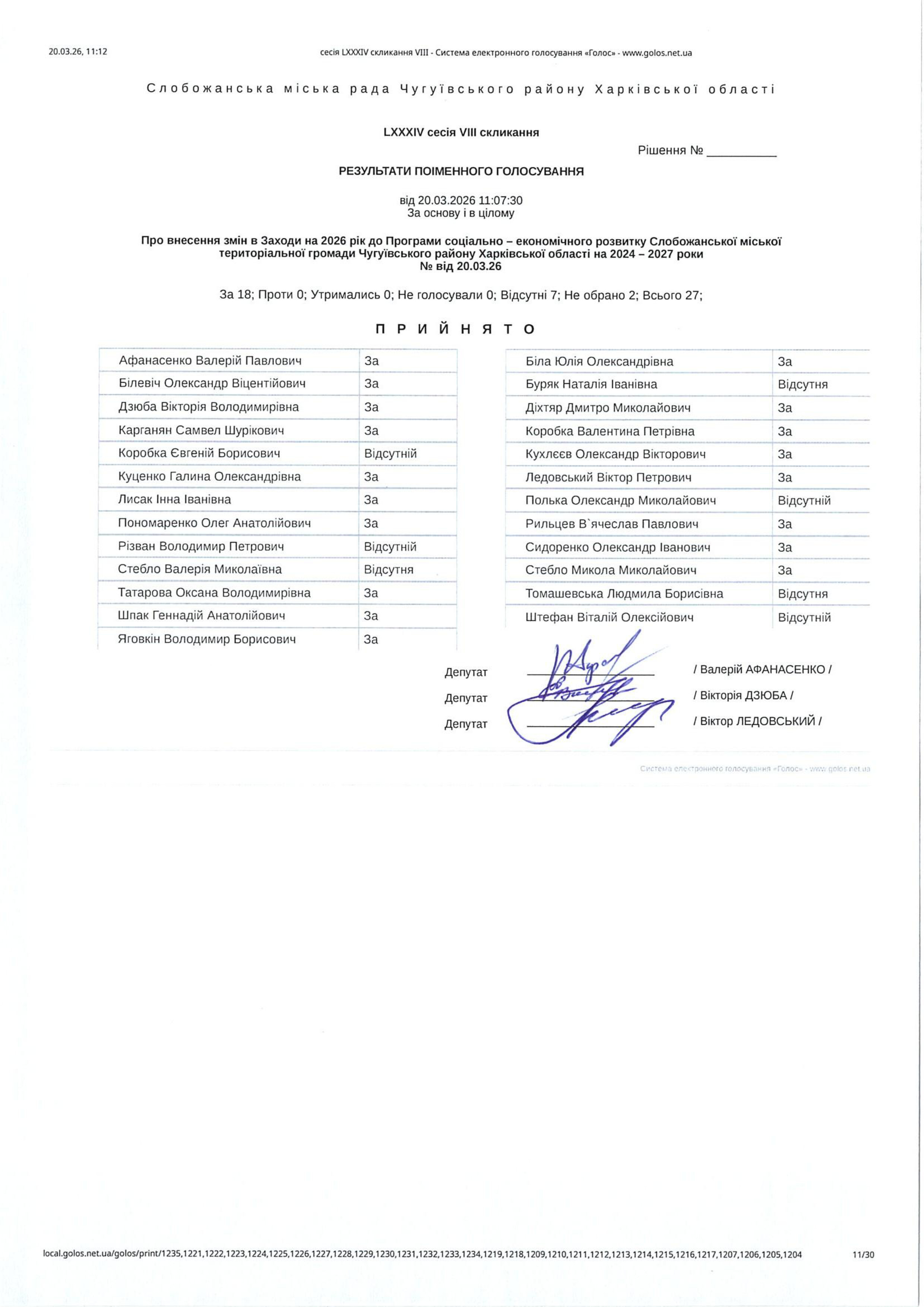 Відомість голосування до рішення сесії №3566 Про внесення змін в Заходи на 2026 рік до Програми соціально – економічного розвитку Слобожанської міської територіальної громади Чугуївського району Харківської області на 2024 – 2027 роки
