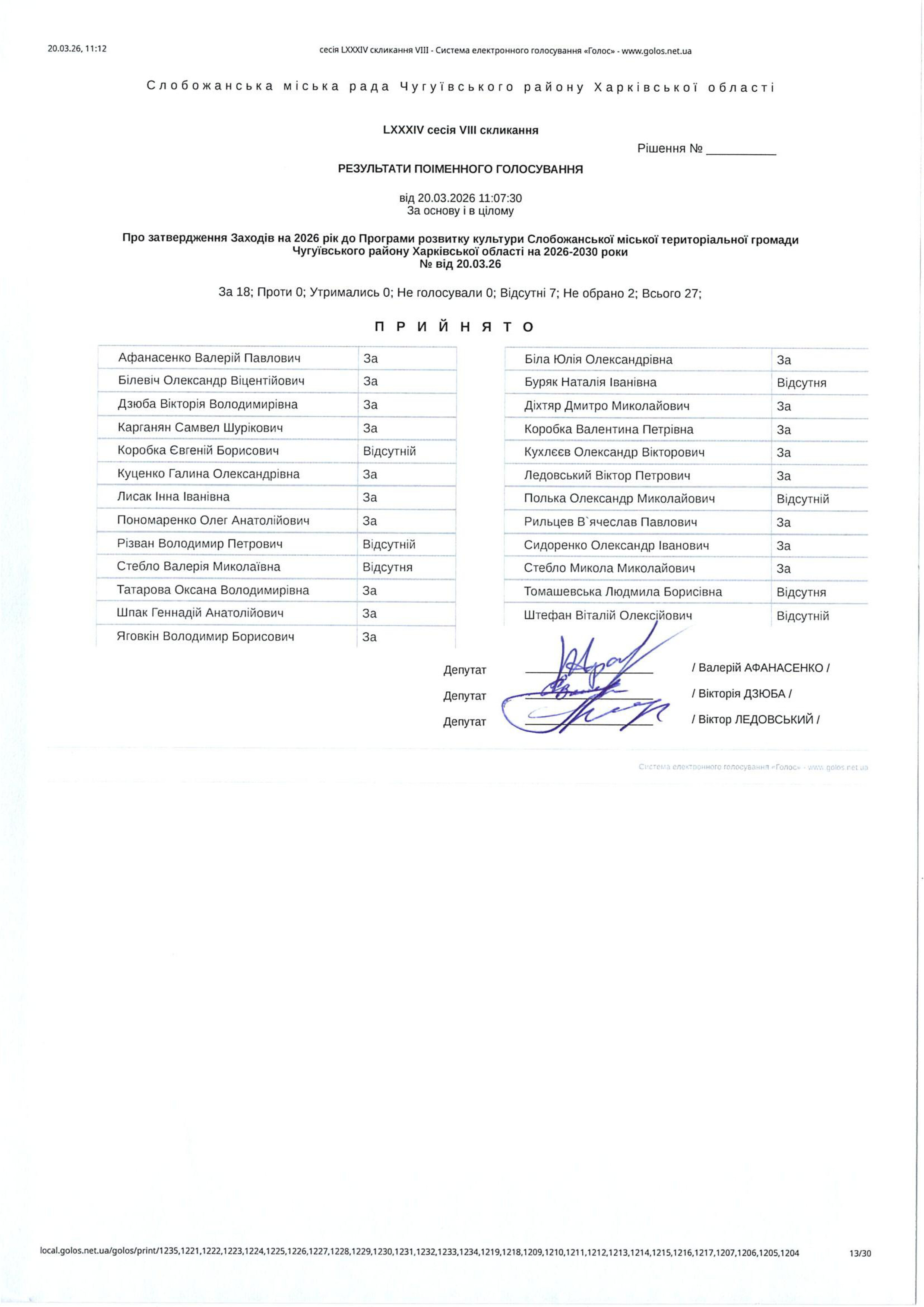 Відомість голосування до рішення сесії №3568 Про затвердження Заходів на 2026 рік до Програми розвитку культури Слобожанської міської територіальної громади Чугуївського району Харківської області на 2026-2030 роки