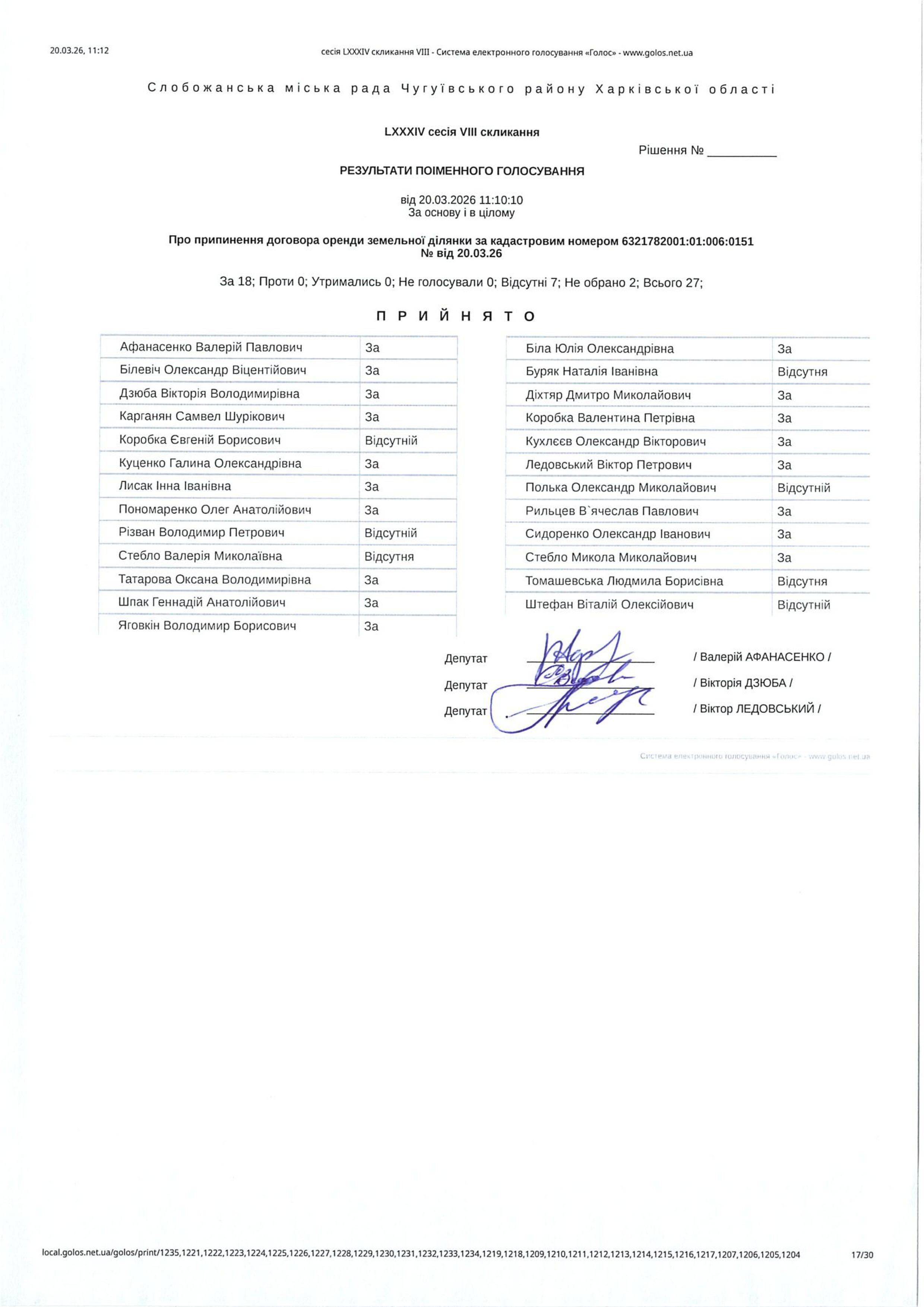 Відомість голосування до рішення сесії №3572 Про припинення договора оренди земельної ділянки за кадастровим номером 6321782001:01:006:0151