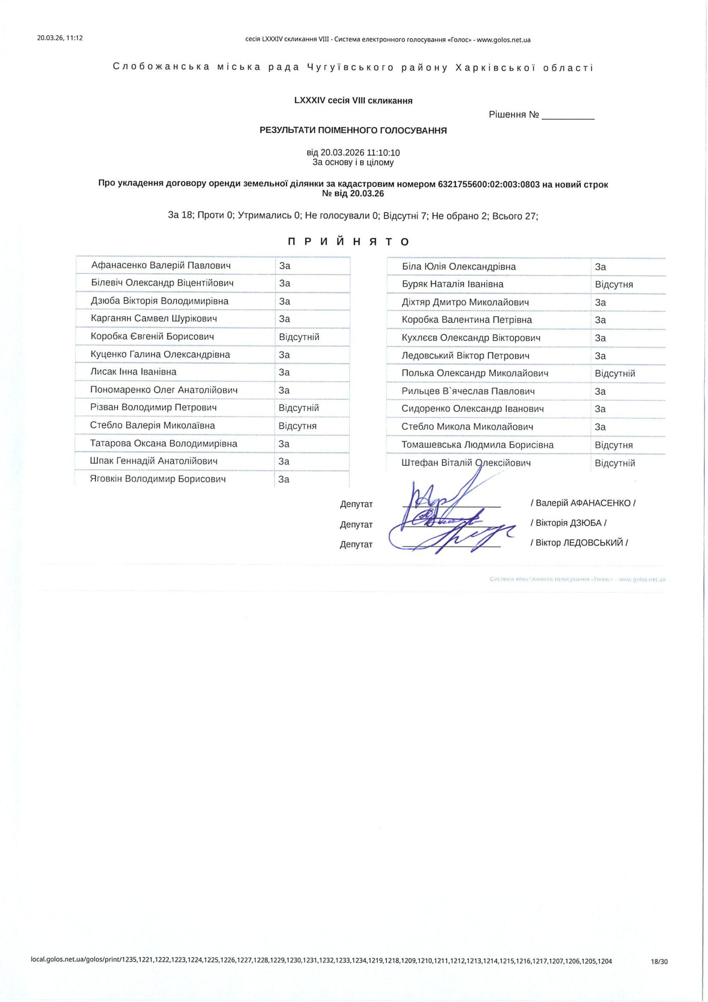 Відомість голосування до рішення сесії №3573 Про укладення договору оренди земельної ділянки за кадастровим номером 6321755600:02:003:0803 на новий строк