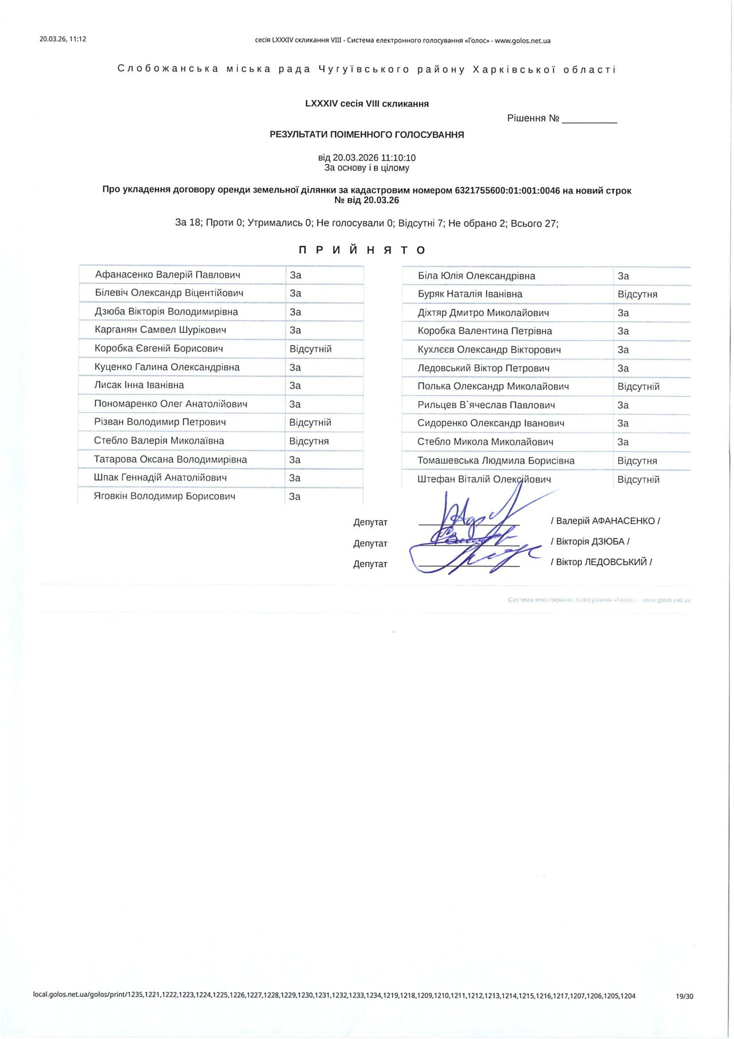 Відомість голосування до рішення сесії №3574 Про укладення договору оренди земельної ділянки за кадастровим номером 6321755600:01:001:0046 на новий строк