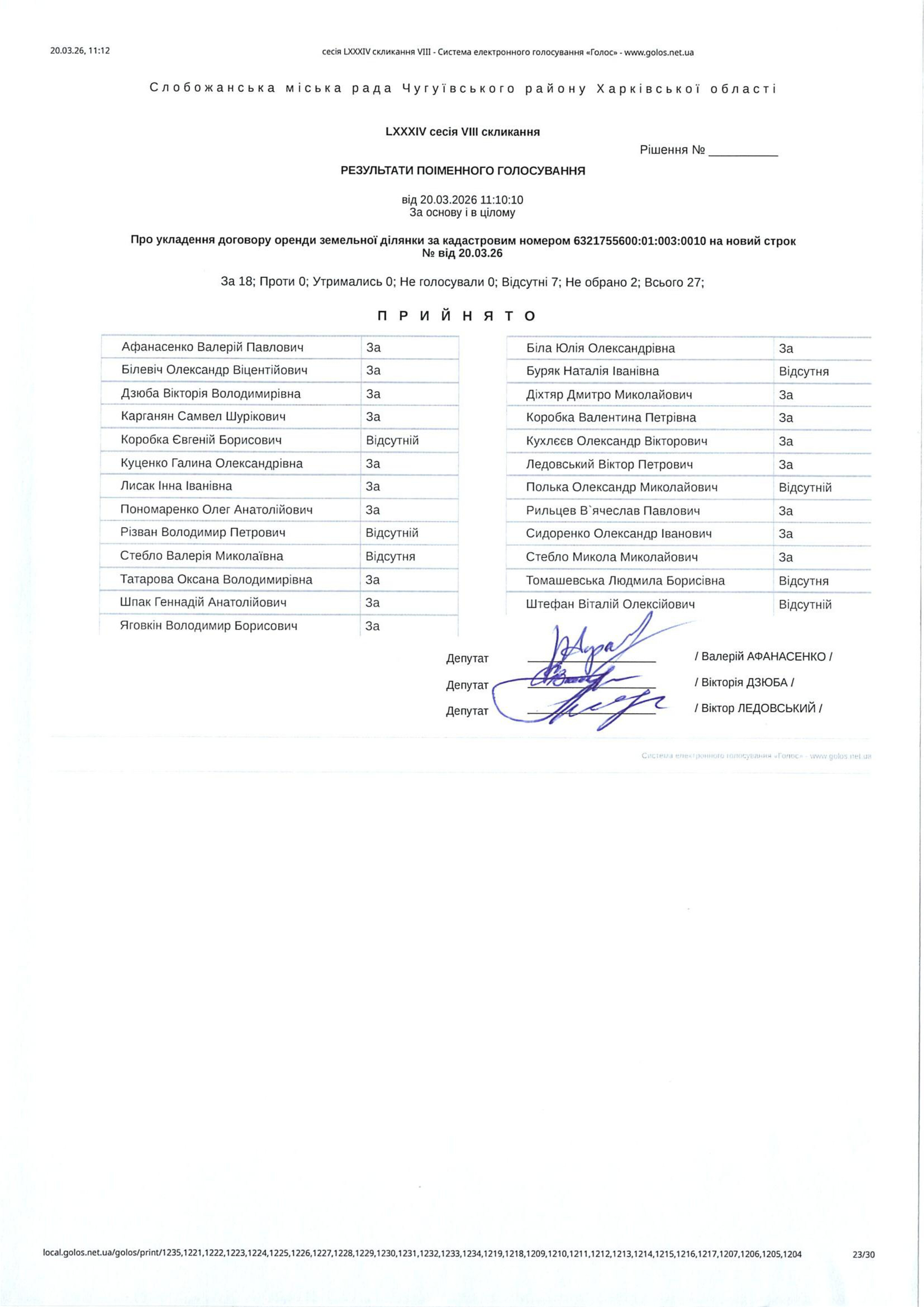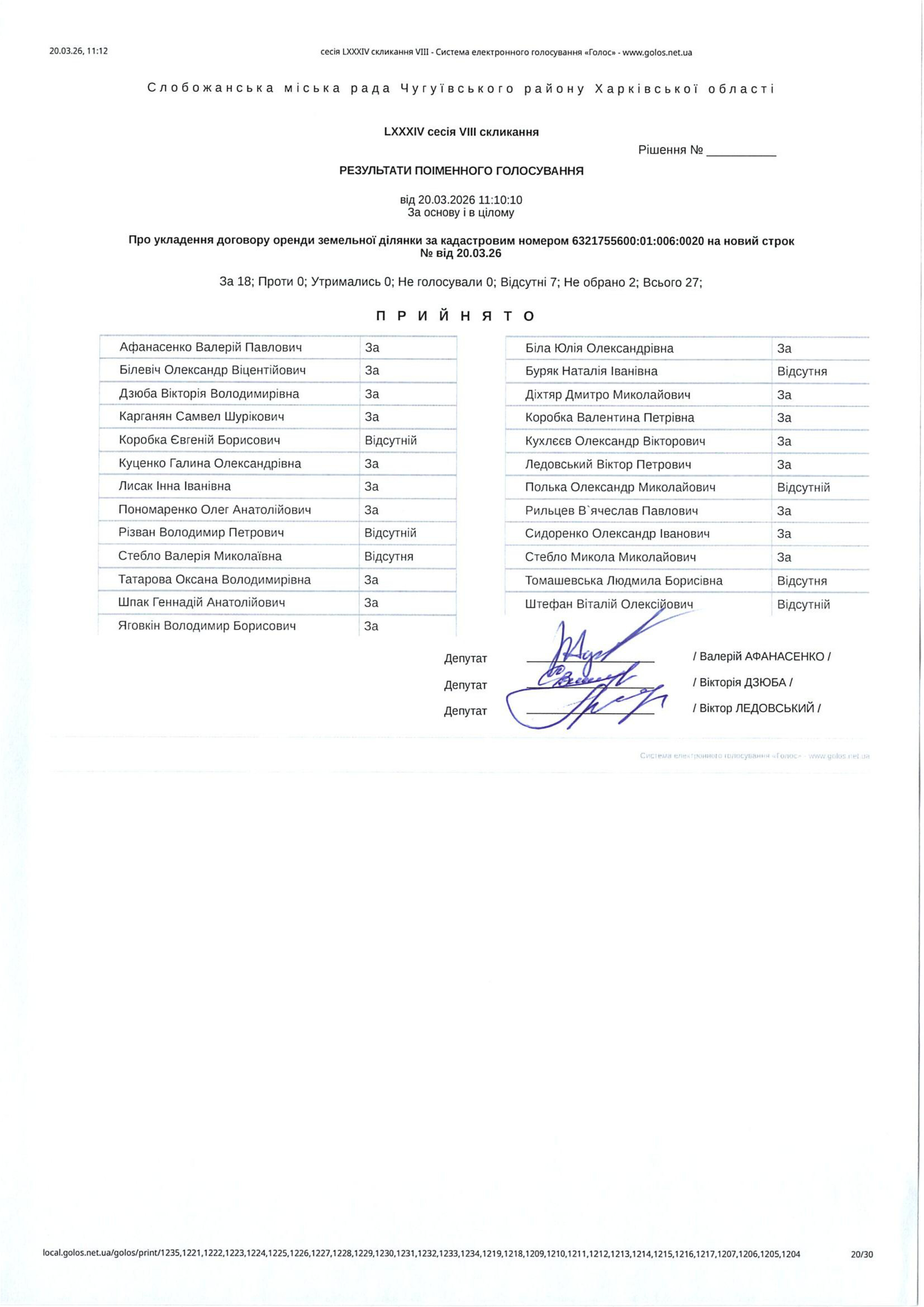 Відомість голосування до рішення сесії №3575 Про укладення договору оренди земельної ділянки за кадастровим номером 6321755600:01:006:0020 на новий строк