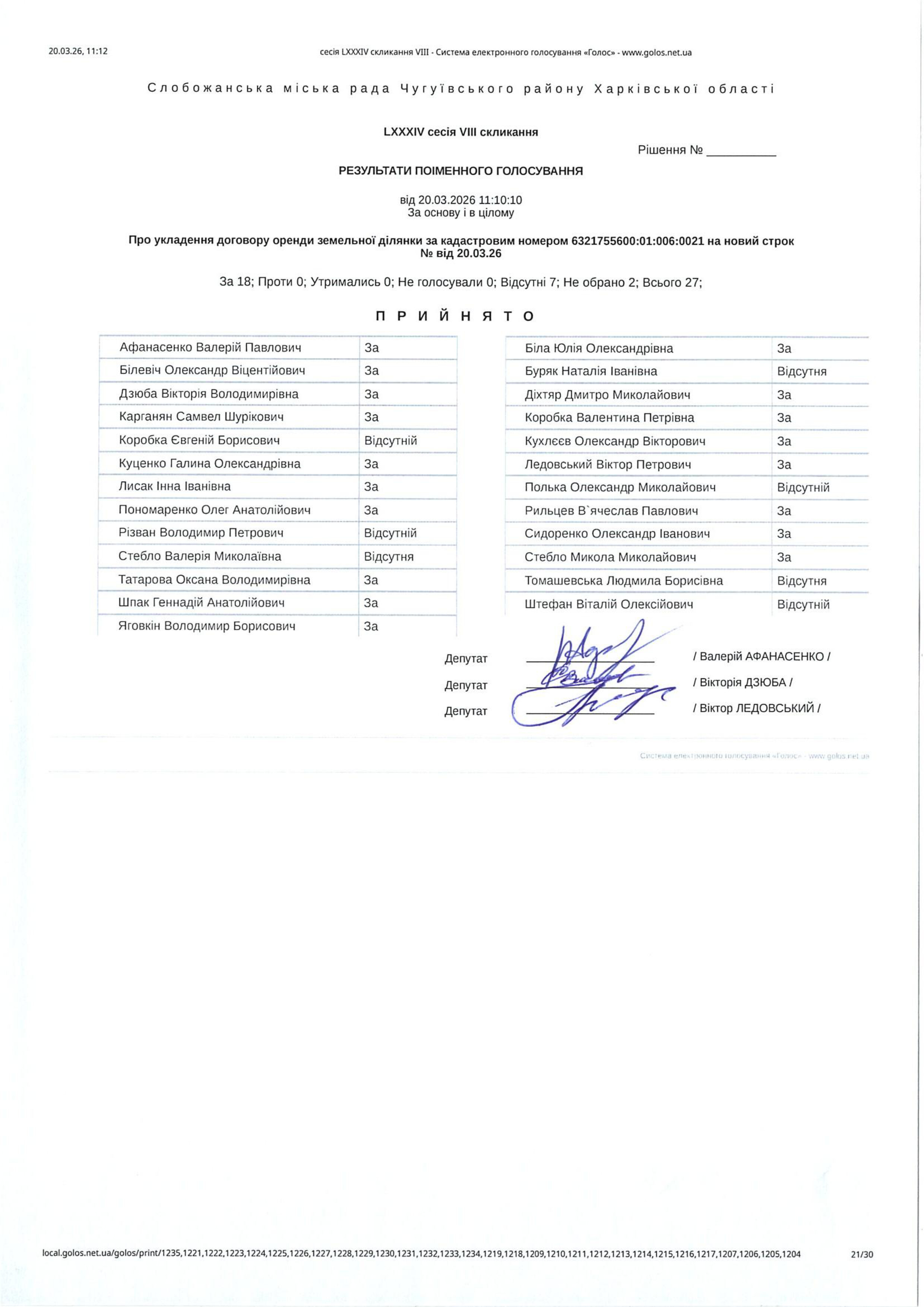 Відомість голосування до рішення сесії №3576 Про укладення договору оренди земельної ділянки за кадастровим номером 6321755600:01:006:0021 на новий строк