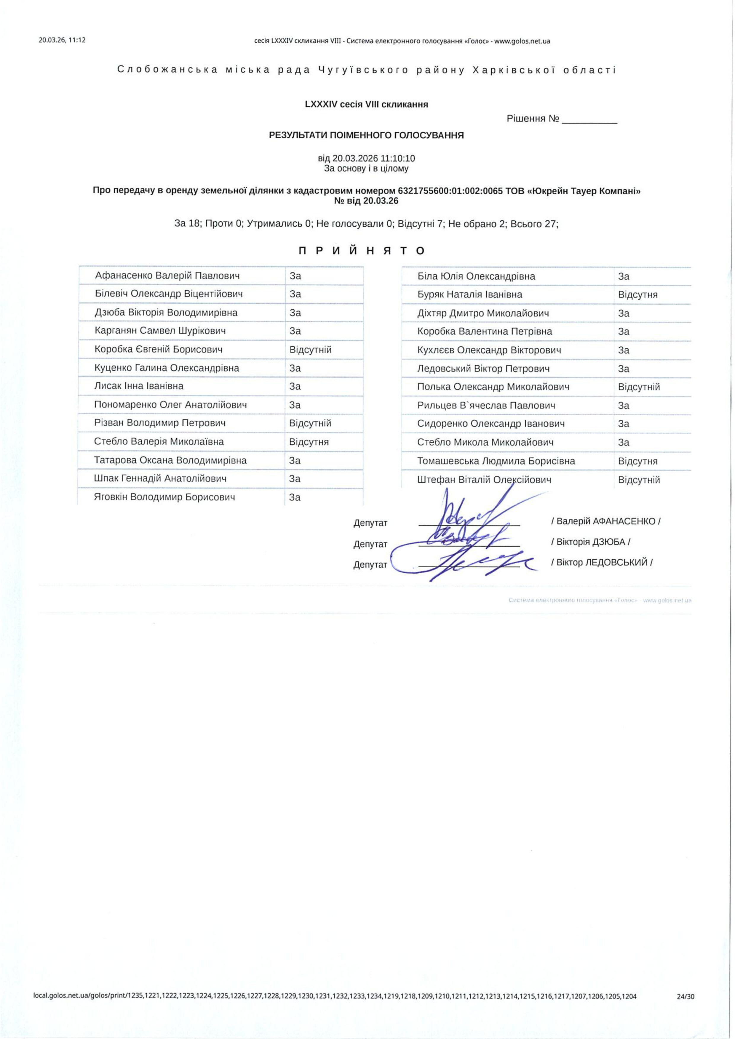 Відомість голосування до рішення сесії №3579 Про передачу в оренду земельної ділянки з кадастровим номером 6321755600:01:002:0065 ТОВ «Юкрейн Тауер Компані»