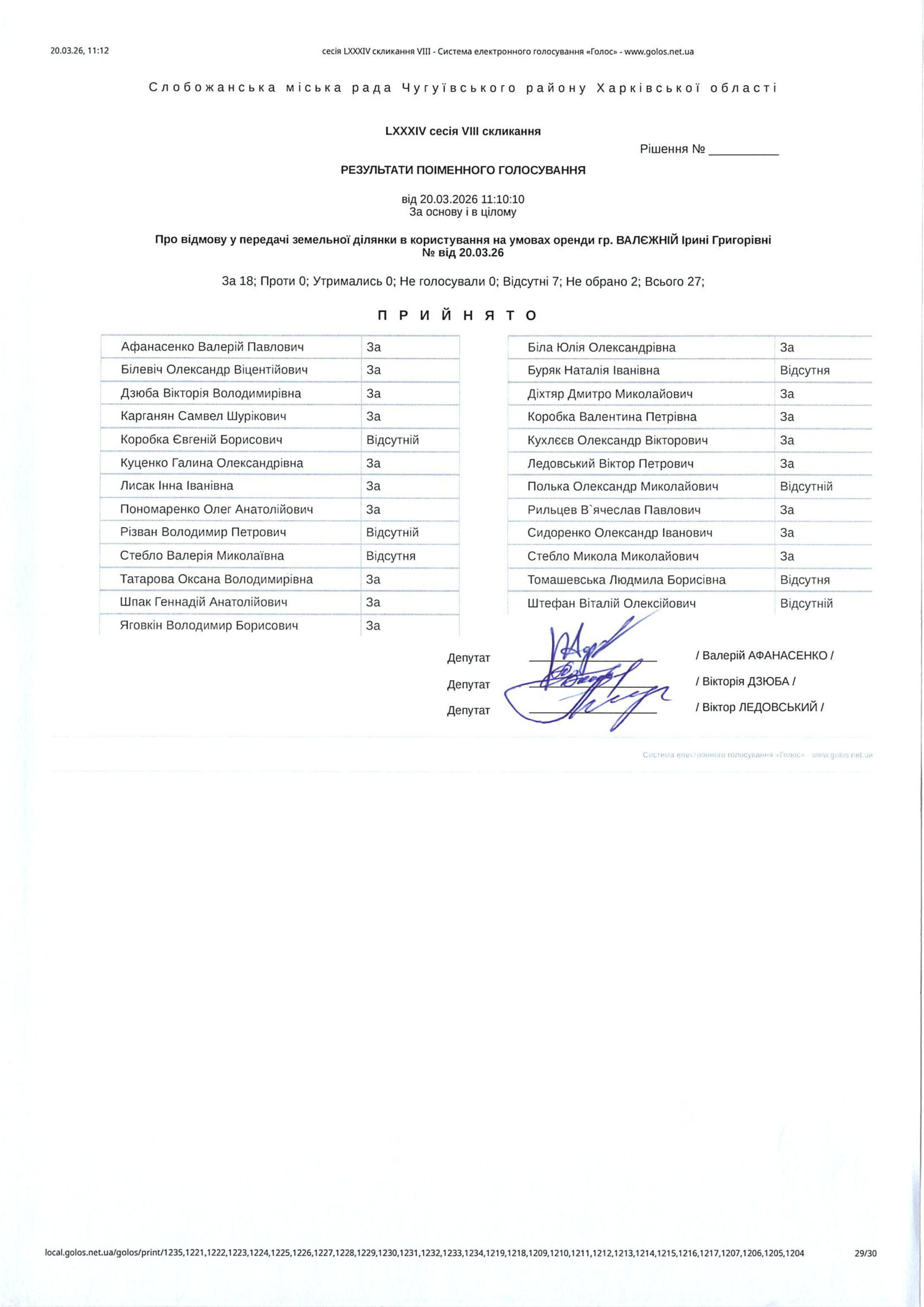 Відомість голосування до рішення сесії №3584 Про відмову у передачі земельної ділянки в користування на умовах оренди гр. ВАЛЄЖНІЙ Ірині Григорівні