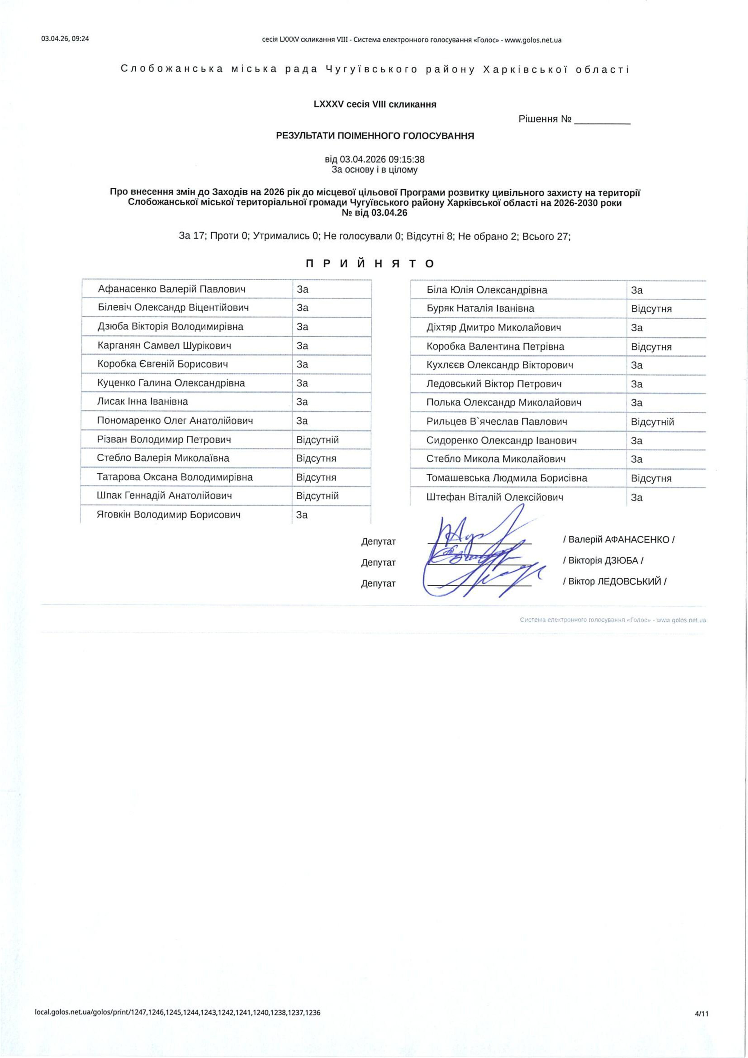 Відомість голосування до рішення сесії №3588 Про внесення змін до Заходів на 2026 рік до місцевої цільової Програми розвитку цивільного захисту на території Слобожанської міської територіальної громади Чугуївського району Харківської області на 2026-2030 роки