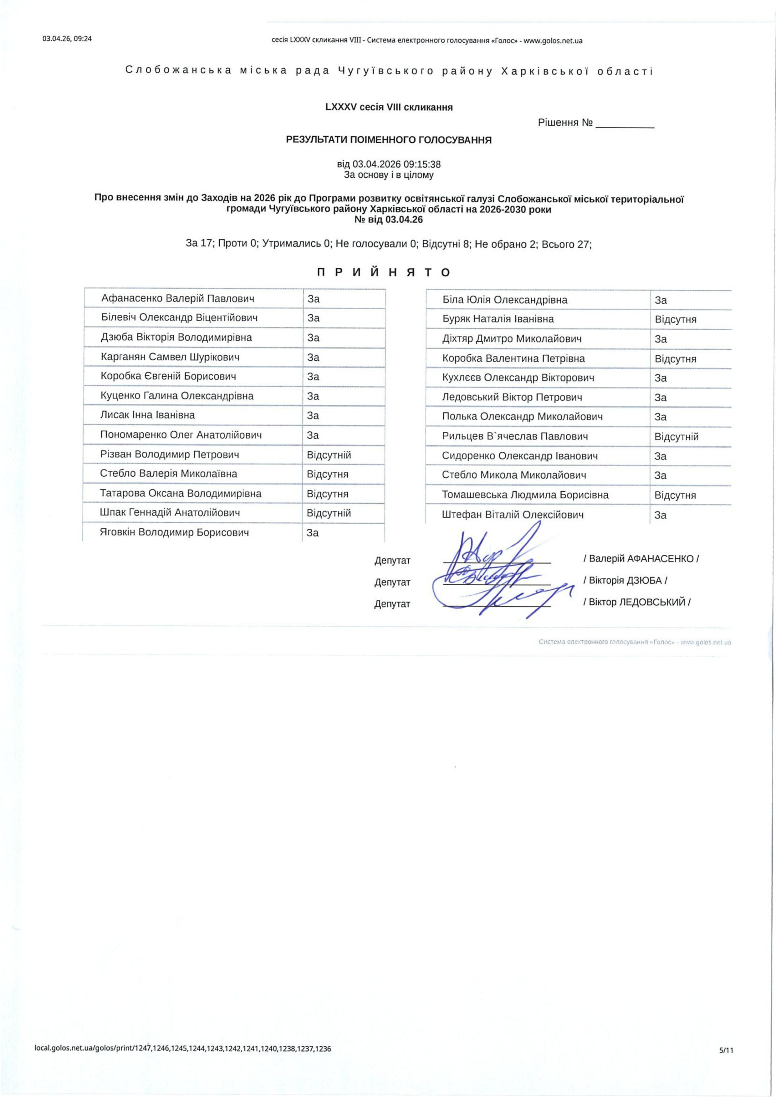 Відомість голосування до рішення сесії №3589 Про внесення змін до Заходів на 2026 рік до Програми розвитку освітянської галузі Слобожанської міської територіальної громади Чугуївського району Харківської області на 2026-2030 роки