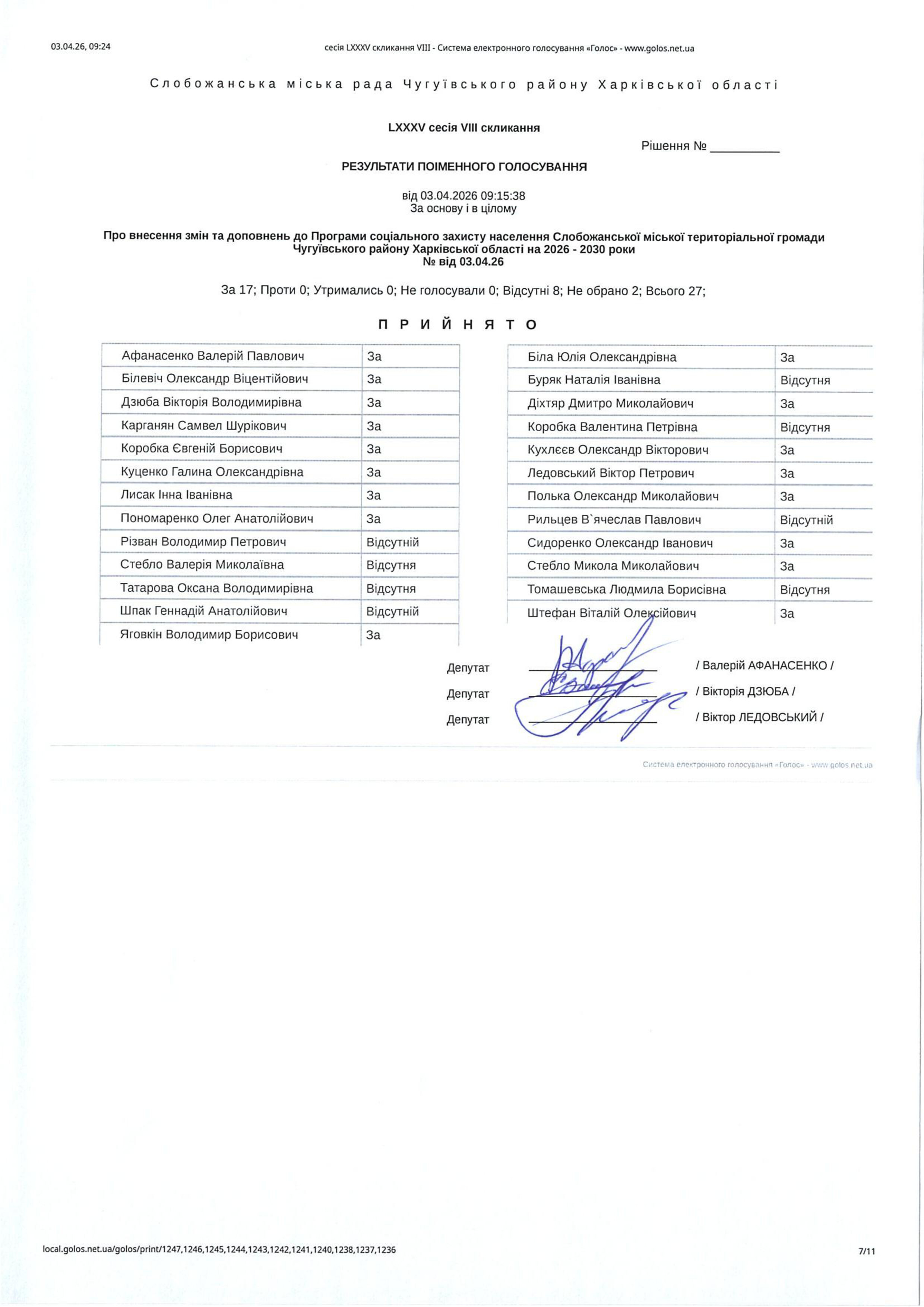 Відомість голосування до рішення сесії №3591 Про внесення змін та доповнень до Програми соціального захисту населення Слобожанської міської територіальної громади Чугуївського району Харківської області на 2026 - 2030 роки