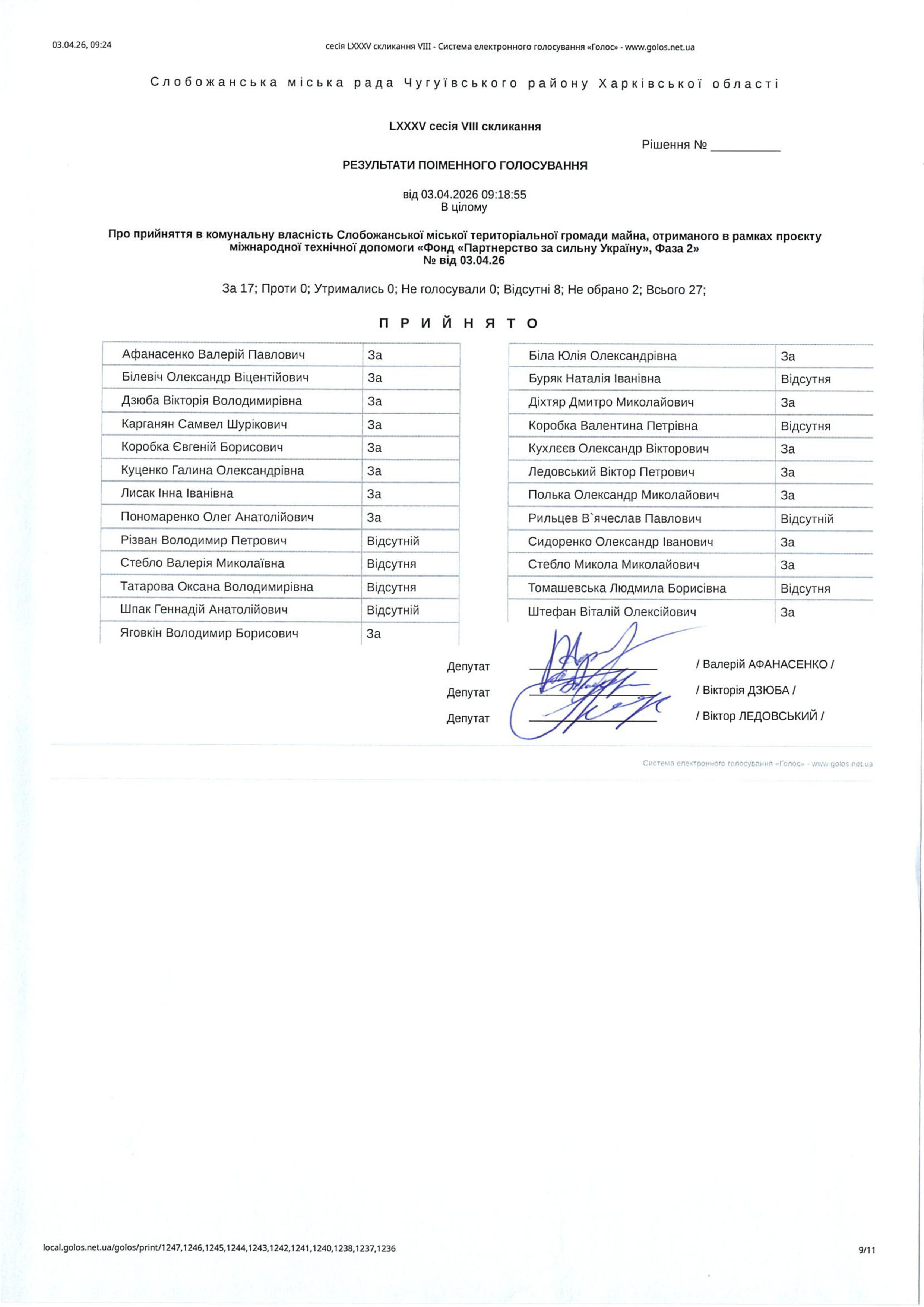 Відомість голосування до рішення сесії №3593 Про прийняття в комунальну власність Слобожанської міської територіальної громади майна, отриманого в рамках проєкту міжнародної технічної допомоги «Фонд «Партнерство за сильну Україну», Фаза 2»