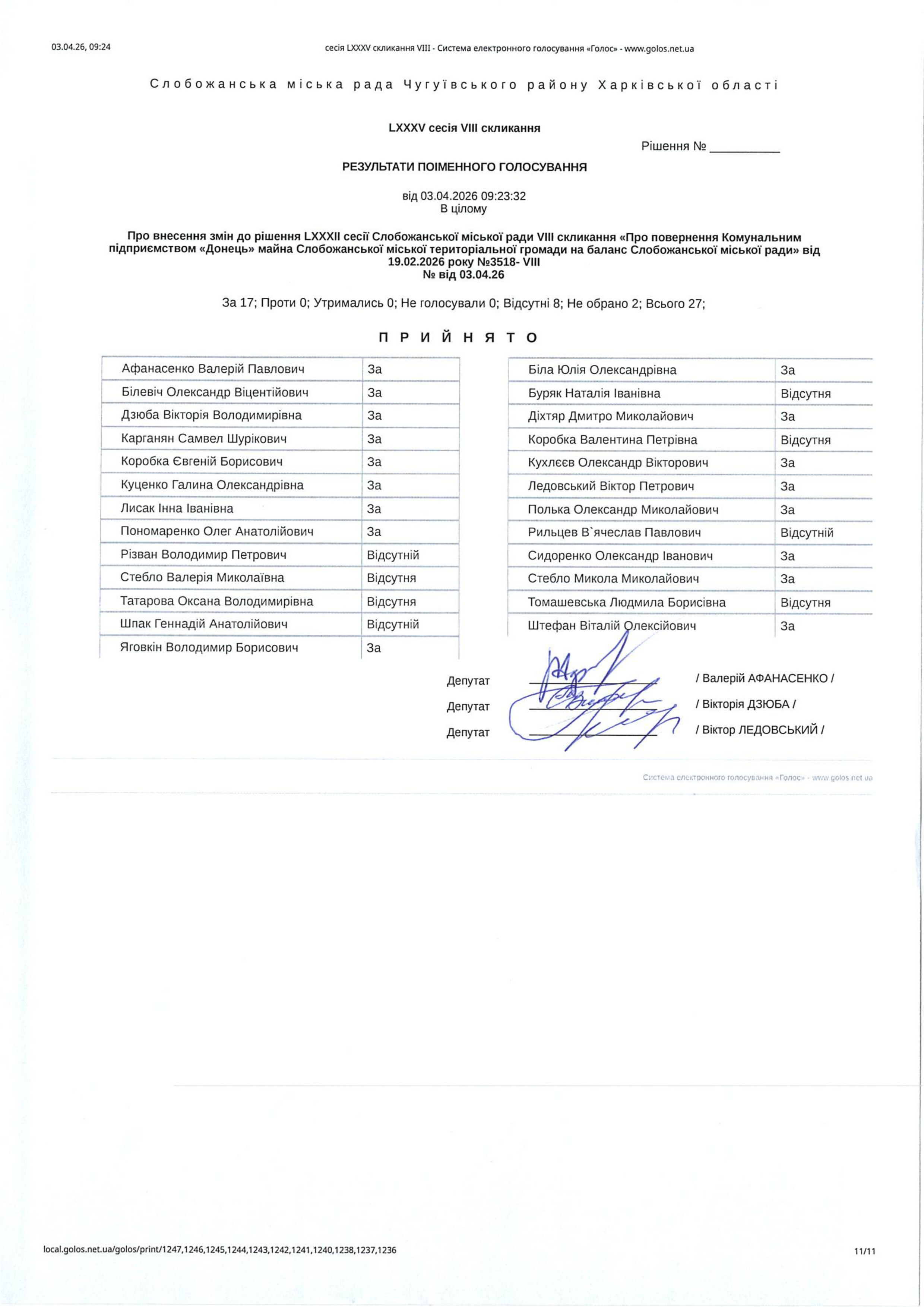 Відомість голосування до рішення сесії №3595 Про внесення змін до рішення LXXXII сесії Слобожанської міської ради VIIІ скликання «Про повернення Комунальним підприємством «Донець» майна Слобожанської міської територіальної громади на баланс Слобожанської міської ради» від 19.02.2026 року №3518- VIIІ