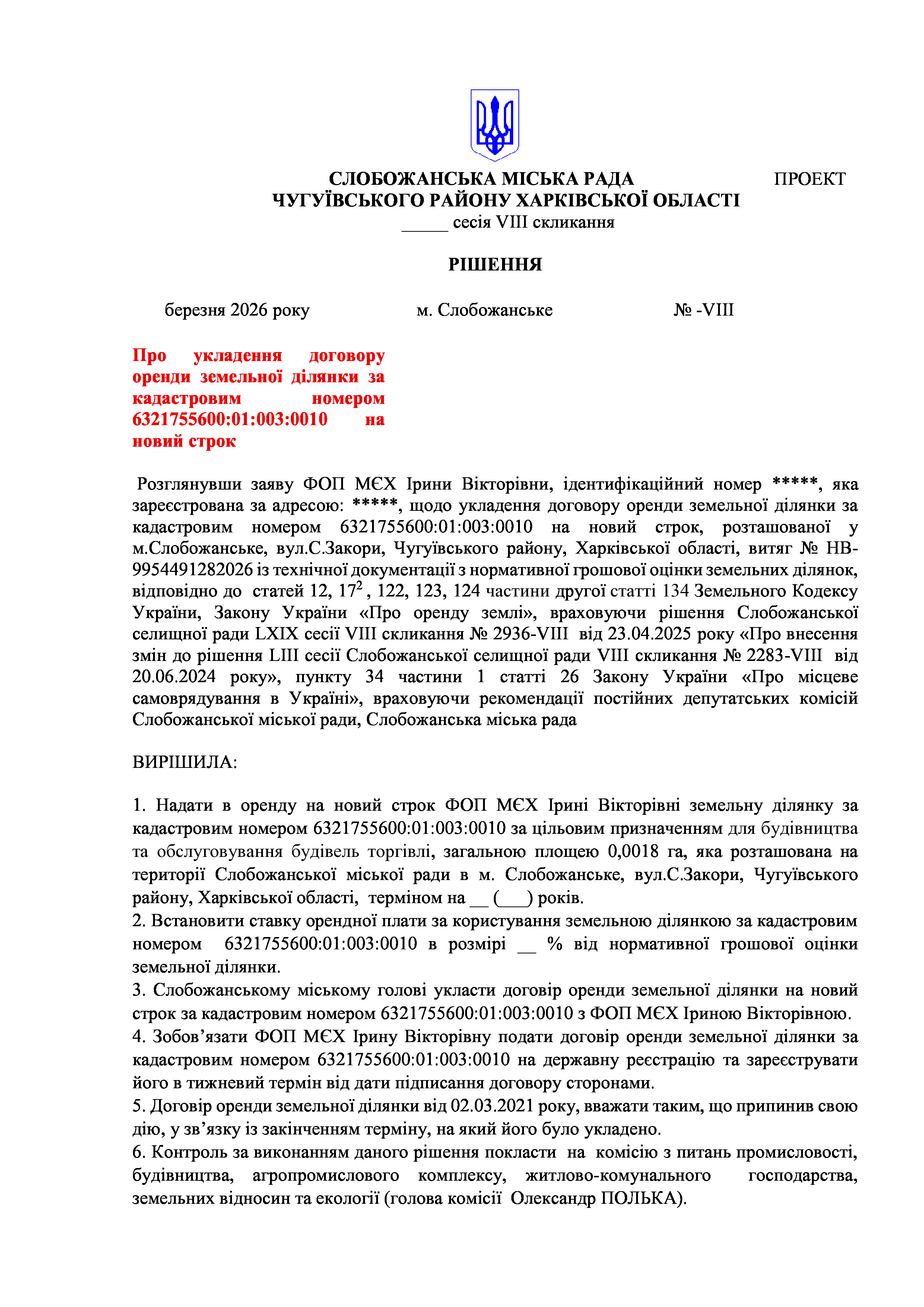 ПРОЄКТ рішення сесії №22 Про укладення договору оренди земельної ділянки за кадастровим номером 6321755600:01:003:0010 на новий строк