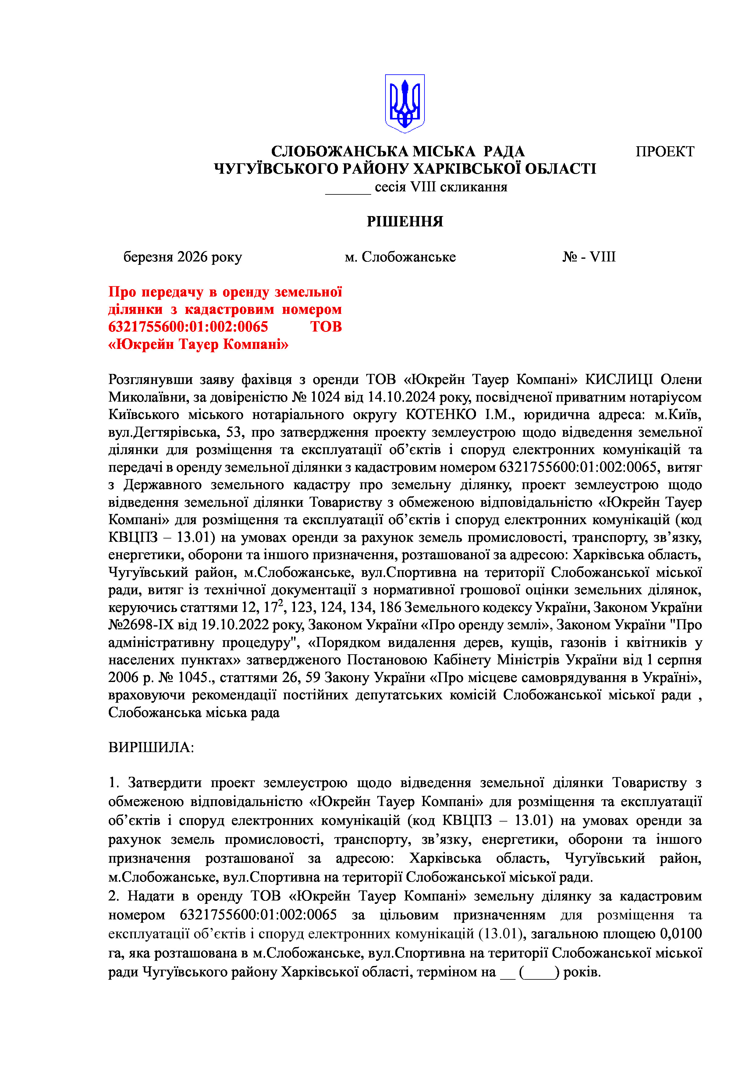 ПРОЄКТ рішення сесії №23 Про передачу в оренду земельної ділянки з кадастровим номером 6321755600:01:002:0065 ТОВ «Юкрейн Тауер Компані»
