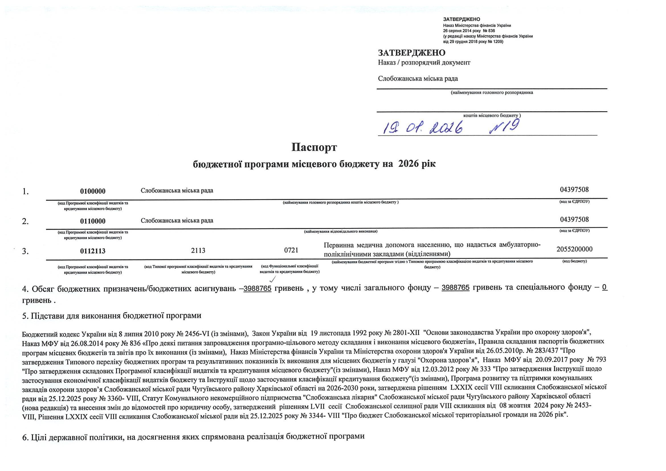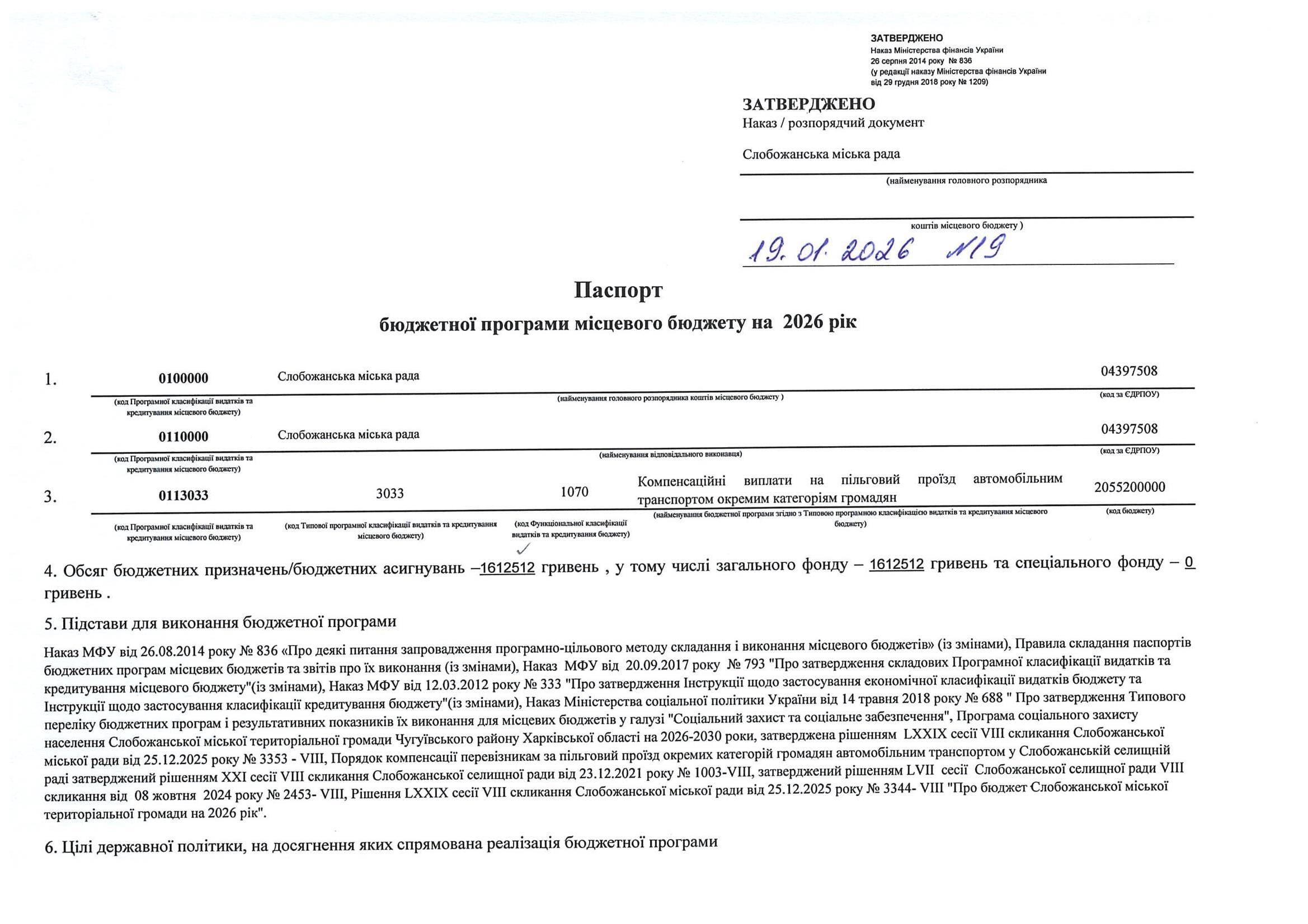 Паспорт бюджетної програми місцевого бюджету ТПКВКМБ 0112113