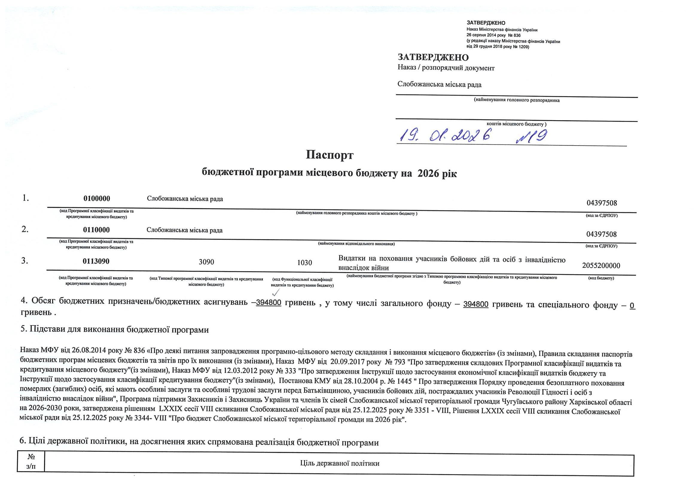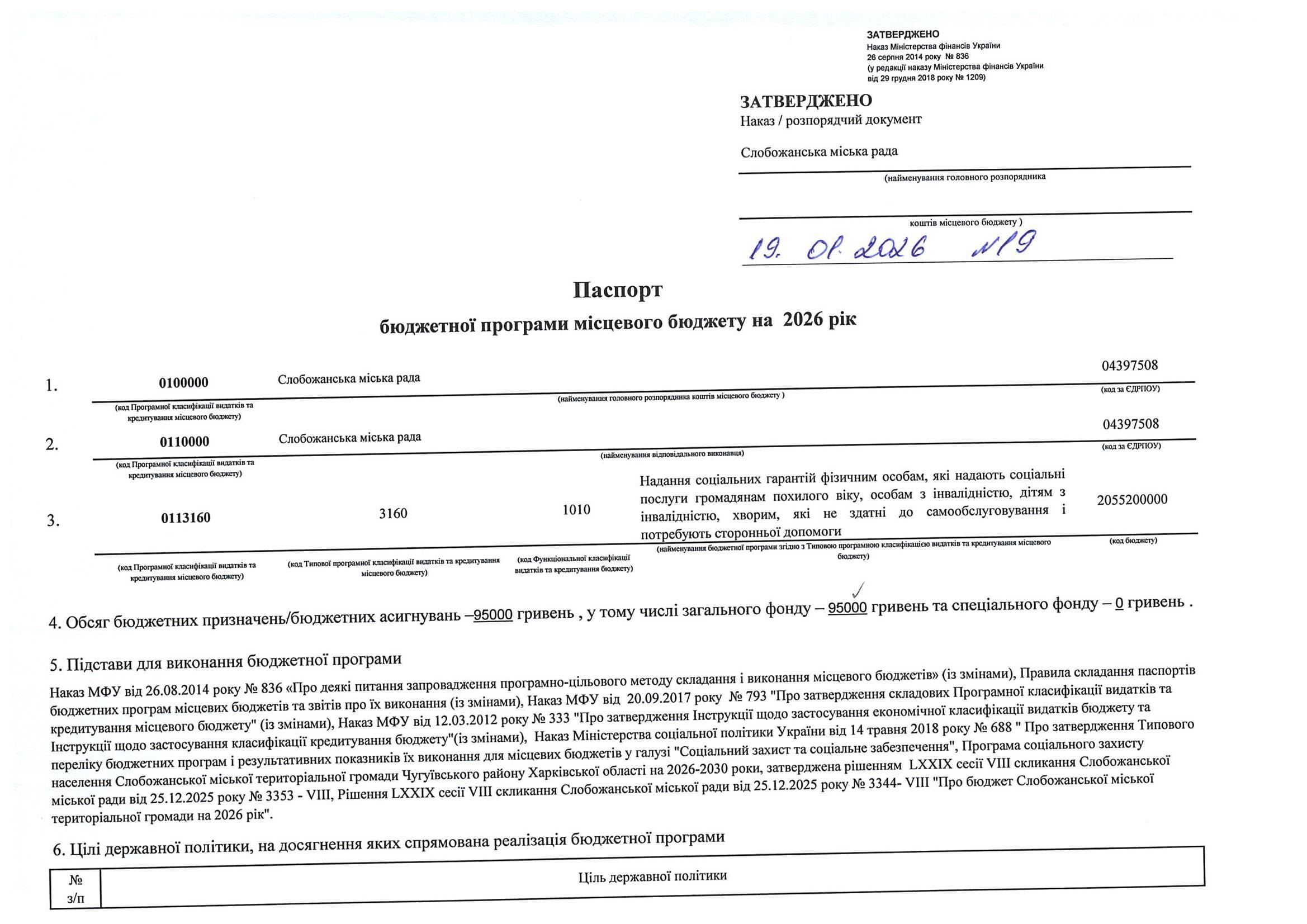 Паспорт бюджетної програми місцевого бюджету ТПКВКМБ 0113160