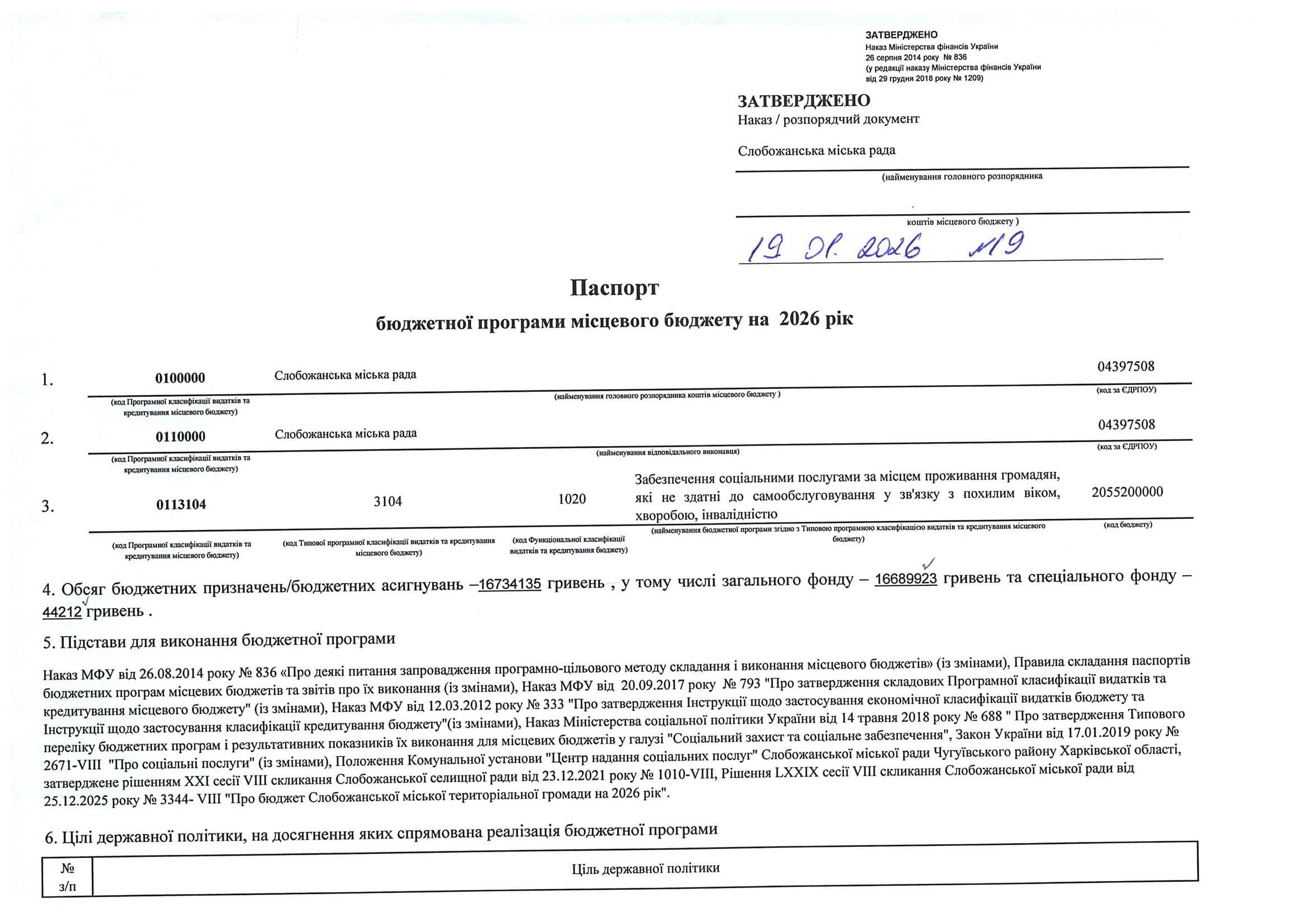 Паспорт бюджетної програми місцевого бюджету ТПКВКМБ 0113104