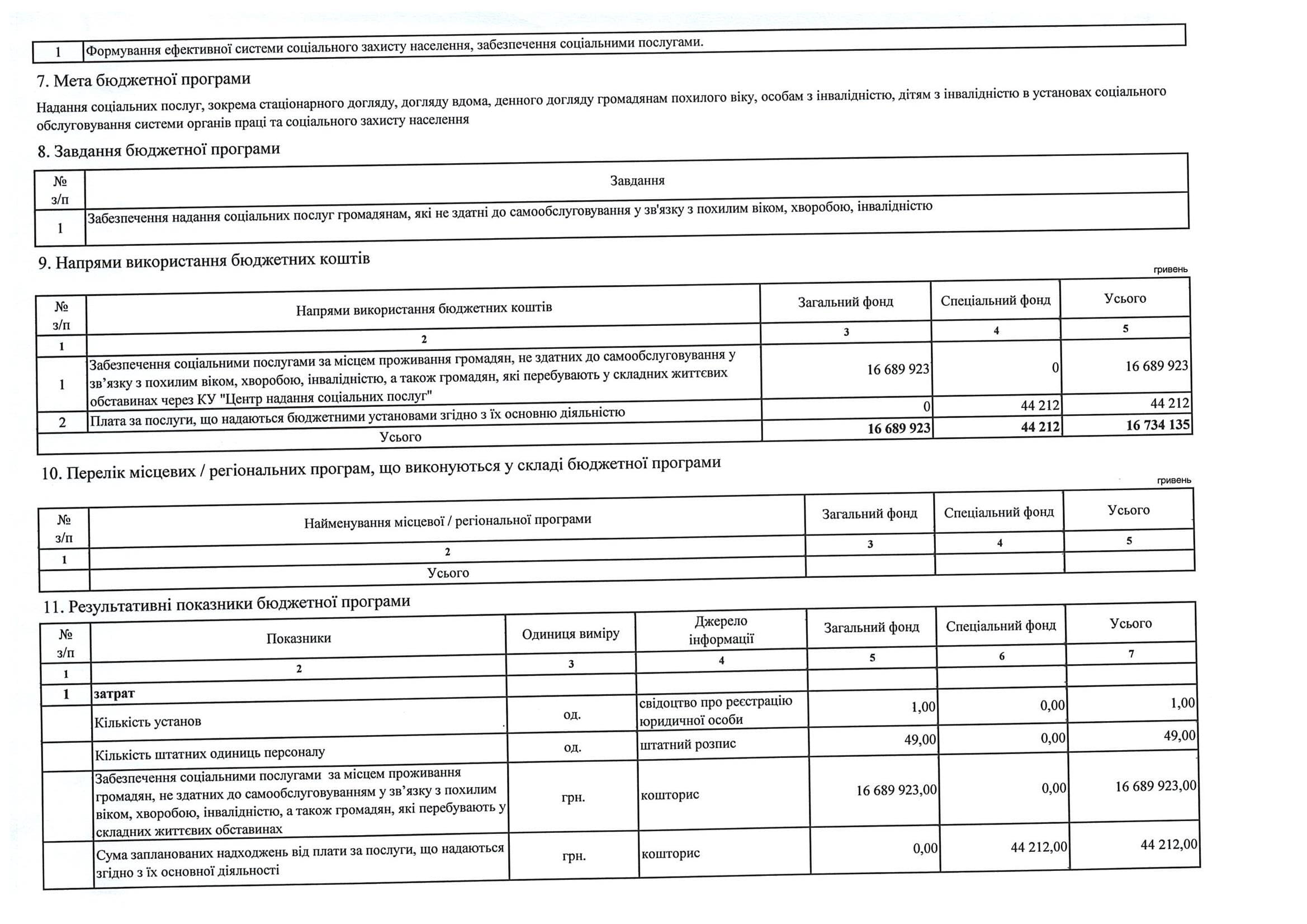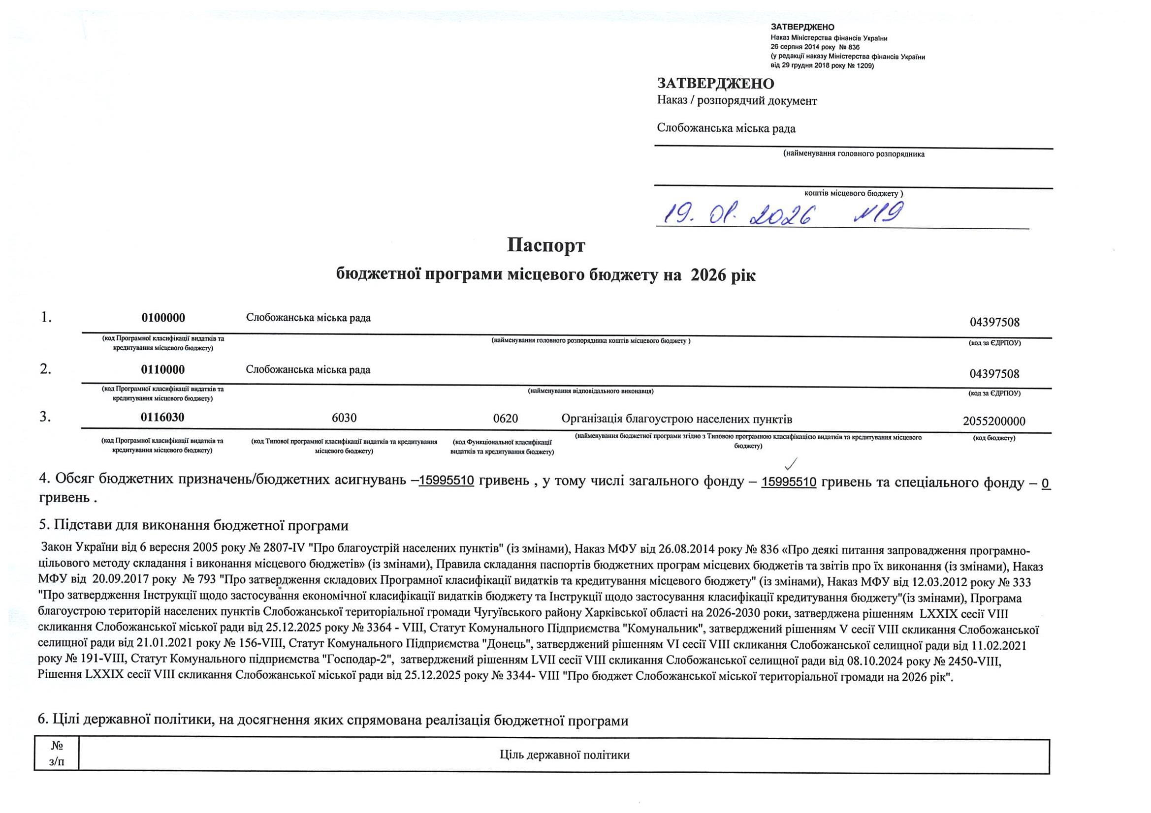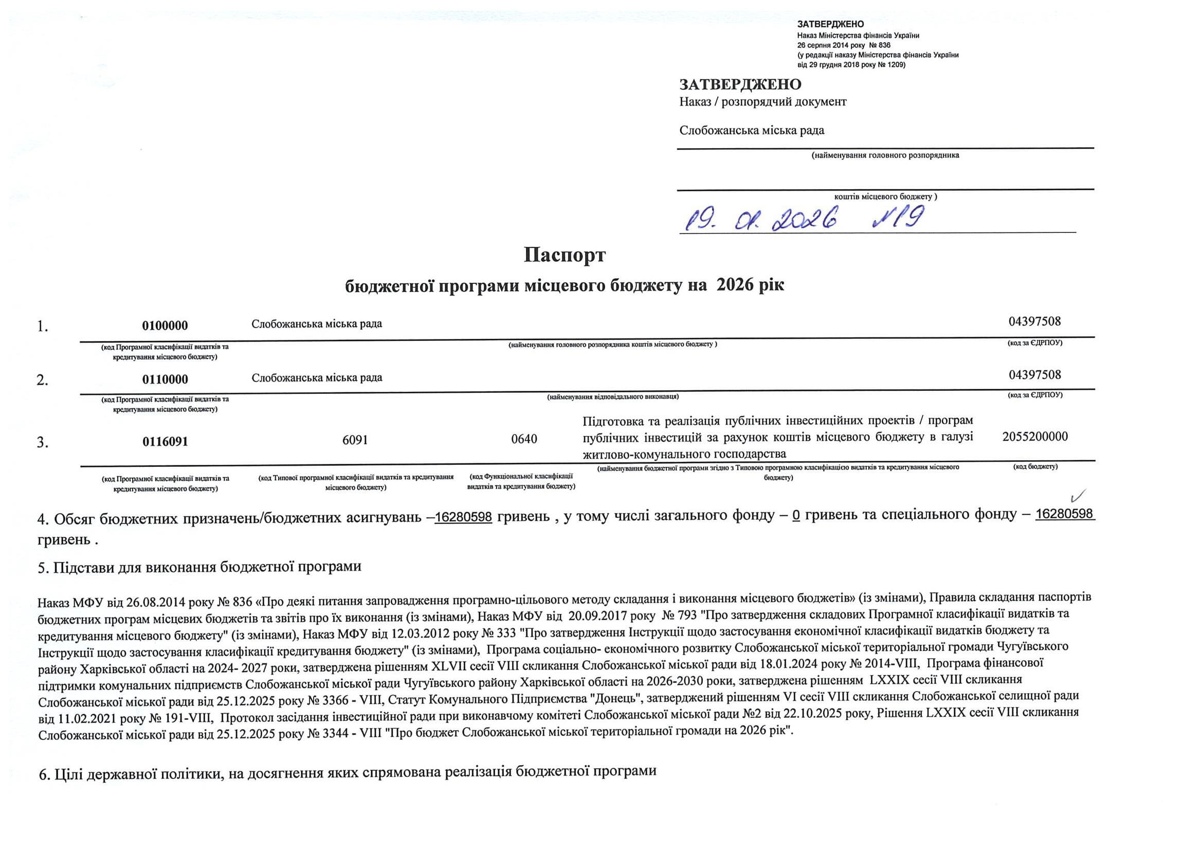 Паспорт бюджетної програми місцевого бюджету ТПКВКМБ 0116091