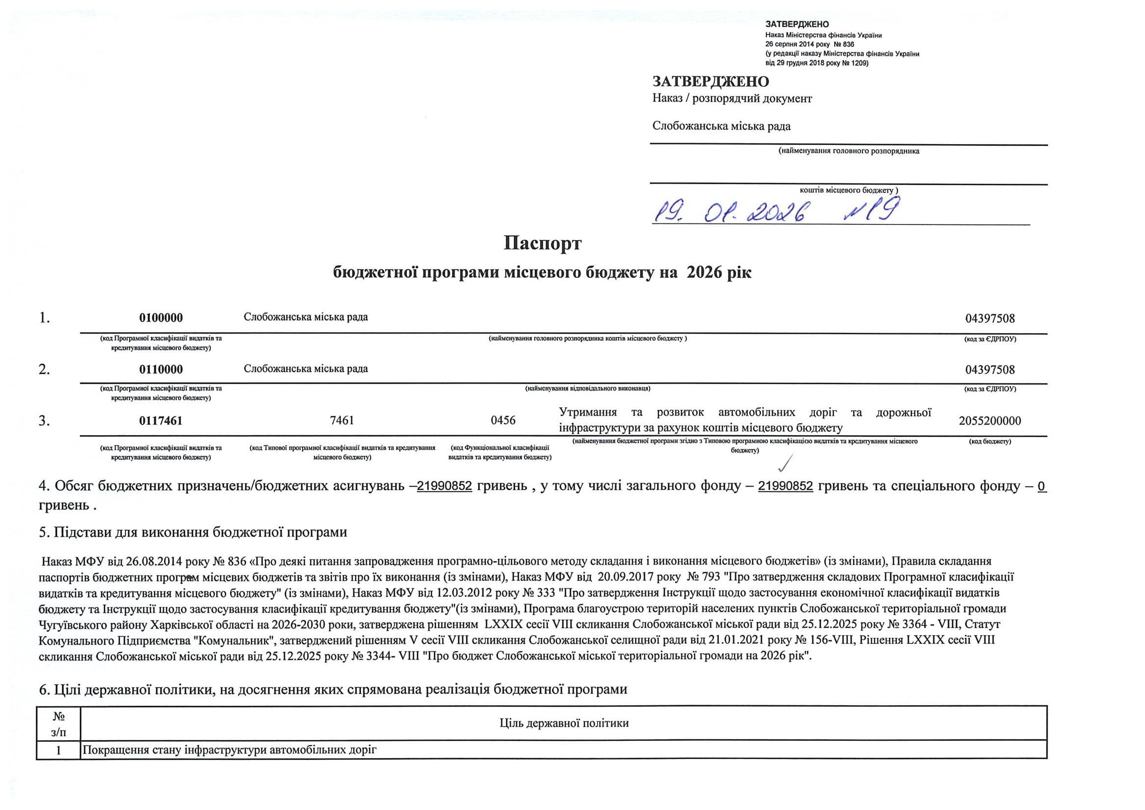 Паспорт бюджетної програми місцевого бюджету ТПКВКМБ 0117461