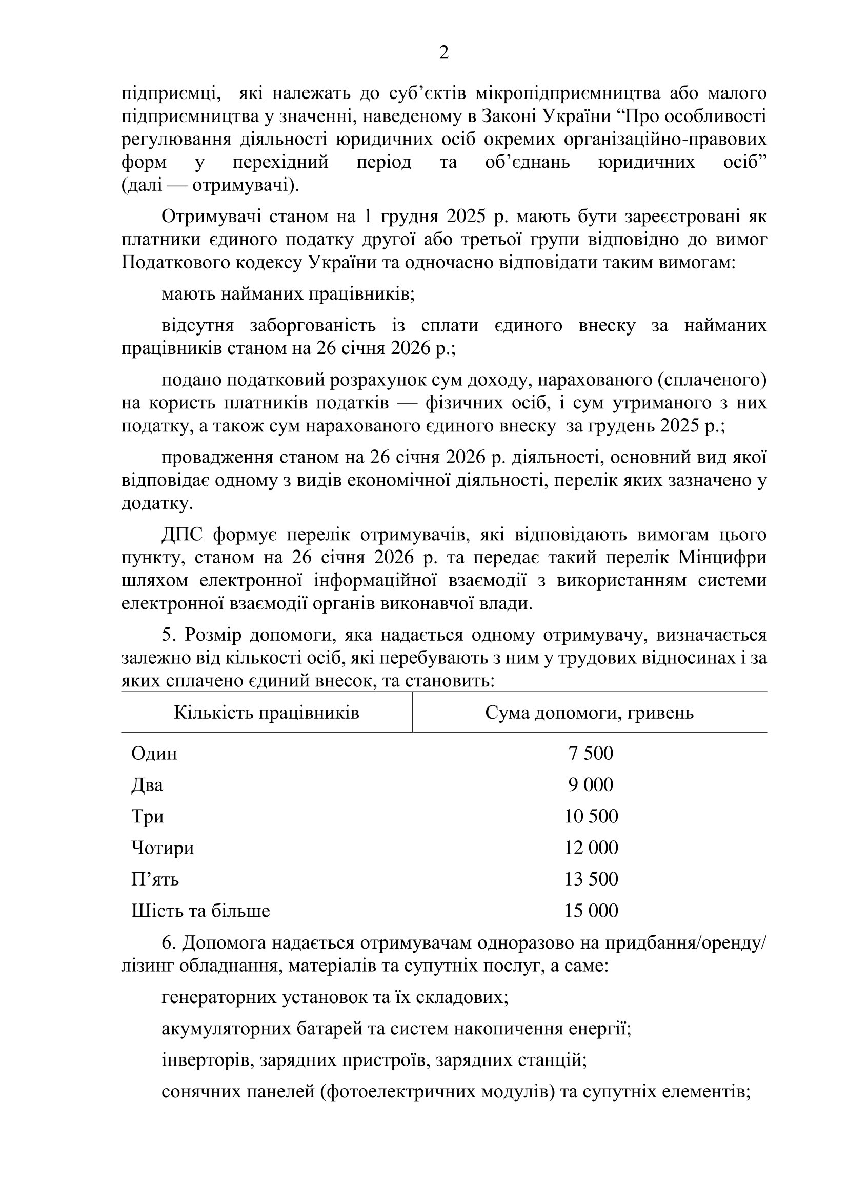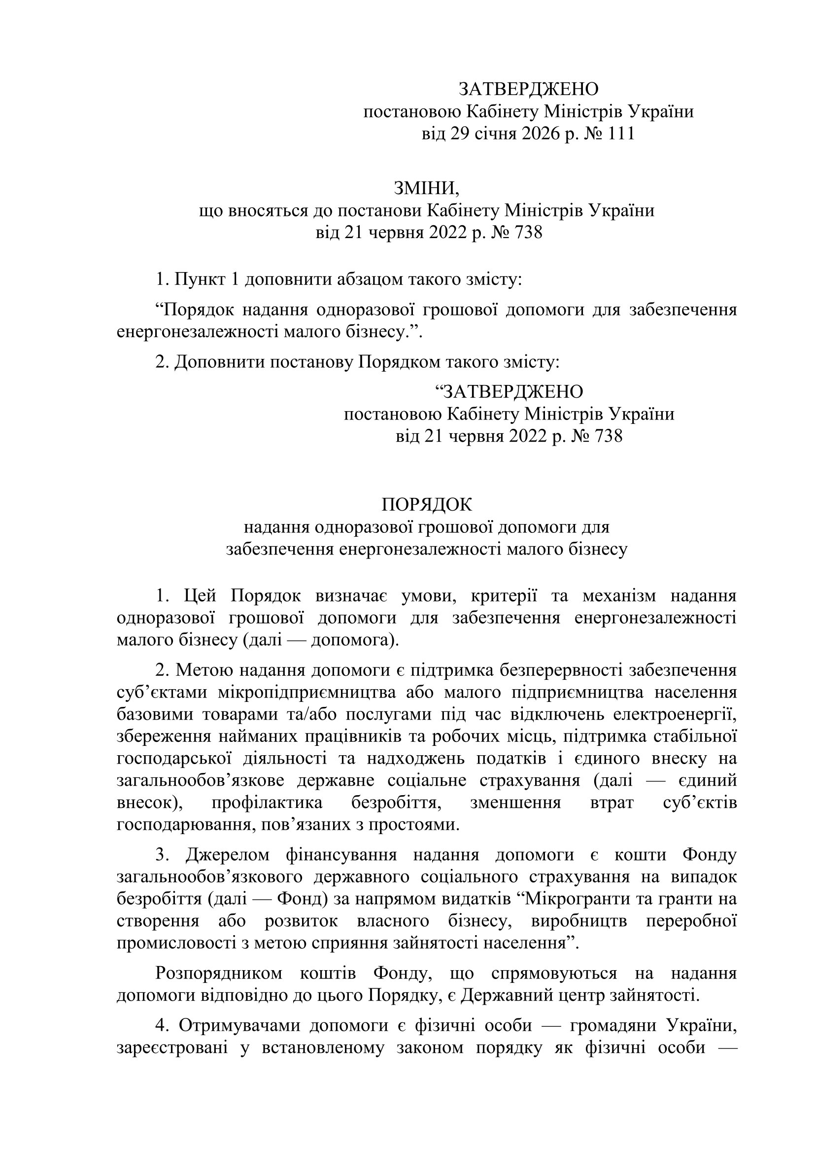 Харківський обласний центр зайнятості Чугуївська філія Харківського обласного центру зайнятості Зміївське управління повідомляє інформацію про надання одноразової грошової допомоги для забезпечення енергонезалежності малого бізнесу, згідно Постанови Кабінету Міністрів України від 29.01.2026 р. № 111: