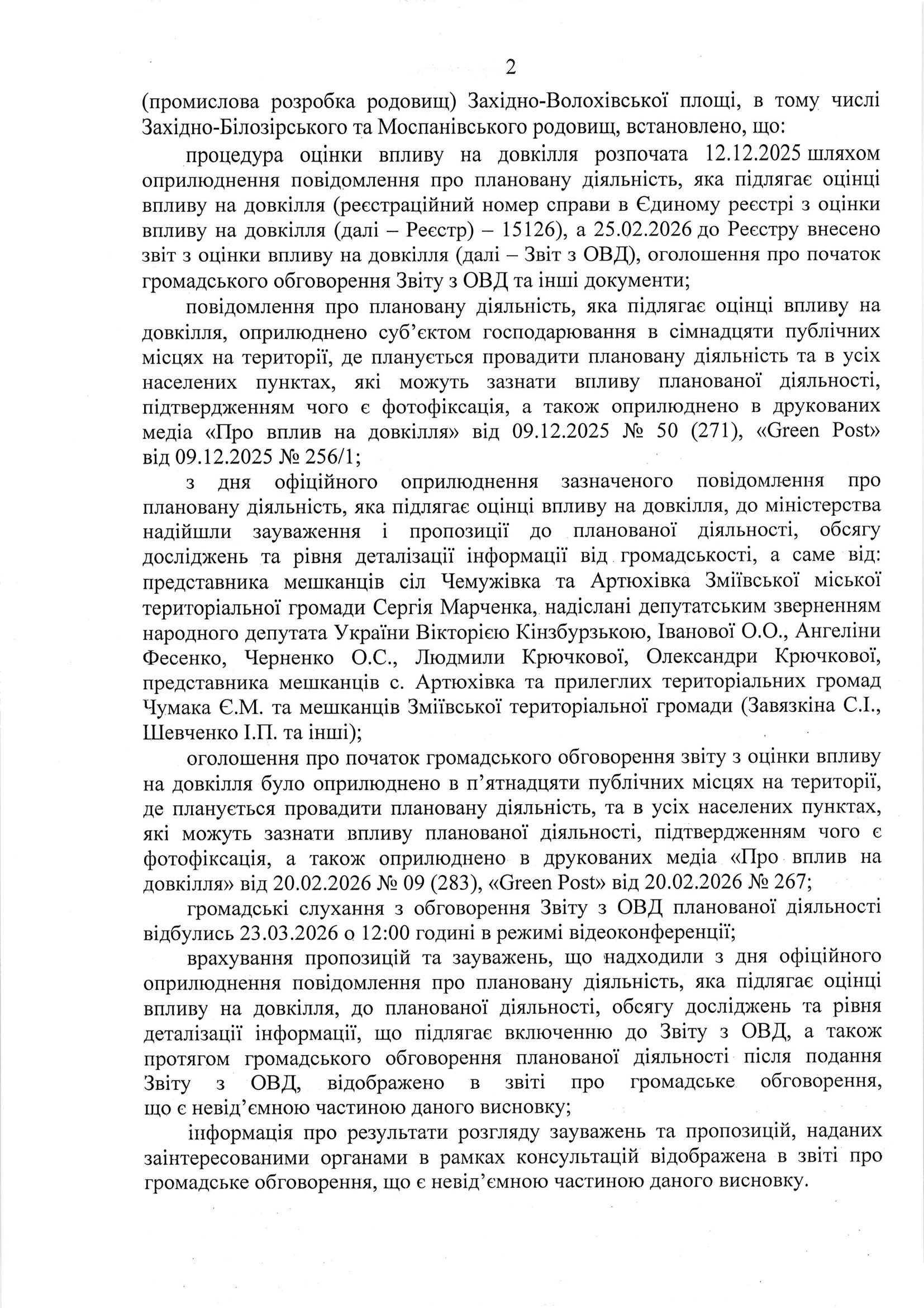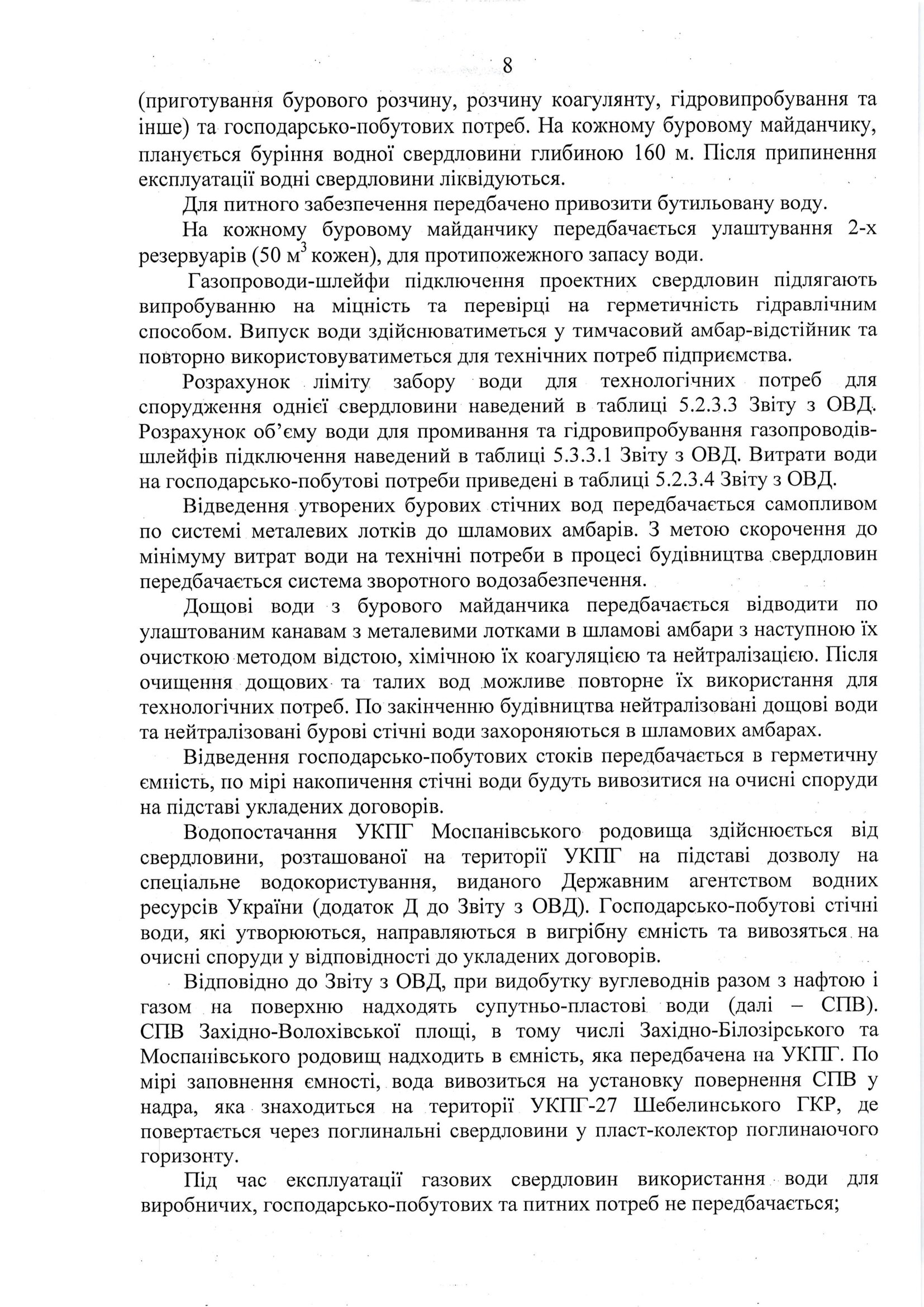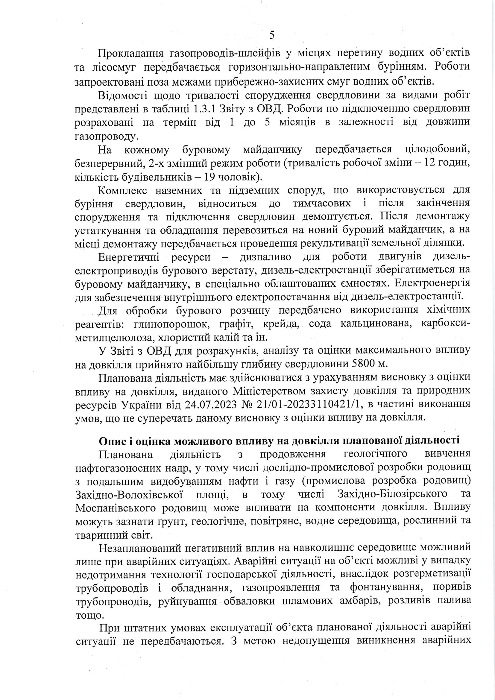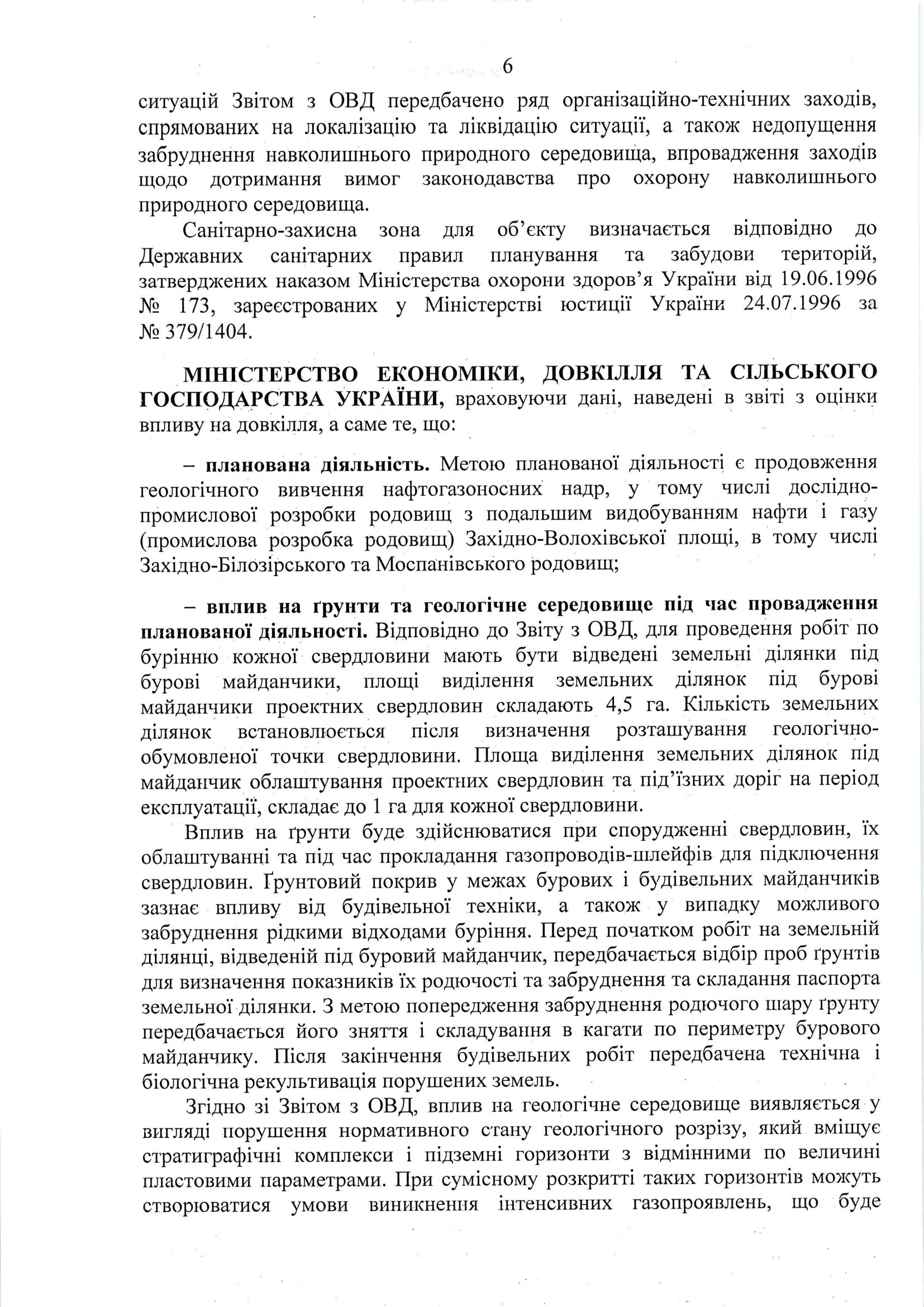 ВИСНОВОК з оцінки впливу на довкілля планованої діяльності «Продовження геологічного вивченнянафтогазоносних надр, у тому числі дослідно-промислової розробки родовищ з подальшим видобуванням нафти і газу (промислова розроб кародовищ) Західно-Волохівської площі, в тому числі Західно-Білозірського та Моспанівського родовищ AT «Укргазвидобування» код ЄДРПОУ 30019775»