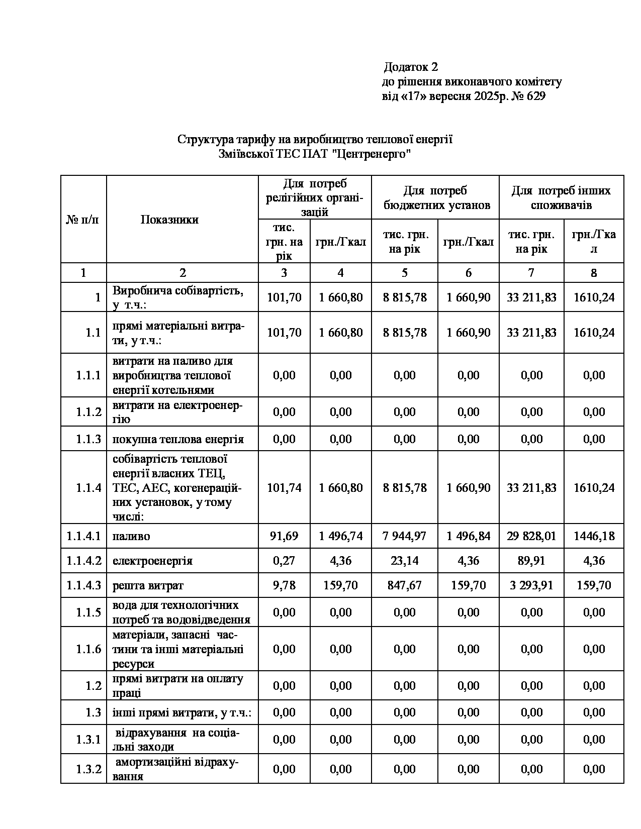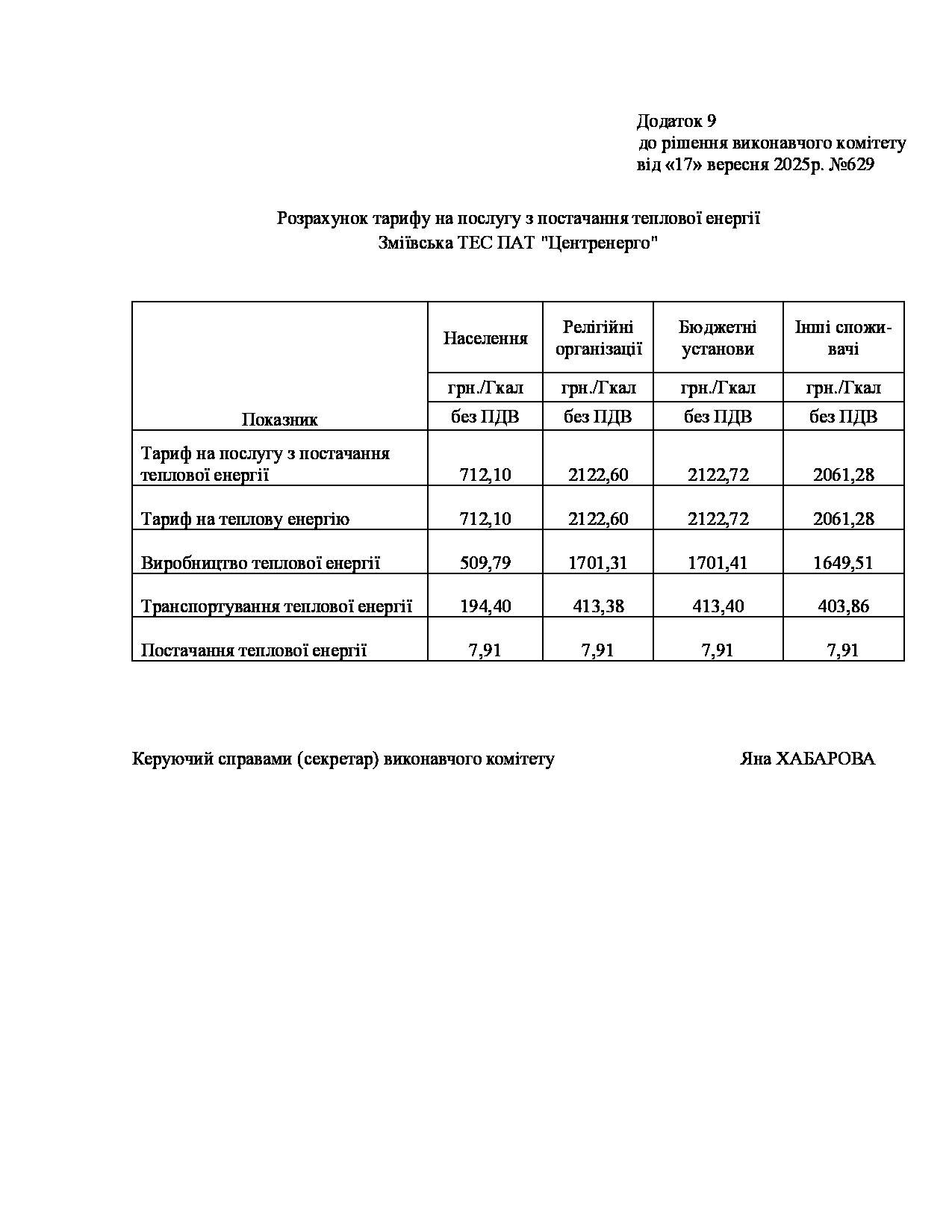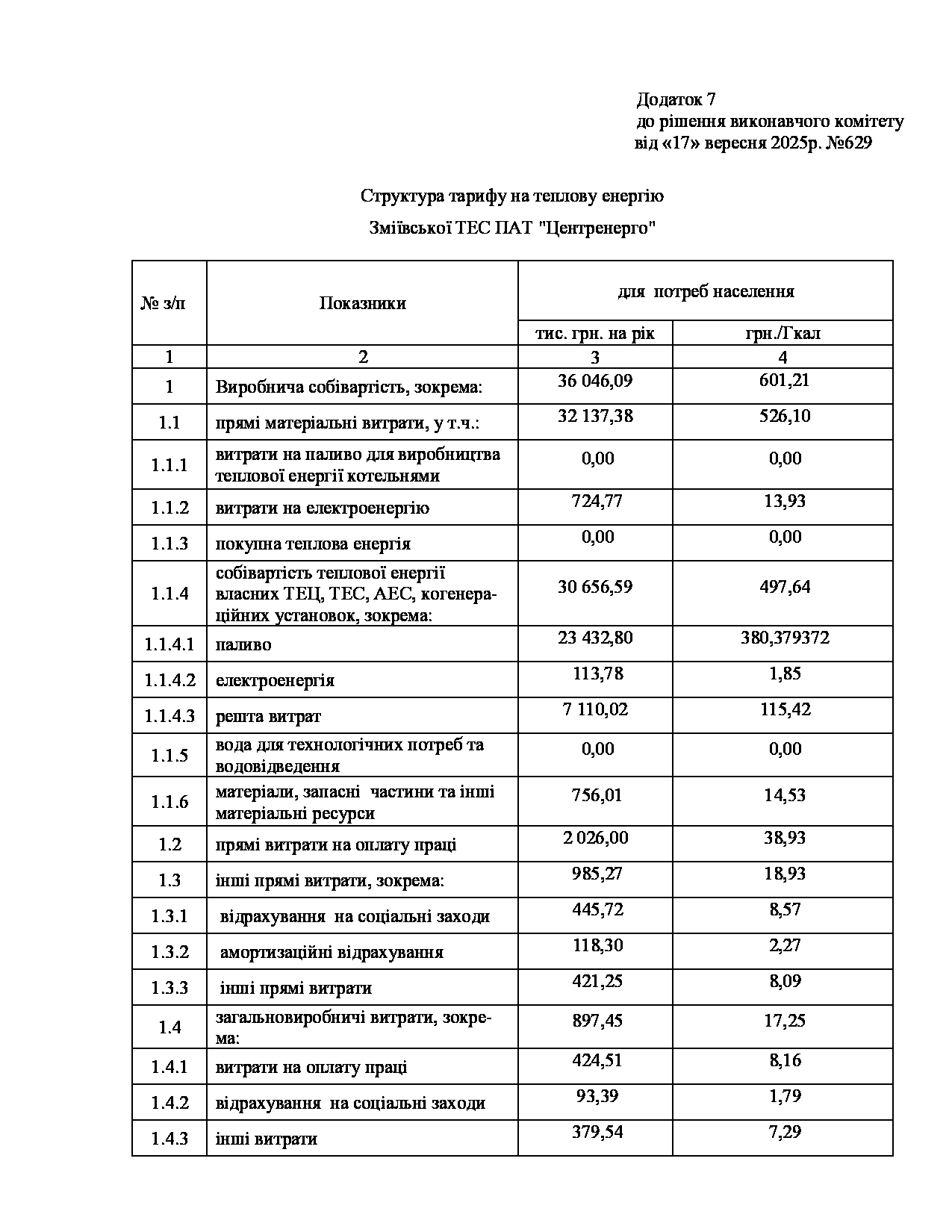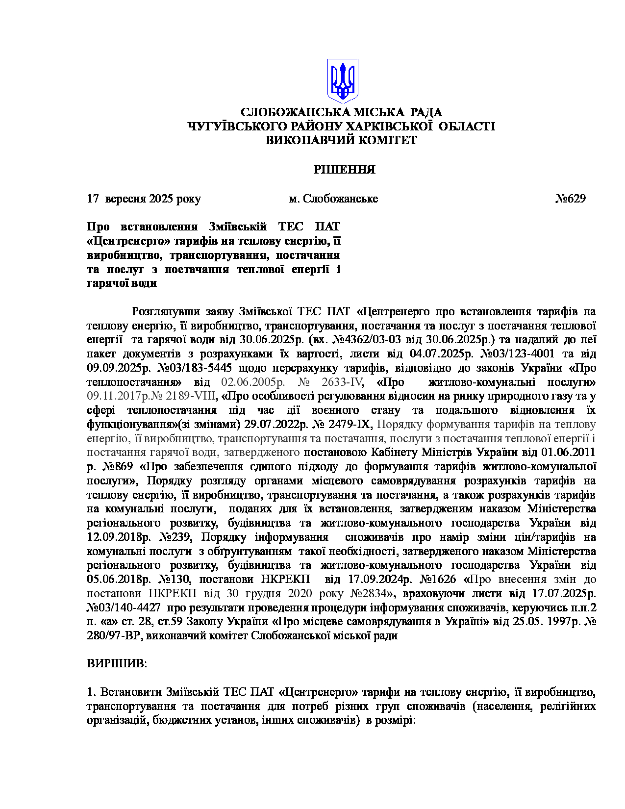 Рішення виконавчого комітету №629 Про встановлення Зміївській ТЕС ПАТ «Центренерго» тарифів на теплову енергію, її виробництво, транспортування, постачання та послуг з постачання теплової енергії і гарячої води