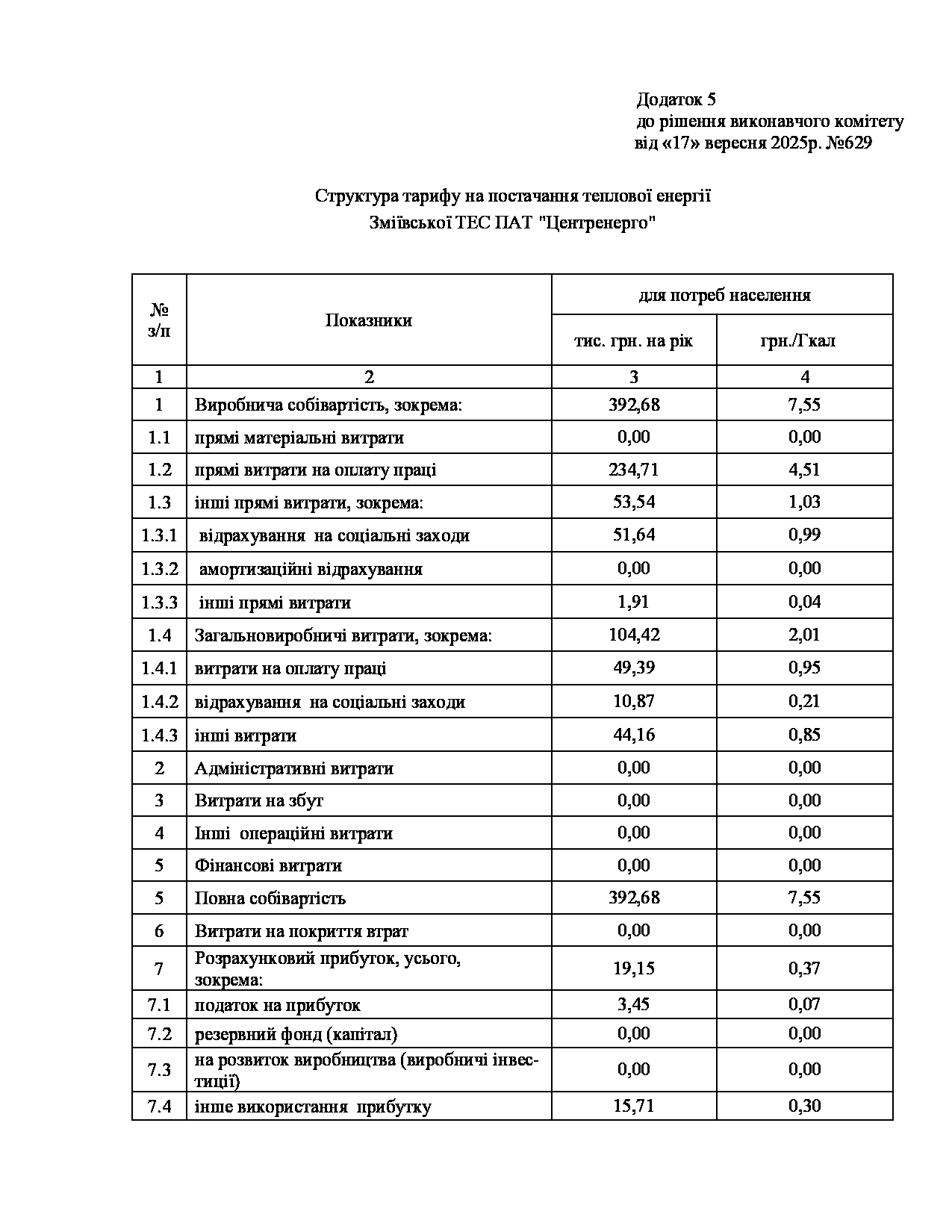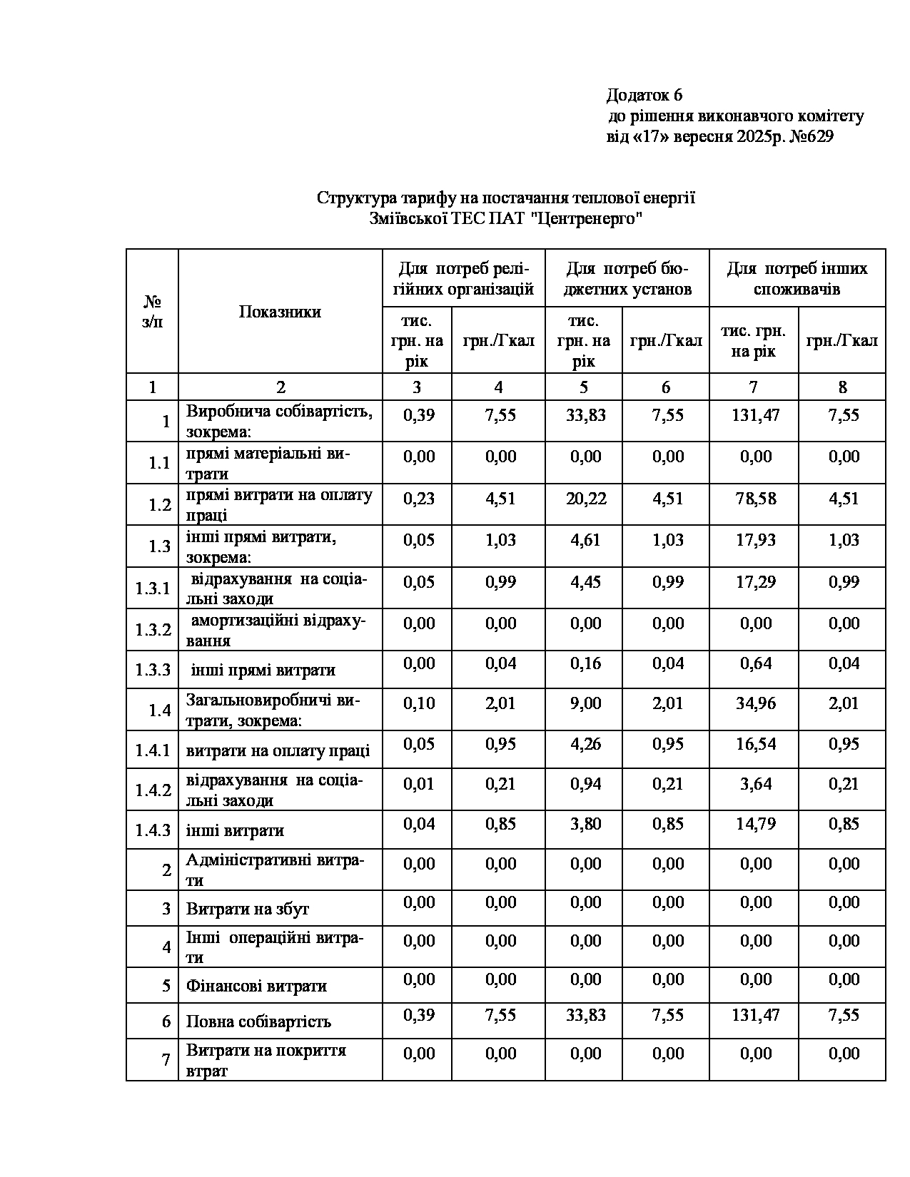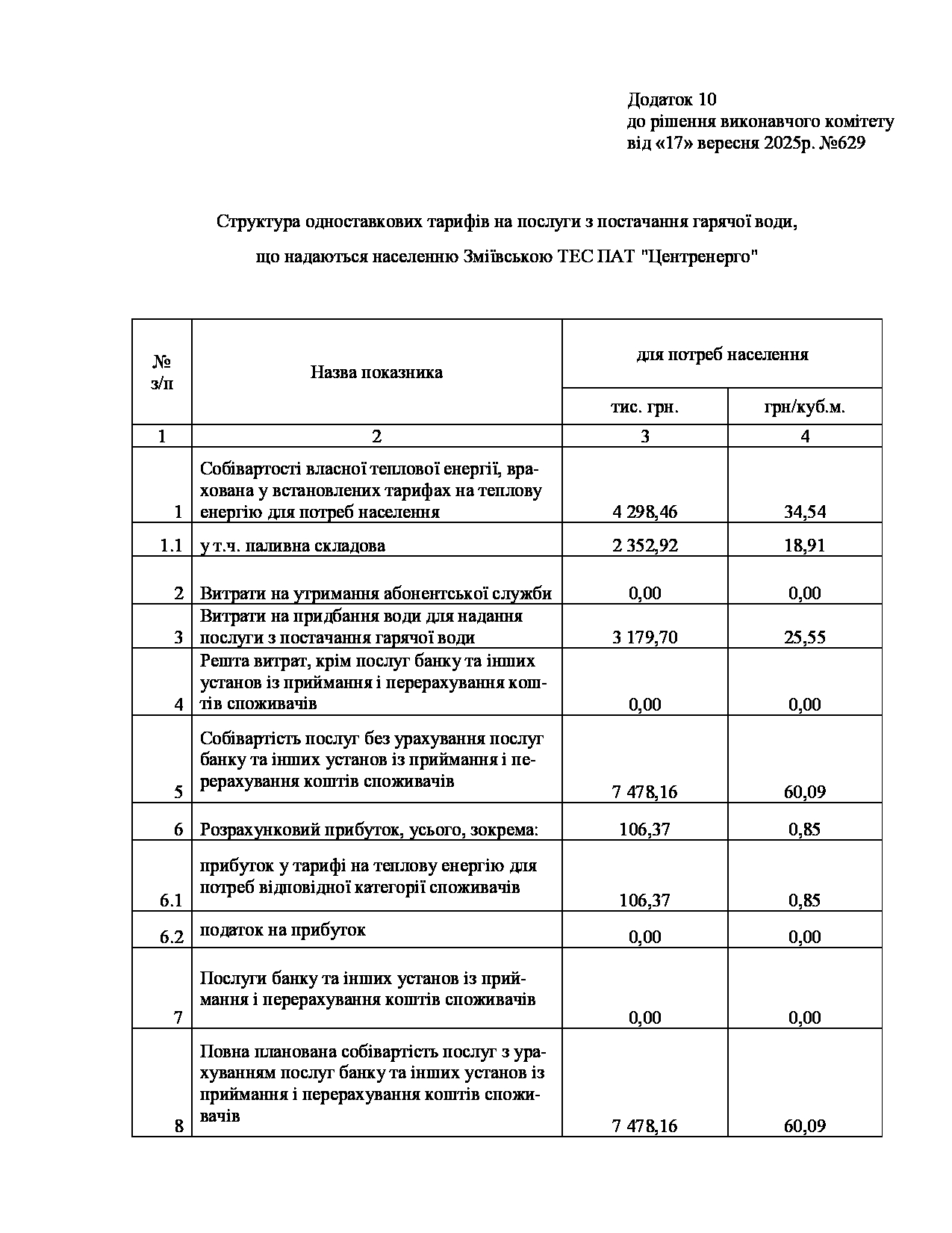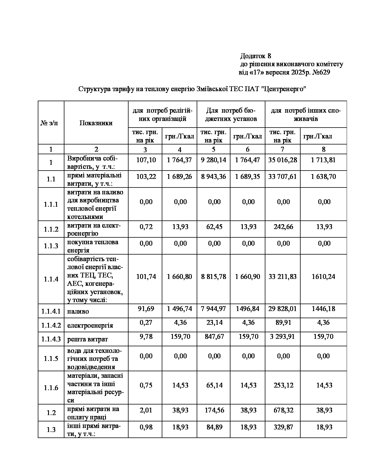 Рішення виконавчого комітету №629 Про встановлення Зміївській ТЕС ПАТ «Центренерго» тарифів на теплову енергію, її виробництво, транспортування, постачання та послуг з постачання теплової енергії і гарячої води